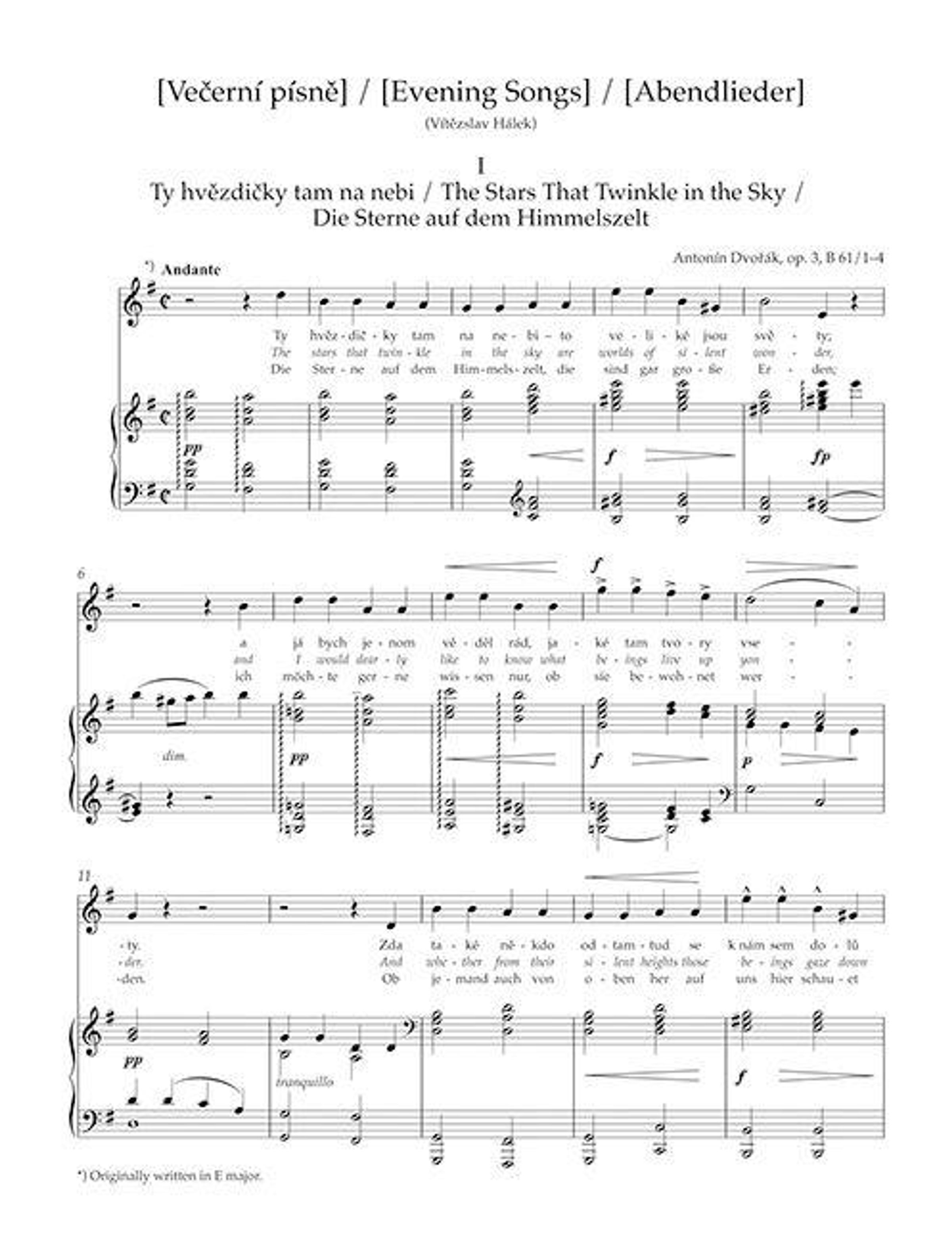 In diesem Band werden auch weniger bekannte Lieder des jungen Dvorák veröffentlicht, von denen die "Zwei Lieder für Bariton" aus dem Jahre 1865 hier zum ersten Mal erscheinen. Der Komponist schrieb sie nur wenige Monate nach den "Zypressen", seinem Erstlingswerk in diesem Genre. Elf Lieder des Zyklus "Abendlieder" sind zu Lebzeiten des Komponisten nach und nach bei verschiedenen Verlagen herausgekommen; das letzte, "So wie der Mond am Himmelszelt", ist nicht vollständig erhalten und wird daher hier als Anhang veröffentlicht. In seinen frühen Liedern vertonte der Komponist Texte der zu seiner Zeit führenden tschechischen Dichter, aber auch Volkspoesie.