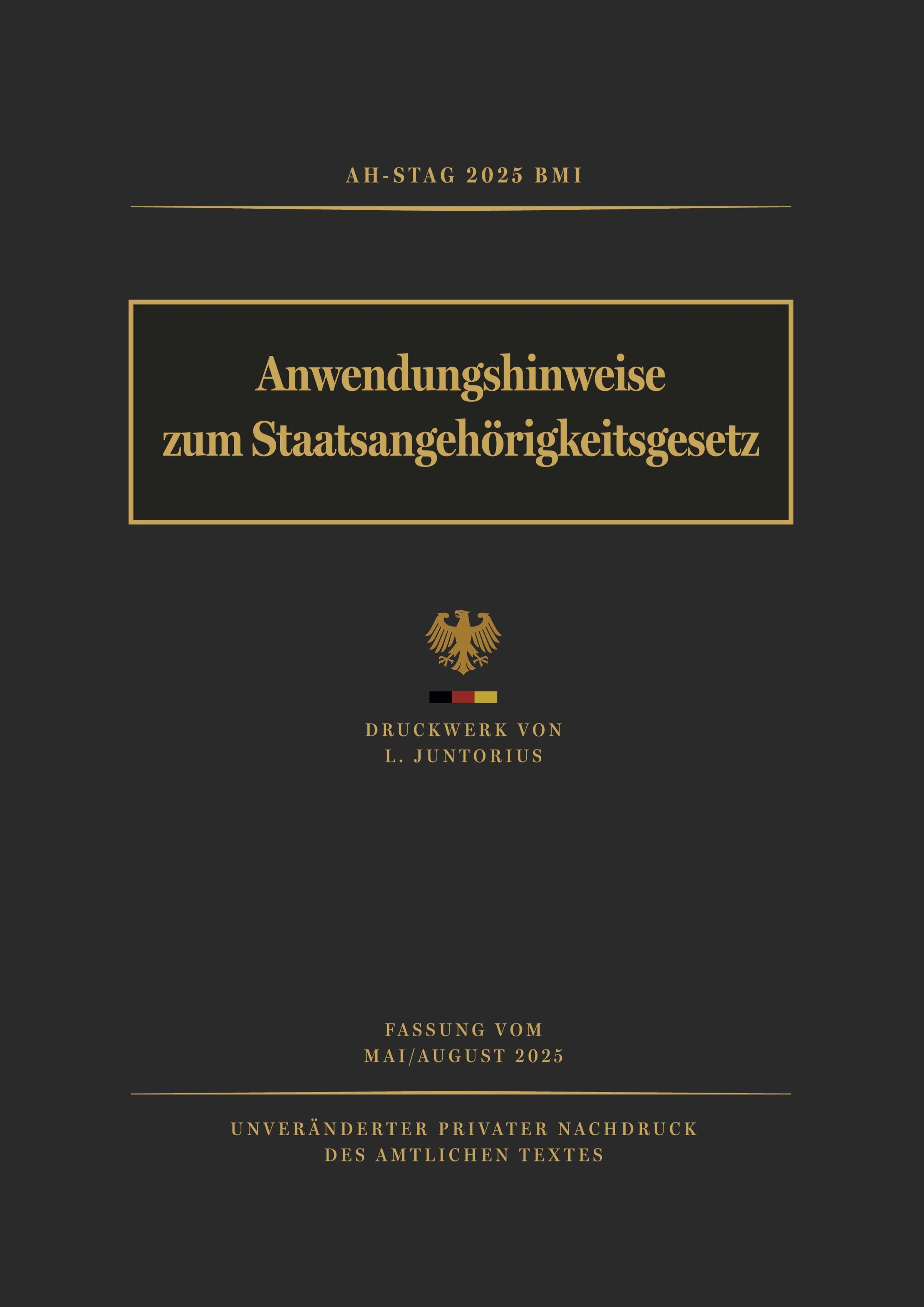 Die Anwendungshinweise zum Staatsangehörigkeitsgesetz (AH-StAG 2025) enthalten die amtlichen Empfehlungen des Bundesministeriums des Innern und für Heimat (BMI) zur Auslegung und Anwendung des Staatsangehörigkeitsrechts. Diese Ausgabe ist ein unveränderter privater Nachdruck der amtlichen Veröffentlichung in der Fassung Mai / August 2025.