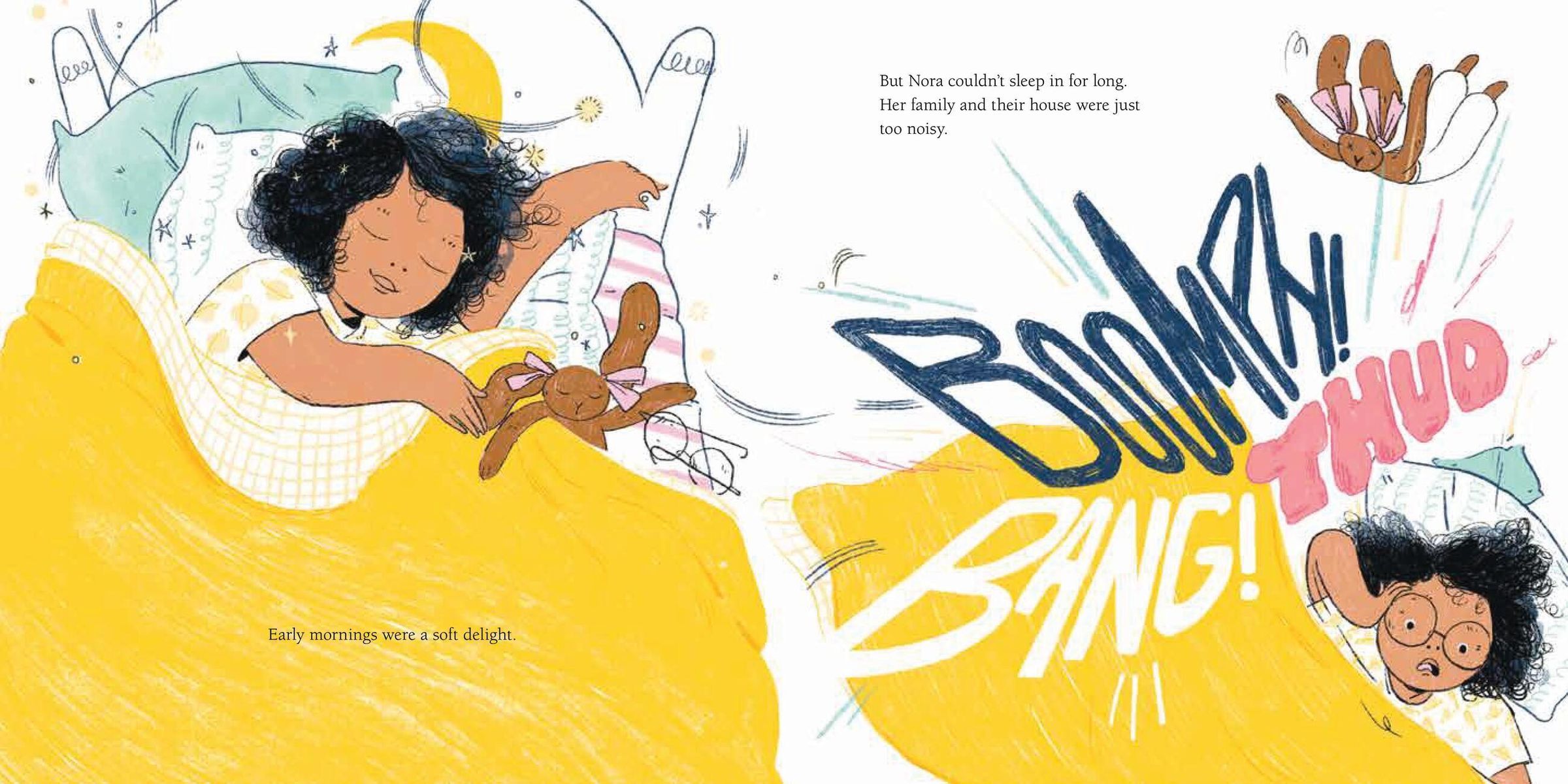 The daytime world is much too loud for Nora. At home, the vacuum vrooms, the television blares and her twin sisters make a racket. Life outside the house is no better, with children splashing around the pool, carts squeaking at the supermarket and cars honking in the street. But when nighttime arrives, Nora can escape to her room, where she finally gets to hear the gentle brushing of branches against her windowsill and the soothing sounds of her family from the other side of the house. For Nora, nighttime is perfectly delightful.
