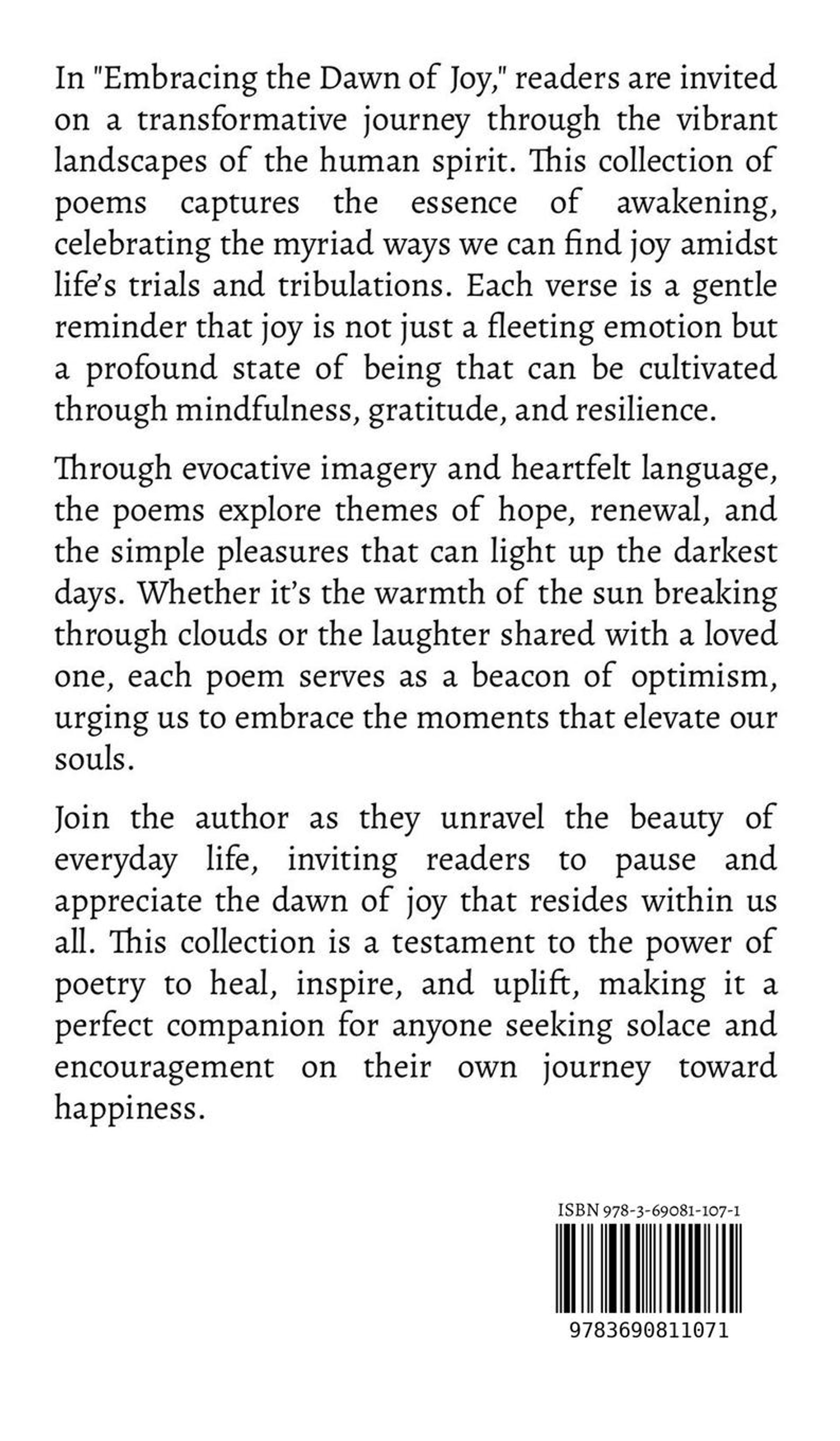 In "Embracing the Dawn of Joy," readers are invited on a transformative journey through the vibrant landscapes of the human spirit. This collection of poems captures the essence of awakening, celebrating the myriad ways we can find joy amidst life's trials and tribulations. Each verse is a gentle reminder that joy is not just a fleeting emotion but a profound state of being that can be cultivated through mindfulness, gratitude, and resilience. Through evocative imagery and heartfelt language, the poems explore themes of hope, renewal, and the simple pleasures that can light up the darkest days. Whether it's the warmth of the sun breaking through clouds or the laughter shared with a loved one, each poem serves as a beacon of optimism, urging us to embrace the moments that elevate our souls. Join the author as they unravel the beauty of everyday life, inviting readers to pause and appreciate the dawn of joy that resides within us all. This collection is a testament to the power of poetry to heal, inspire, and uplift, making it a perfect companion for anyone seeking solace and encouragement on their own journey toward happiness.