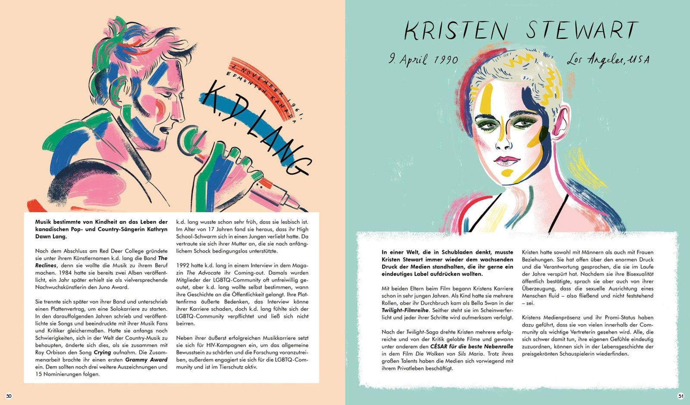 Ausdruckstarke Porträts von: Freddie Mercury, Frida Kahlo, Alan Turing, Michelangelo, Sappho, Audre Lorde, Manvendra Singh Gohil, Emma Gonzalez, James Baldwin, Leonardo da Vinci, Alexander Wang, Subhi Nahas, Tove Jansson, Martina Navratilova, Sia, Tim Cook, Pedro Almodovar, Virginia Woolf, Tschaikowsky, Vikram Seth, Yotam Ottolenghi, Johanna Sigurðardóttir, Marsha Johnson, Sylvia Rivera, David Bowie, Kasha Nabagsera, Lili Elbe, Matthew Borowski, Alvin Ailey, Harvey Milk, Willem Arondeus, Nergis Mavalvala, Rufus Wainwright, Marlene Dietrich, Didier Lestrade, Nabuko Yoshiya, Bayard Rustin, Claire Harvey, Barbara Jordan, Josephine Baker, k. d. Lang, Kristen Stewart, Jazz Jennings, Elio di Rupo, Oscar Wilde, Harish Iyer, Khalid Abdel-Hadi, Lana und Lilly Wachowski, Laith Ashley, Ellen DeGeneres und Portia de Rossi.