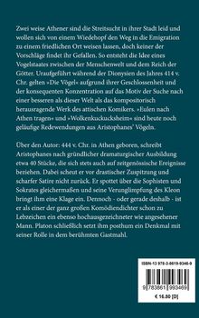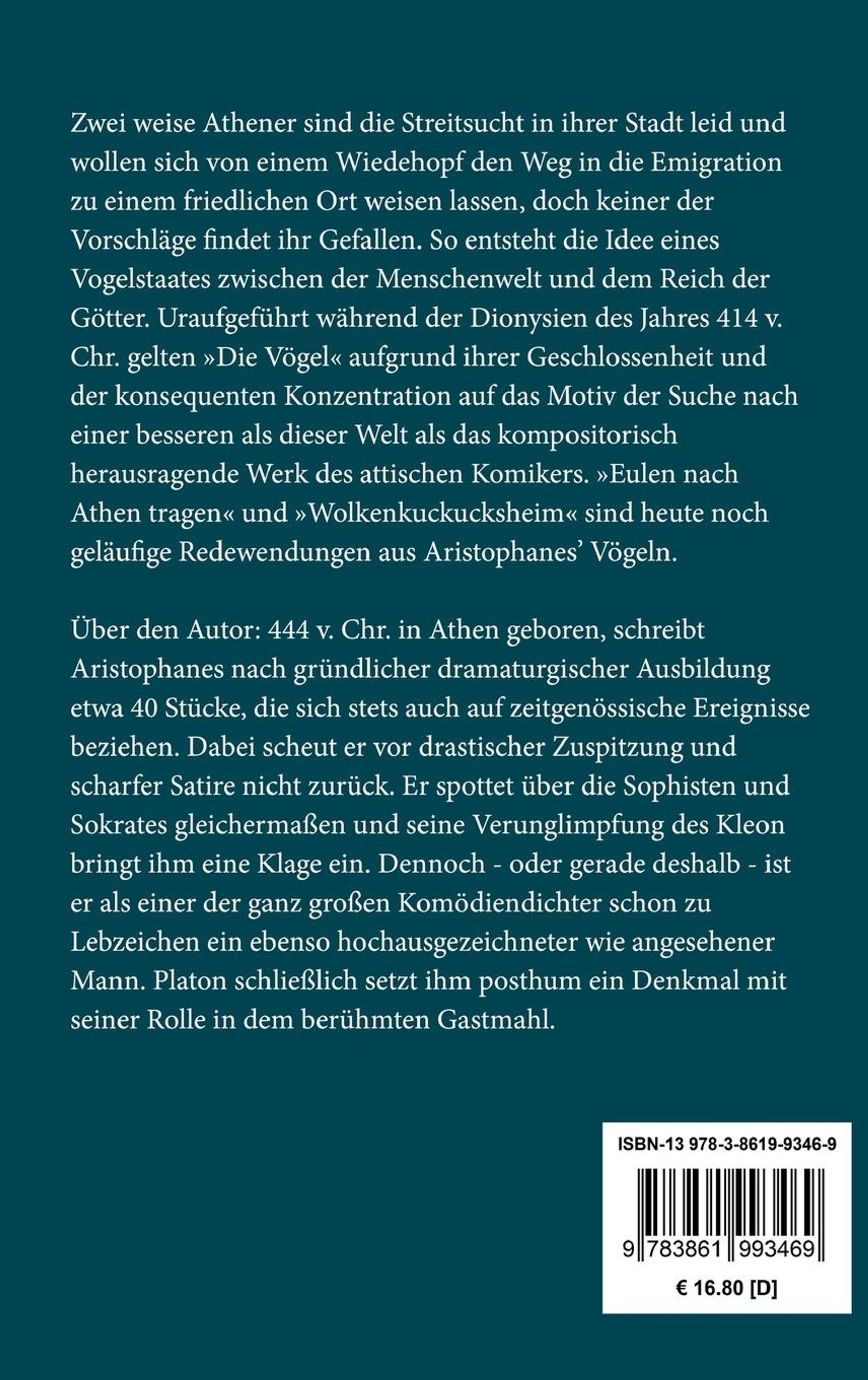 Zwei weise Athener sind die Streitsucht in ihrer Stadt leid und wollen sich von einem Wiedehopf den Weg in die Emigration zu einem friedlichen Ort weisen lassen, doch keiner der Vorschläge findet ihr Gefallen. So entsteht die Idee eines Vogelstaates zwischen der Menschenwelt und dem Reich der Götter. Uraufgeführt während der Dionysien des Jahres 414 v. Chr. gelten >>Die Vögel<< aufgrund ihrer Geschlossenheit und der konsequenten Konzentration auf das Motiv der Suche nach einer besseren als dieser Welt als das kompositorisch herausragende Werk des attischen Komikers. >>Eulen nach Athen tragen<< und >>Wolkenkuckucksheim<< sind heute noch geläufige Redewendungen aus Aristophanes' Vögeln.