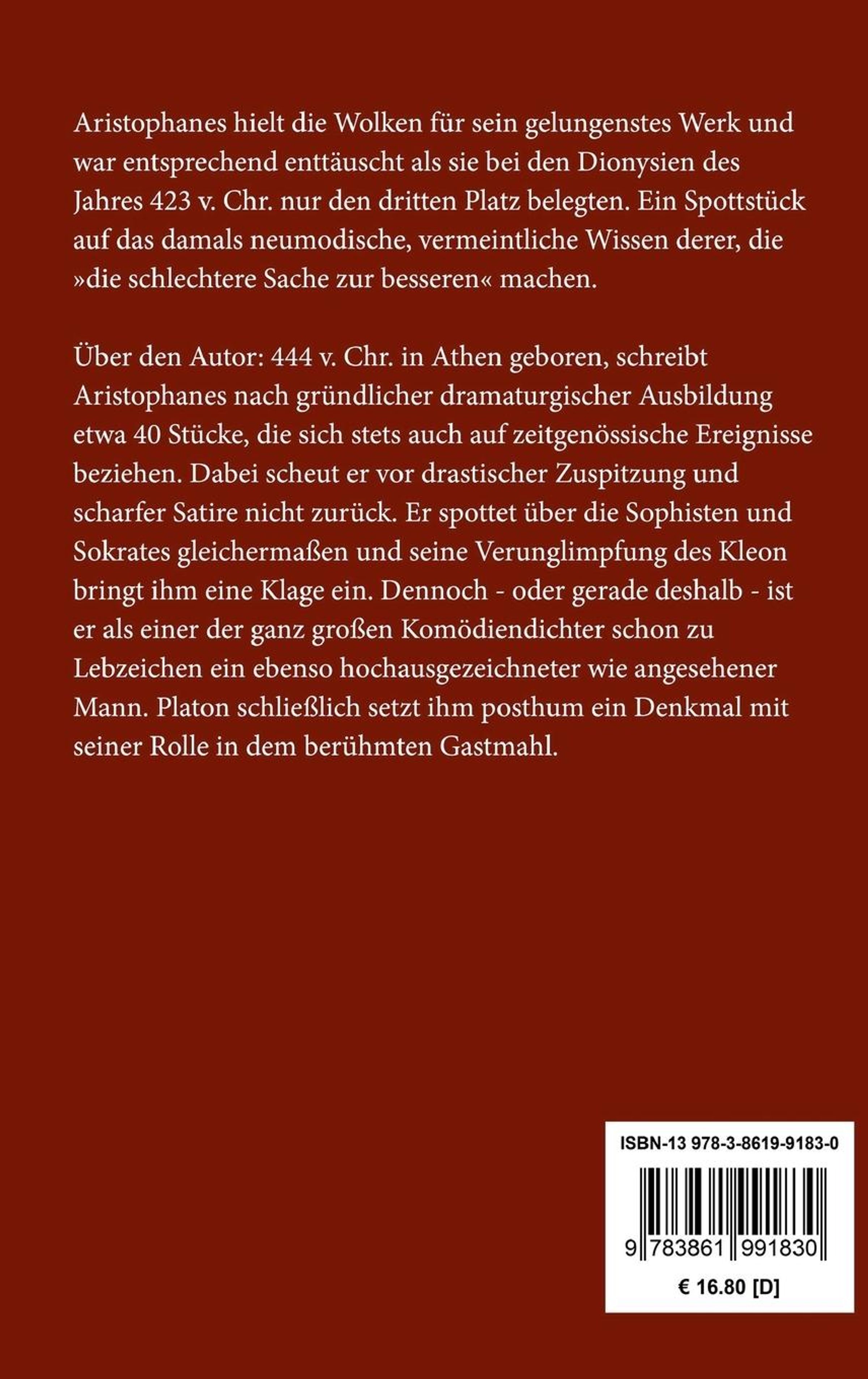 Aristophanes hielt die Wolken für sein gelungenstes Werk und war entsprechend enttäuscht als sie bei den Dionysien des Jahres 423 v. Chr. nur den dritten Platz belegten. Ein Spottstück auf das damals neumodische, vermeintliche Wissen derer, die >>die schlechtere Sache zur besseren<< machen.