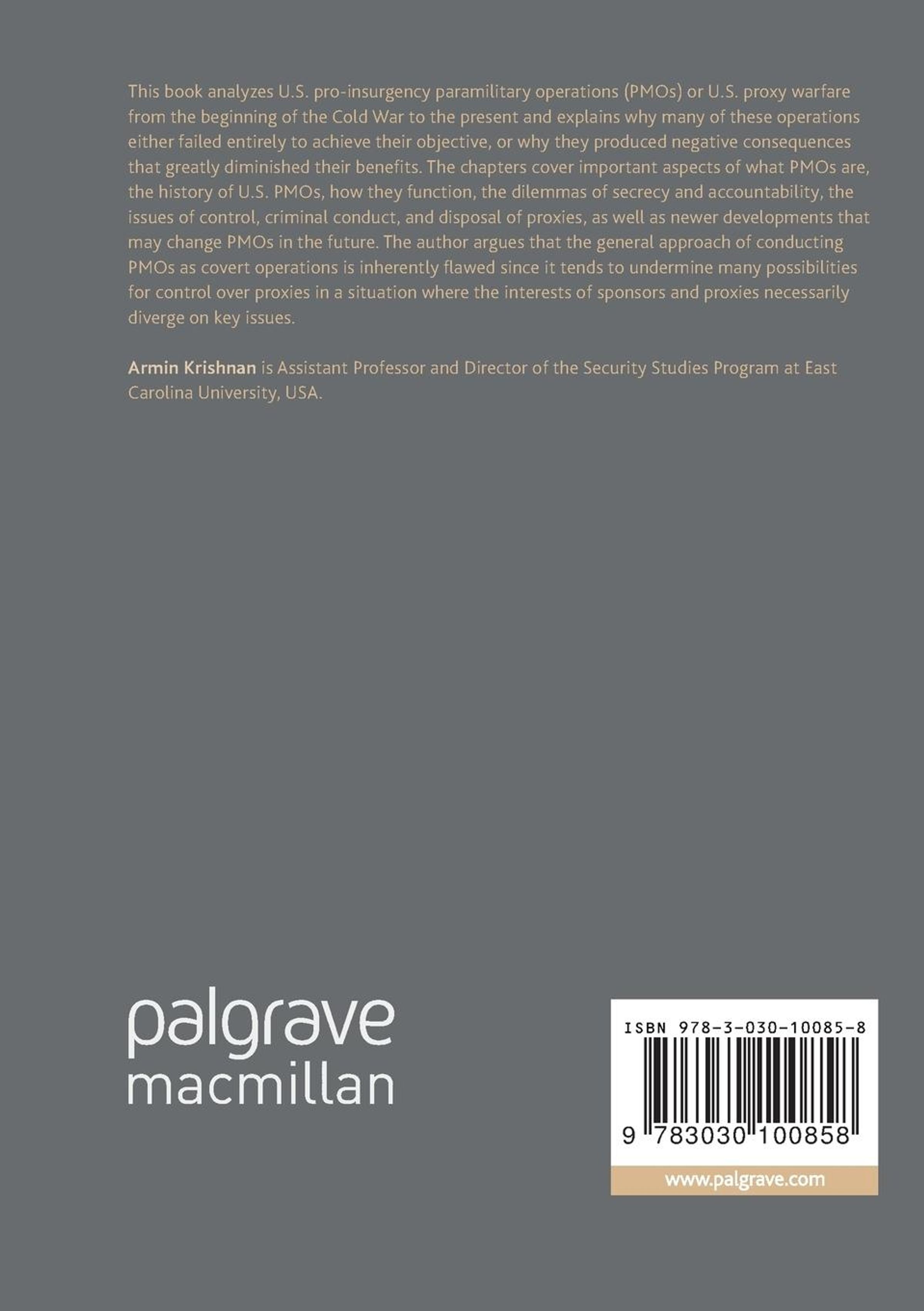 This book analyzes U. S. pro-insurgency paramilitary operations (PMOs) or U. S. proxy warfare from the beginning of the Cold War to the present and explains why many of these operations either failed entirely to achieve their objective, or why they produced negative consequences that greatly diminished their benefits. The chapters cover important aspects of what PMOs are, the history of U. S. PMOs, how they function, the dilemmas of secrecy and accountability, the issues of control, criminal conduct, and disposal of proxies, as well as newer developments that may change PMOs in the future. The author argues that the general approach of conducting PMOs as covert operations is inherently flawed since it tends to undermine many possibilities for control over proxies in a situation where the interests of sponsors and proxies necessarily diverge on key issues.