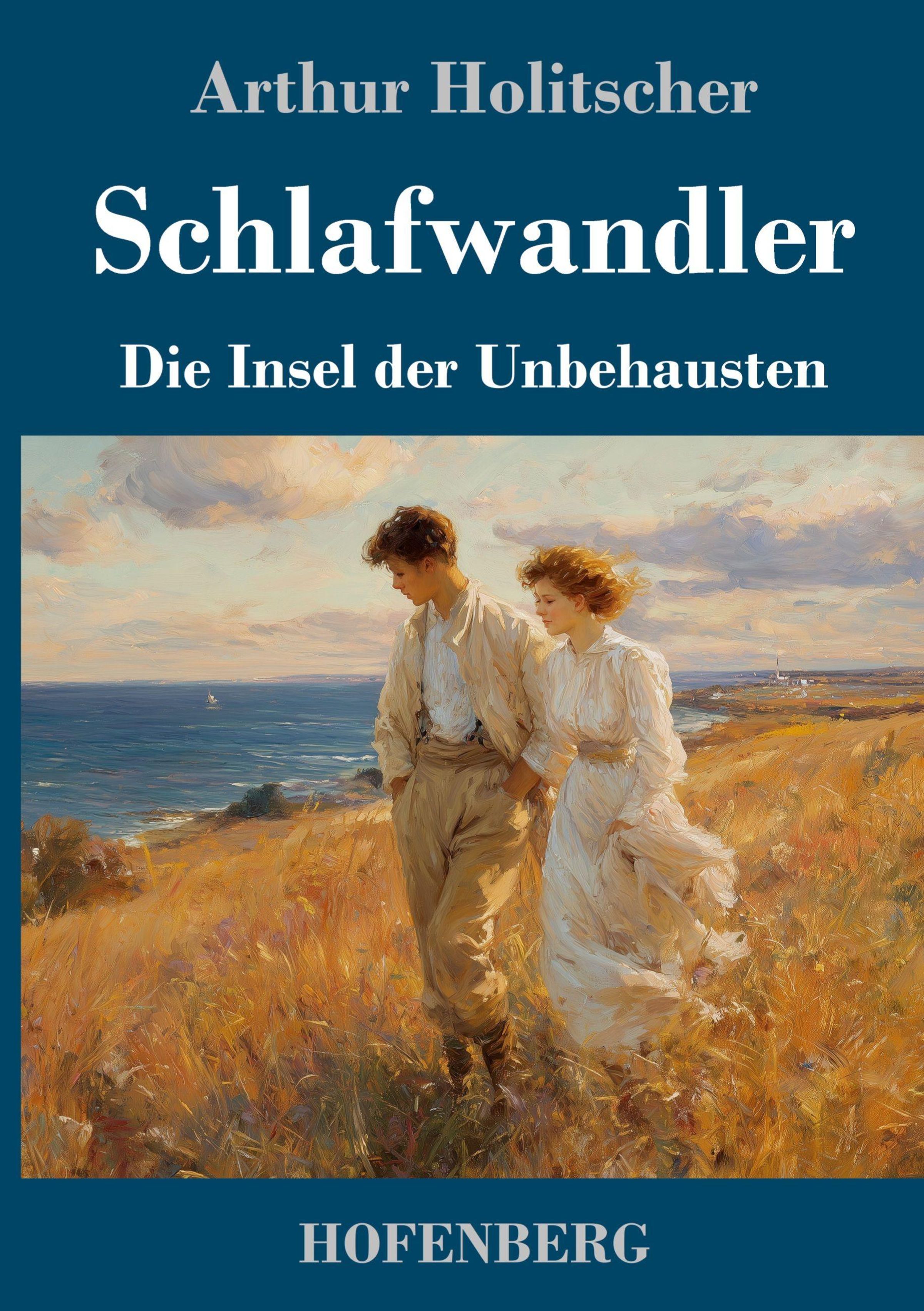 Buchtitel: "Schlafwandler: Die Insel der Unbehausten" von Arthur Holitscher. Ein Paar spaziert durch eine goldene Landschaft am Meer., Buch