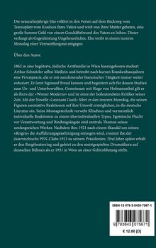 Arthur Schnitzler, geb. 15.5.1862 in Wien, versuchte bereits als Neunzehnjähriger seine ersten Dramen zu schreiben. Nach dem Studium der Medizin war er Assistenzarzt an der Allgemeinen Poliklinik und dann praktischer Arzt in Wien, bis er sich mehr und mehr seinen literarischen Arbeiten widmete. 1886 erscheinen die ersten Veröffentlichungen in Zeitungen, 1895 das erste Buch. Bei Arthur Schnitzler bildet stets der einzelne Mensch den Mittelpunkt seiner durchweg im Wien der Jahrhundertwende angesiedelten Stoffe. Er starb am 21.10.1931 als einer der bedeutendsten österreichischen Erzähler und Dramatiker der Gegenwart in Wien.Anmerkungen: