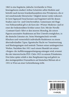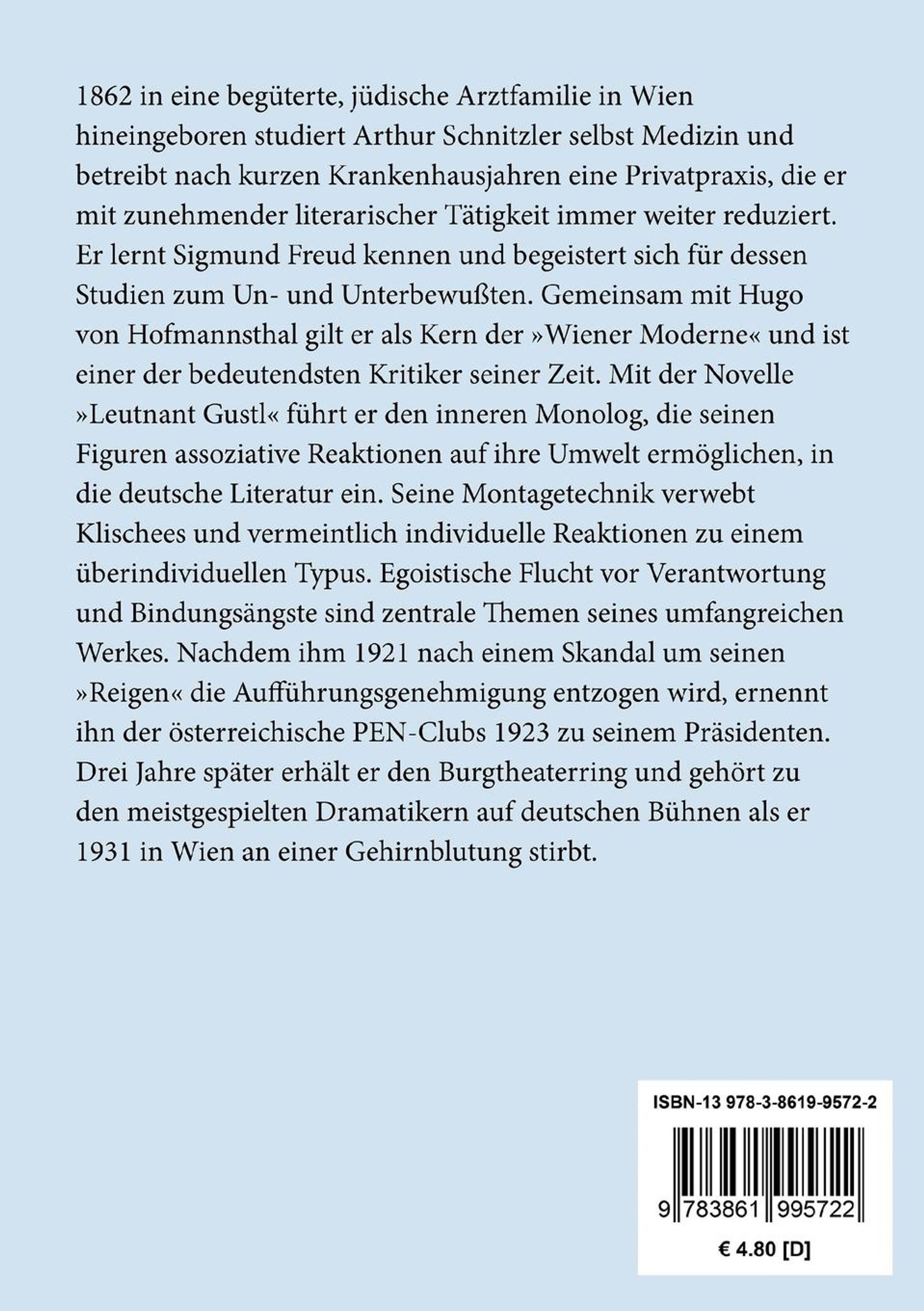 Arthur Schnitzler, geb. 15.5.1862 in Wien, versuchte bereits als Neunzehnjähriger seine ersten Dramen zu schreiben. Nach dem Studium der Medizin war er Assistenzarzt an der Allgemeinen Poliklinik und dann praktischer Arzt in Wien, bis er sich mehr und mehr seinen literarischen Arbeiten widmete. 1886 erscheinen die ersten Veröffentlichungen in Zeitungen, 1895 das erste Buch. Bei Arthur Schnitzler bildet stets der einzelne Mensch den Mittelpunkt seiner durchweg im Wien der Jahrhundertwende angesiedelten Stoffe. Er starb am 21.10.1931 als einer der bedeutendsten österreichischen Erzähler und Dramatiker der Gegenwart in Wien.Anmerkungen: