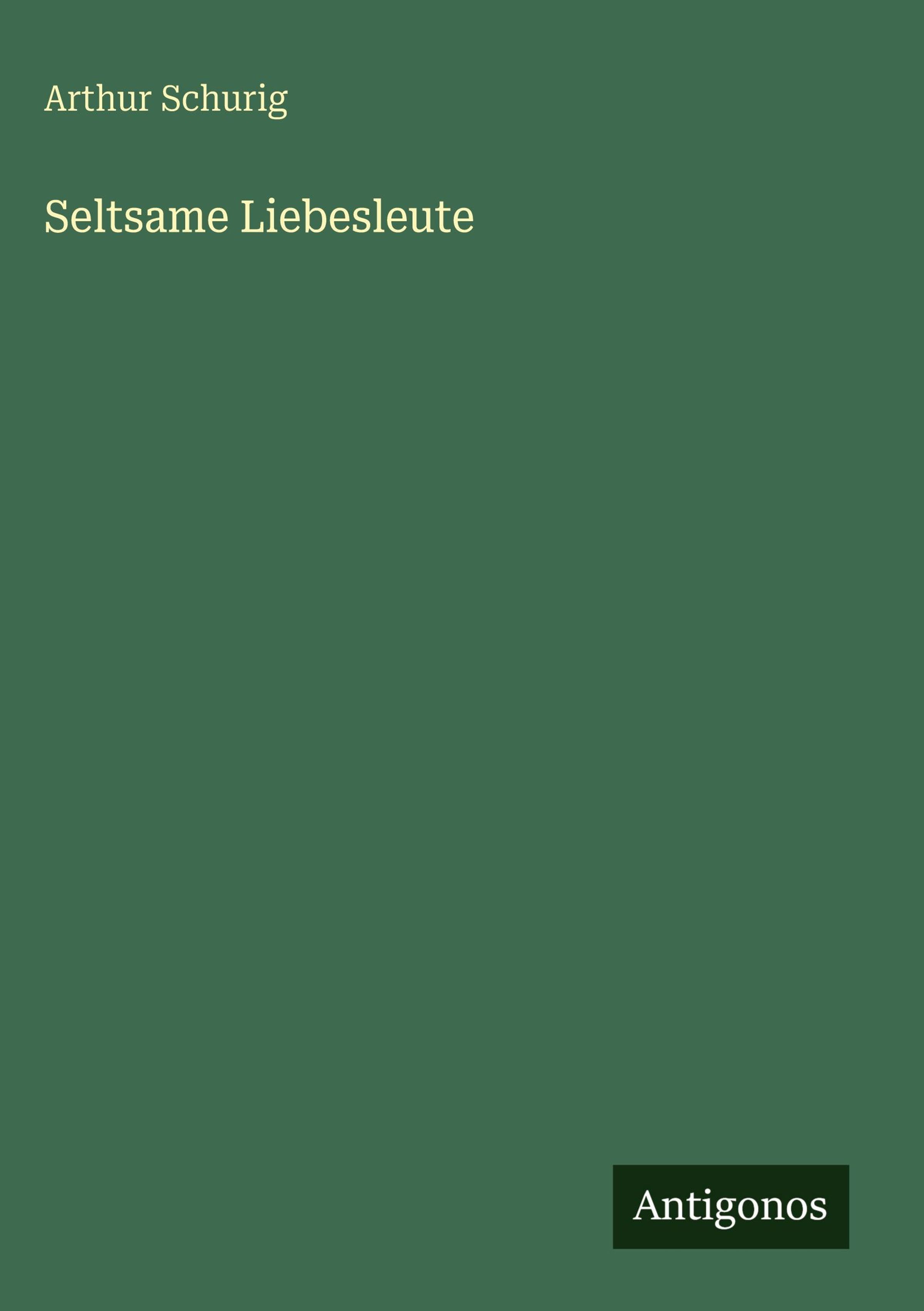"Arthur Schurig, Seltsame Liebesleute." Unten rechts ist ein kleines Logo mit der Aufschrift "Antigonos". Hintergrund in Dunkelgrün., Buch