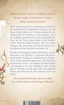 Der packende, groß angelegte Ensembleroman der Bestsellerautorin nimmt uns als erster Roman überhaupt mit auf den spannenden Bau des so faszinierenden, wie beindruckenden Freiburger Münsters. Es hat das Angesicht Freiburgs für immer verändert und gilt als eines der Meisterwerke der Gotik: <<Der schönste Turm auf Erden>>. Der sechzig Jahre andauernde Turmbau brachte Reichtum und Verderben, stiftete Liebe und besiegelte Schicksale. Episch und bewegend erzählt Fritz, wie die Menschen von Freiburg - protzende Grafen, aufstrebende Kaufleute, machtbewusste Kirchenleute, leidenschaftliche Baumeister, ihre Familien und gemeine Leute - im Schatten des Baus lebten, hassten, kämpften, um schließlich nach sechzig Jahren im Jahr 1330 glorreich zu triumphieren.