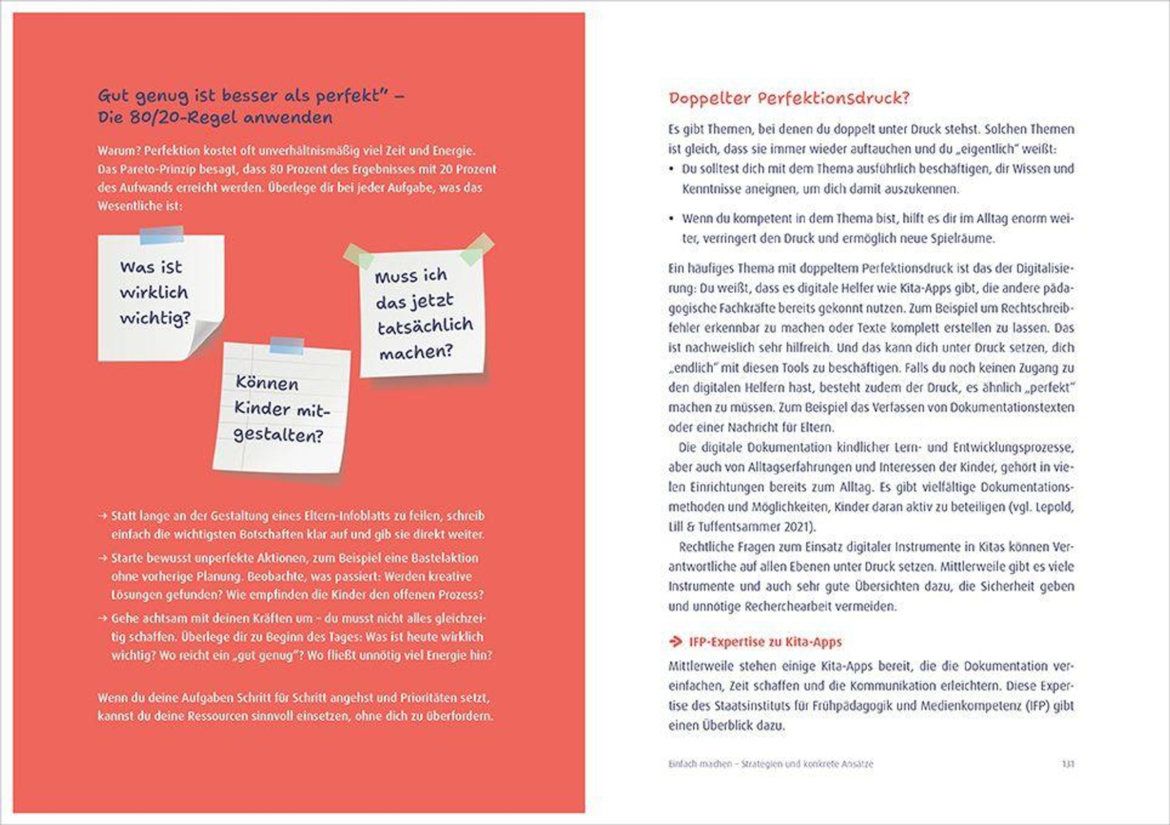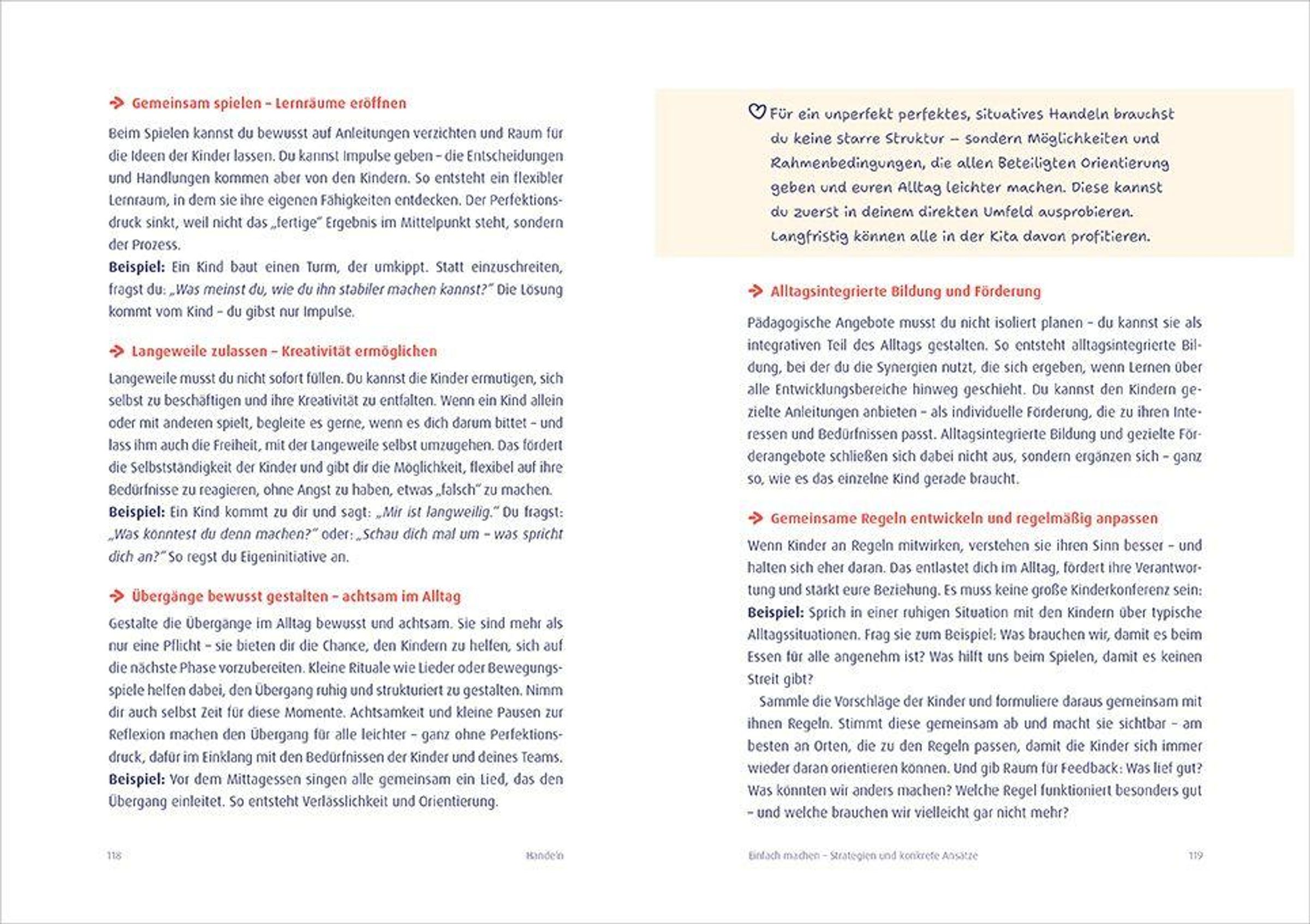 Kitas haben heute einen umfassenden Bildungs- und Förderungsauftrag: Aufgaben wie - Beobachtung und Dokumentation, Projektplanung sowie vielfältige Herausforderungen können mitunter einen hohen Druck erzeugen. Dieses Buch ermutigt pädagogische Fachkräfte, sich vor allem in Zeiten des Ressourcenmangels - auf das Wesentliche im Beruf zu fokussieren: die Beziehungsgestaltung zu Kindern und ihren Familien und damit die Sicherstellung des Kindeswohls! Anhand zahlreicher Beispiele und Reflexionsübungen zeigen die Autor: innen, wie Fachkräfte im turbulenten Kita-Alltag ihre Handlungsspielräume erkennen und nutzen und den Bildungsauftrag umsetzen - professionell und trotzdem gelassen.
