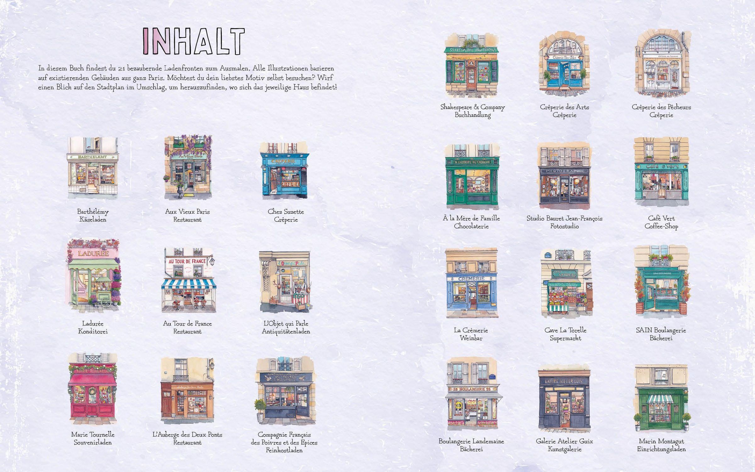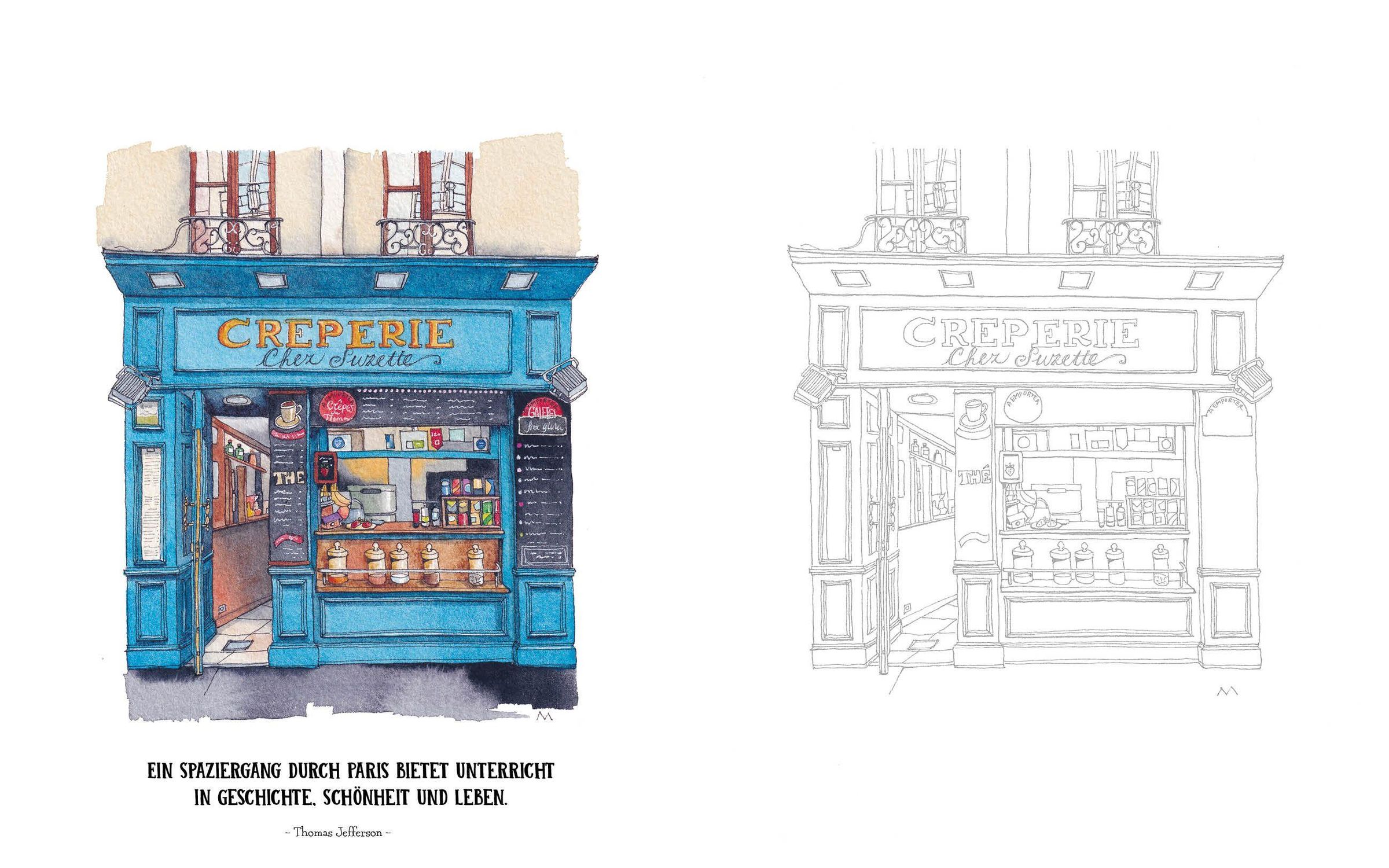 - 21 Häuserfronten aus dem Sehnsuchtsort Paris zum Ausmalen und Wegträumen - süße Cafés, niedliche Läden und verspielte Fassaden