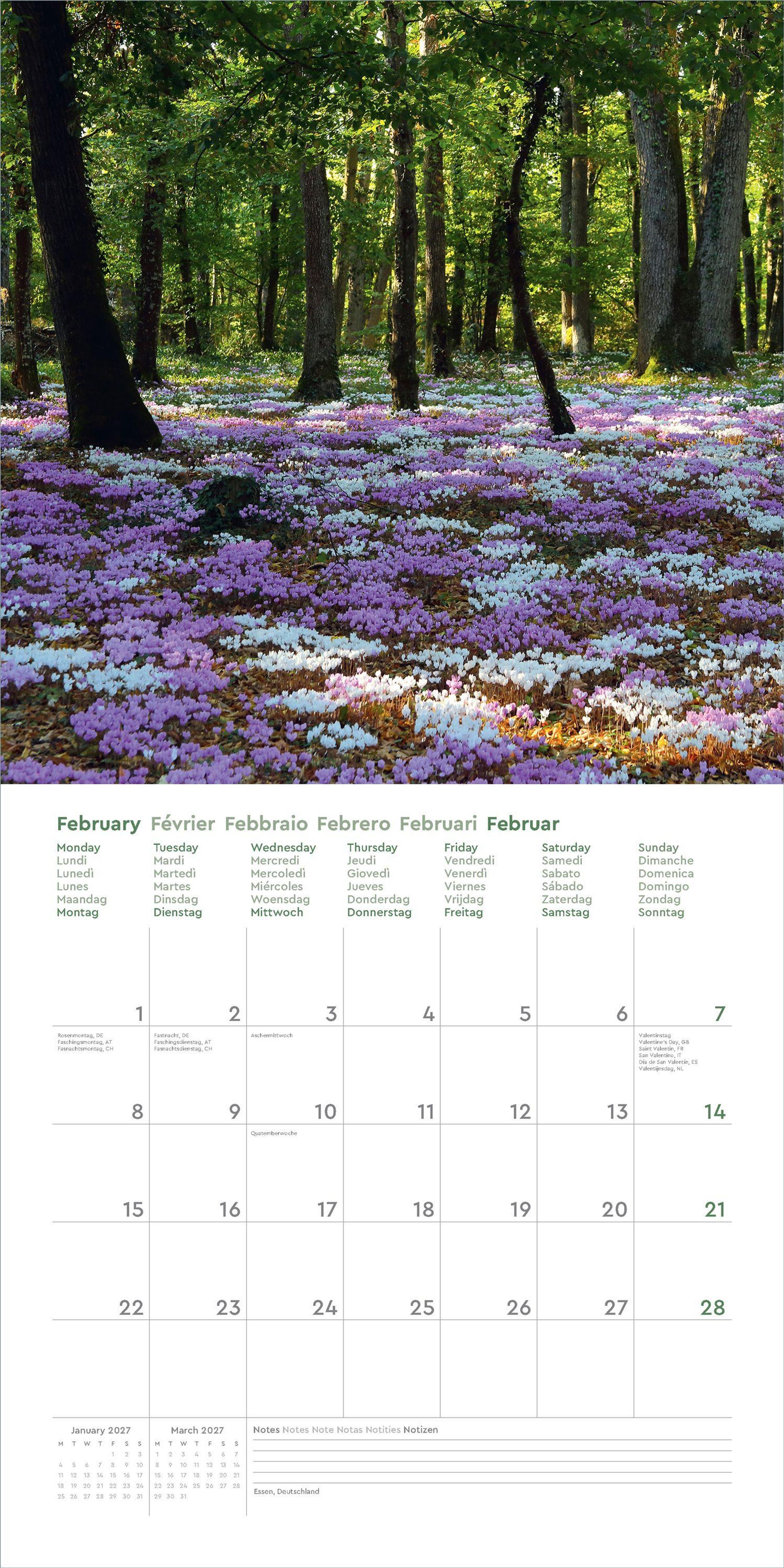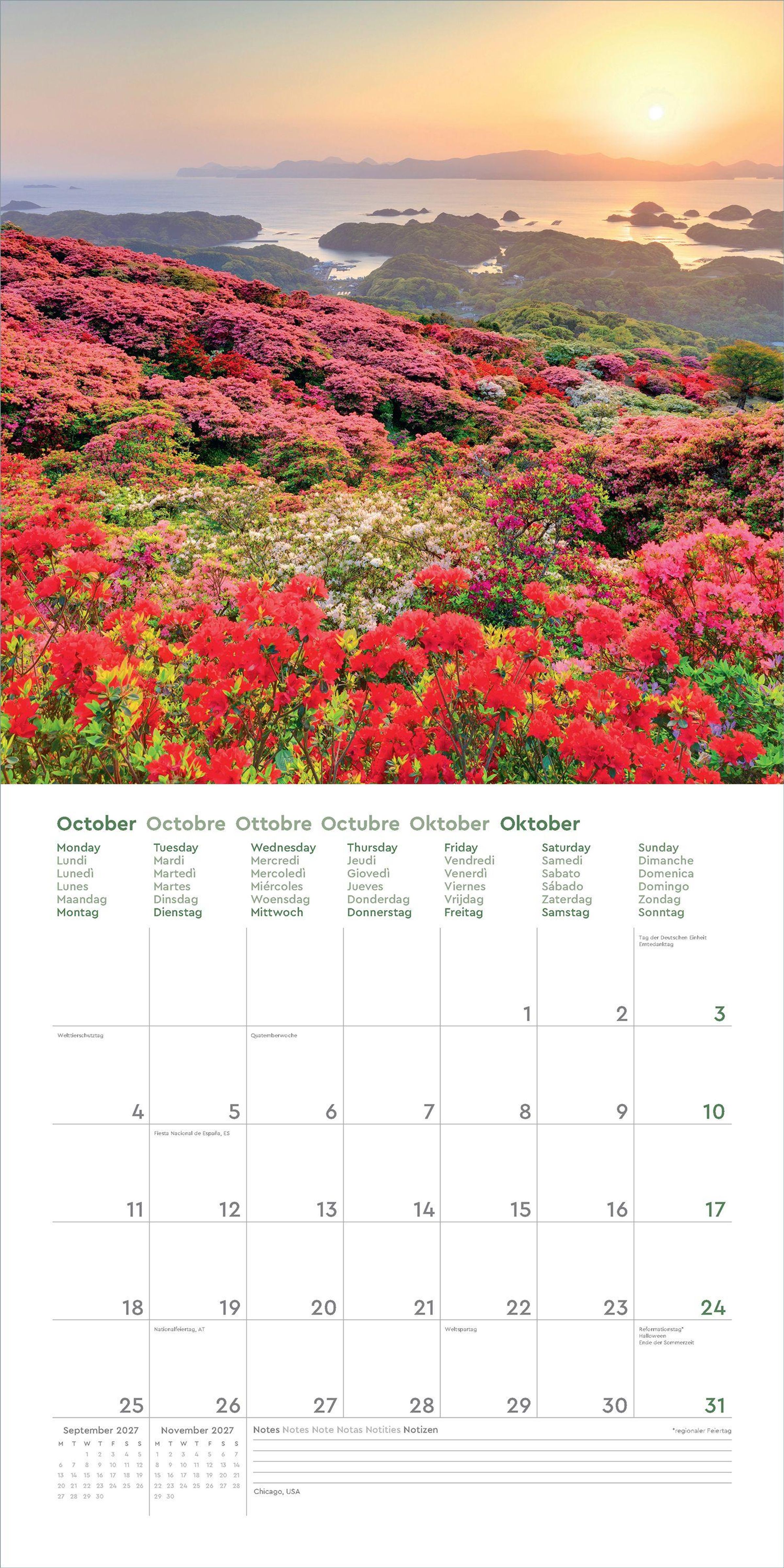 Dieser KUNTH Wandkalender "Aufgeblüht" 2027 begleitet mit zwölf traumhaften Aufnahmen durch das ganze Jahr. Von Rot bis Rosa, von Gelb bis Violett - die aufblühende Natur zeigt sich gern in den prächtigsten Farben. Der Kalender schwelgt in dieser bunten Vielfalt blühender Landschaften in den Bergen, an Küsten, in den Städten oder auf dem Land rund um die Welt.