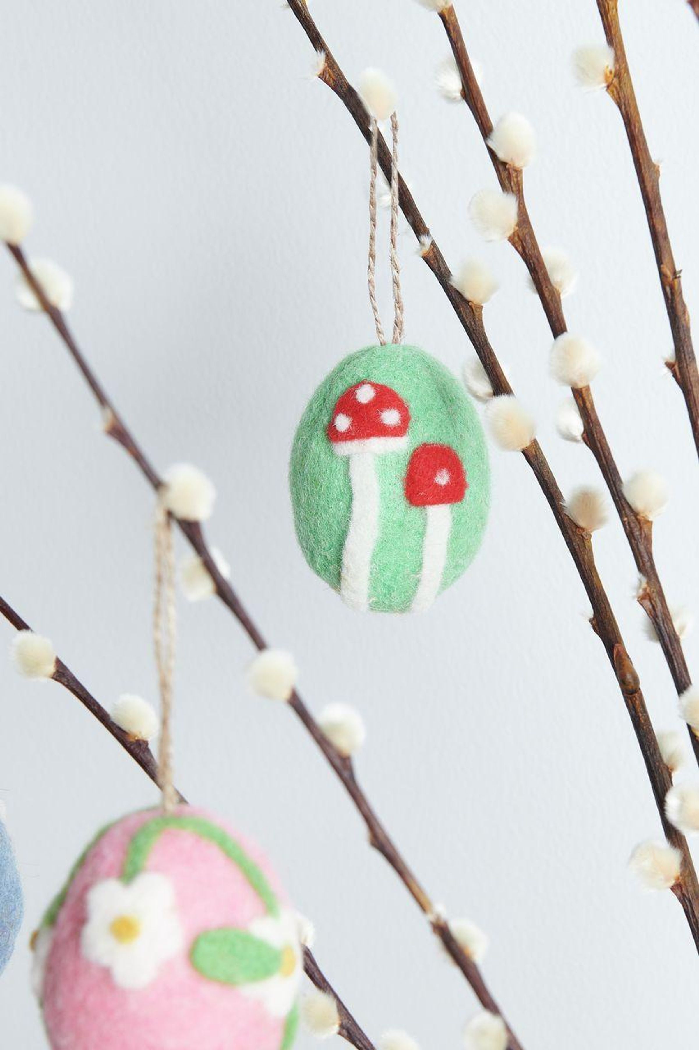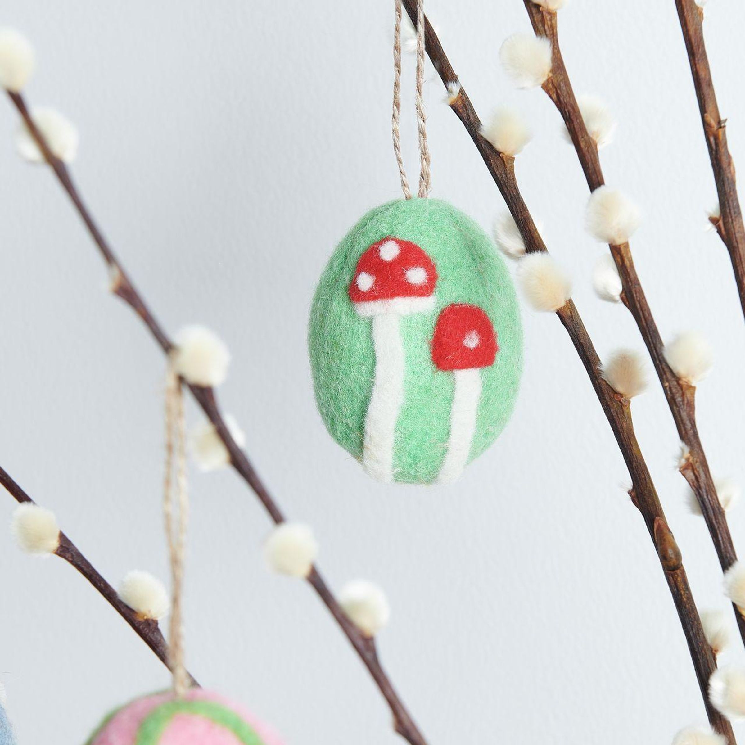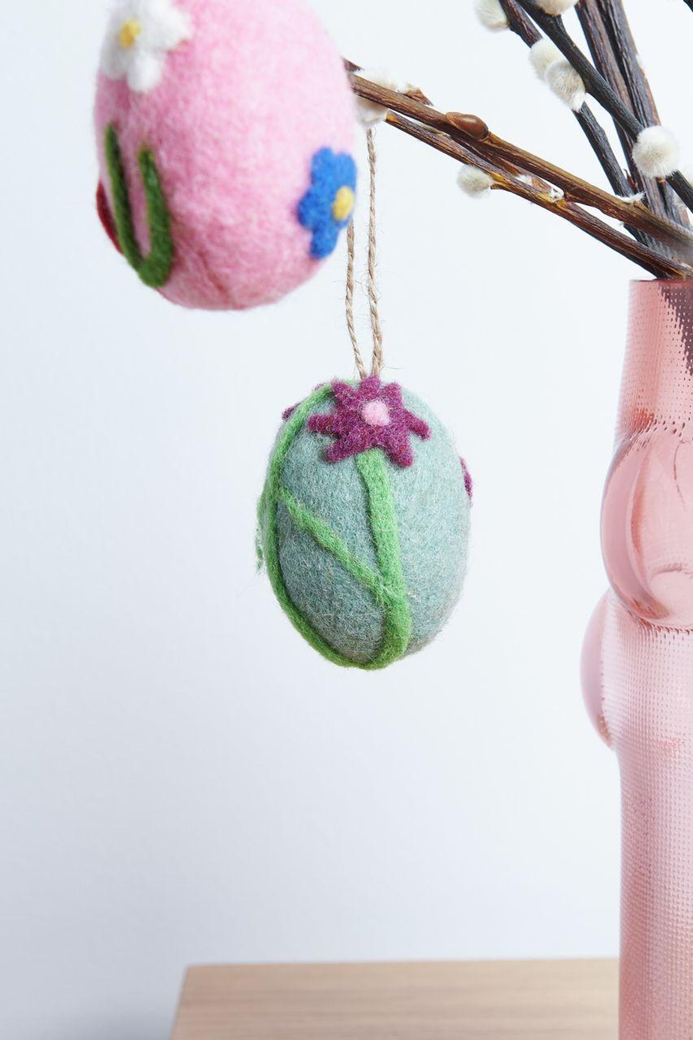 Der handgefilzte Aufhänger in Ei-Form mit einer purpurfarbenen Blume ist ein dekoratives Detail für Frühlings- und Osterarrangements. Gefertigt aus 100 % Wolle besticht er durch seine natürliche Optik und feine handwerkliche Verarbeitung. Ideal zum Aufhängen an Zweigen, Kränzen oder als Teil einer liebevoll gestalteten Tischdekoration.