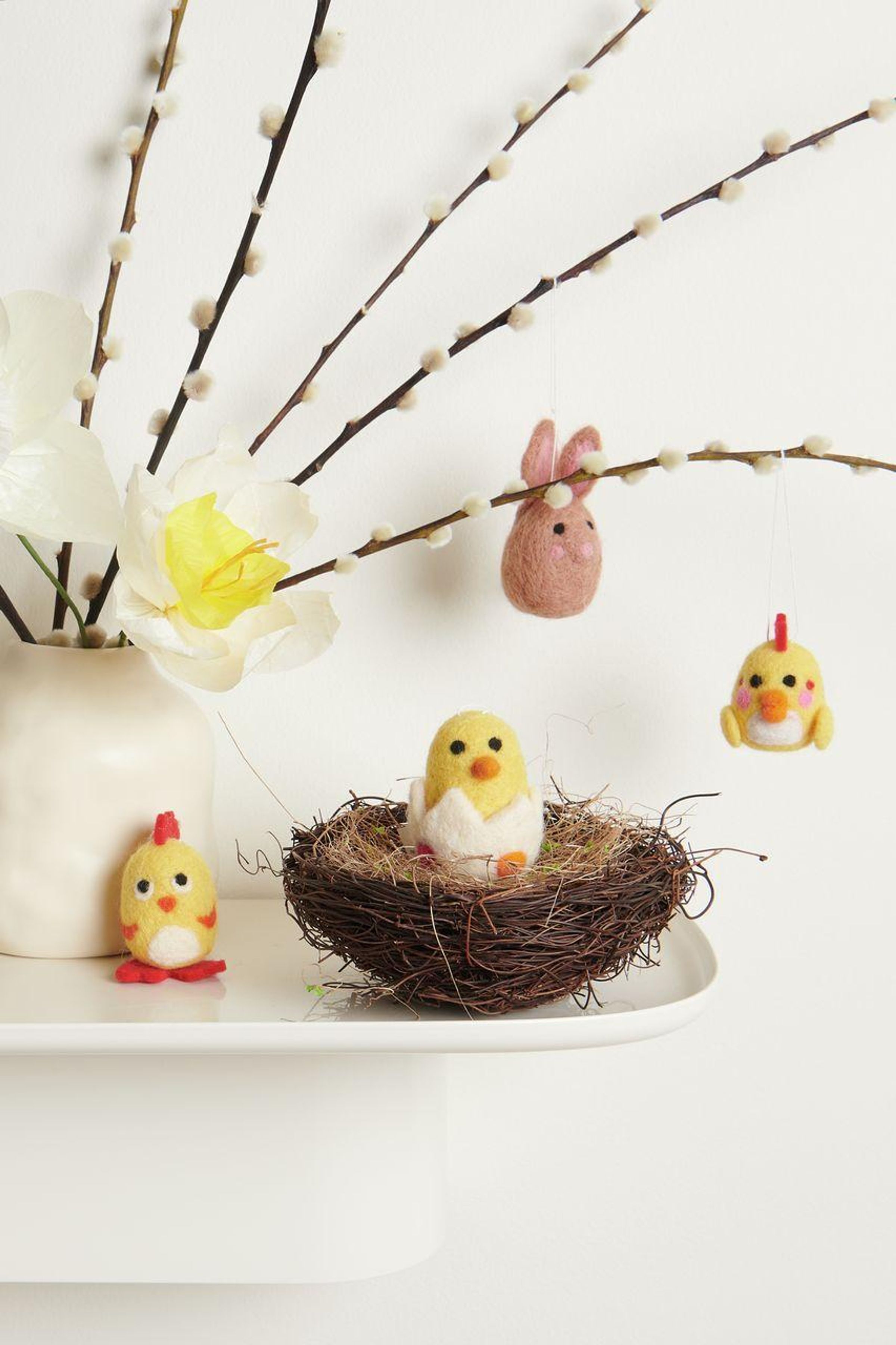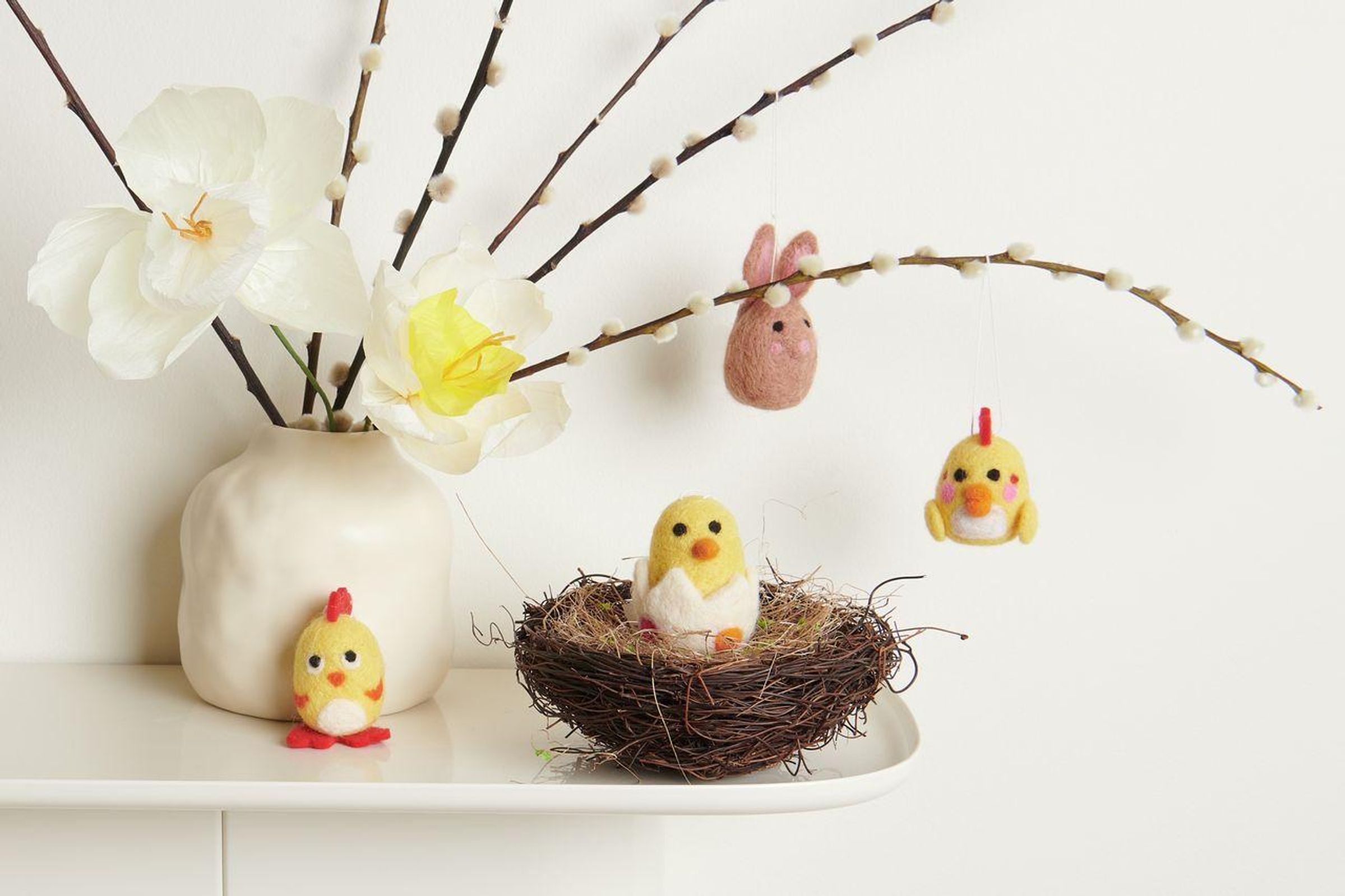 Das Filz-Aufhänger-Set mit vier liebevoll handgefilzten Osterfiguren sorgt für eine natürliche und fröhliche Dekoration. Die Figuren bestehen aus einer hochwertigen Woll-Polyester-Mischung und überzeugen durch ihre weiche Haptik und detailreiche Gestaltung. Ob am Osterstrauch, Fenster oder Geschenkanhänger - die 3D-Figuren setzen überall einen charmanten Akzent.