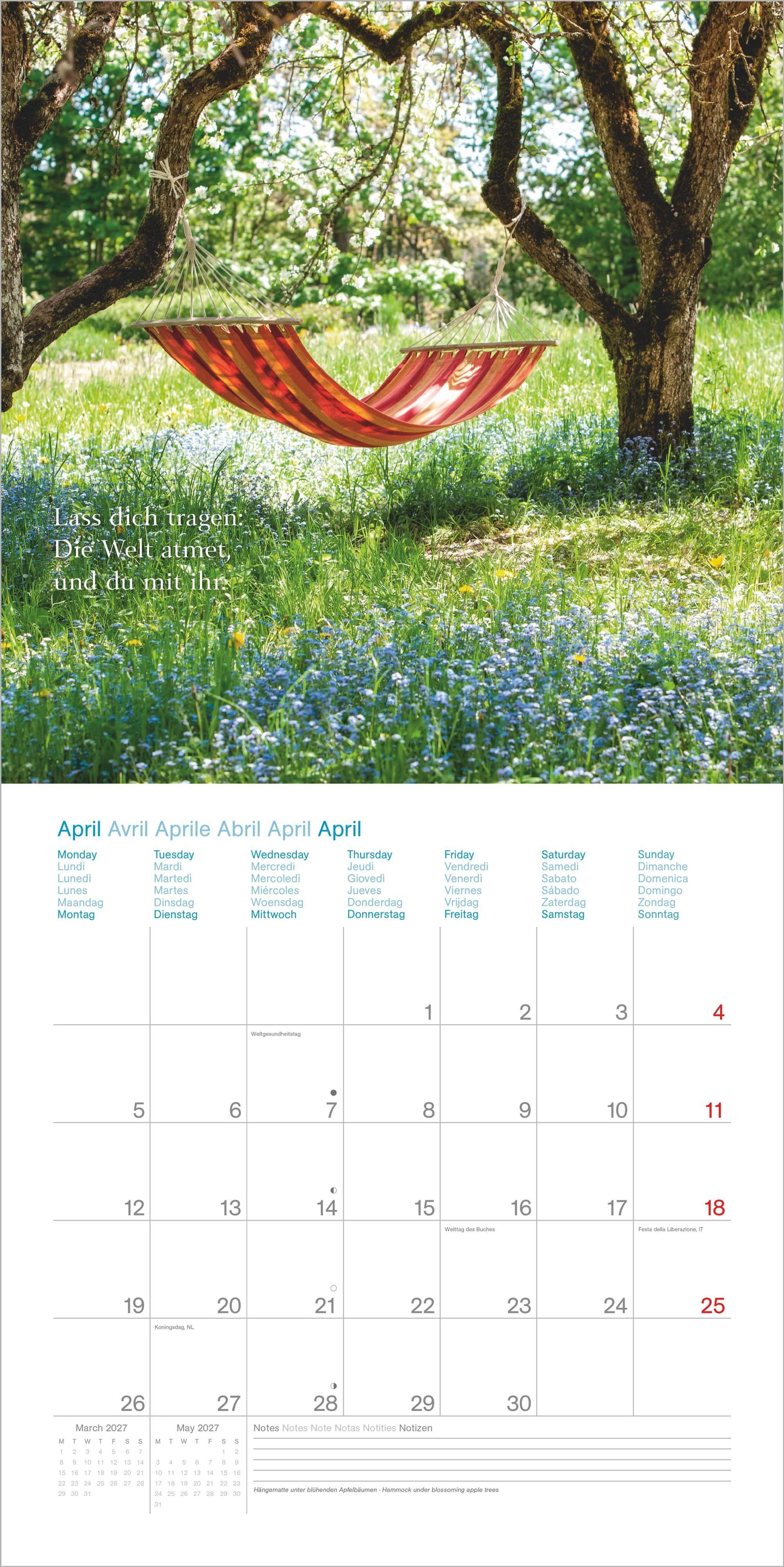 Der „Augenblicke für Dich" Kalender 2027 ist mehr als nur ein Kalender -- er ist eine Quelle der Inspiration und schenkt Ihnen das ganze Jahr über positive Energie und Momente des Glücks.