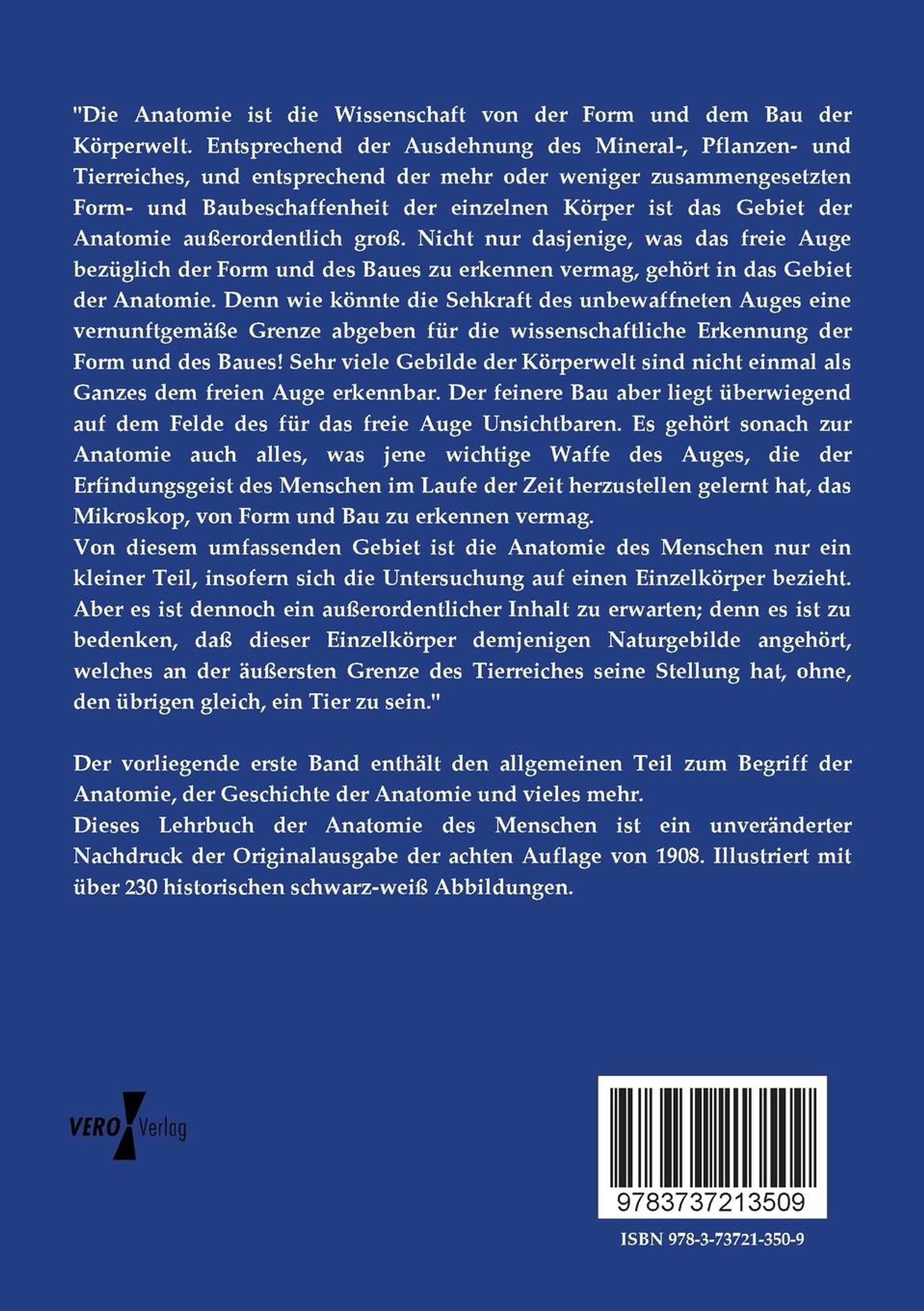 \"Die Anatomie ist die Wissenschaft von der Form und dem Bau der Körperwelt. Entsprechend der Ausdehnung des Mineral-, Pflanzen- und Tierreiches, und entsprechend der mehr oder weniger zusammengesetzten Form- und Baubeschaffenheit der einzelnen Körper ist das Gebiet der Anatomie außerordentlich groß. Nicht nur dasjenige, was das freie Auge bezüglich der Form und des Baues zu erkennen vermag, gehört in das Gebiet der Anatomie. Denn wie könnte die Sehkraft des unbewaffneten Auges eine vernunftgemäße Grenze abgeben für die wissenschaftliche Erkennung der Form und des Baues! Sehr viele Gebilde der Körperwelt sind nicht einmal als Ganzes dem freien Auge erkennbar. Der feinere Bau aber liegt überwiegend auf dem Felde des für das freie Auge Unsichtbaren. Es gehört sonach zur Anatomie auch alles, was jene wichtige Waffe des Auges, die der Erfindungsgeist des Menschen im Laufe der Zeit herzustellen gelernt hat, das Mikroskop, von Form und Bau zu erkennen vermag. Von diesem umfassenden Gebiet ist die Anatomie des Menschen nur ein kleiner Teil, insofern sich die Untersuchung auf einen Einzelkörper bezieht. Aber es ist dennoch ein außerordentlicher Inhalt zu erwarten; denn es ist zu bedenken, daß dieser Einzelkörper demjenigen Naturgebilde angehört, welches an der äußersten Grenze des Tierreiches seine Stellung hat, ohne, den übrigen gleich, ein Tier zu sein.\"