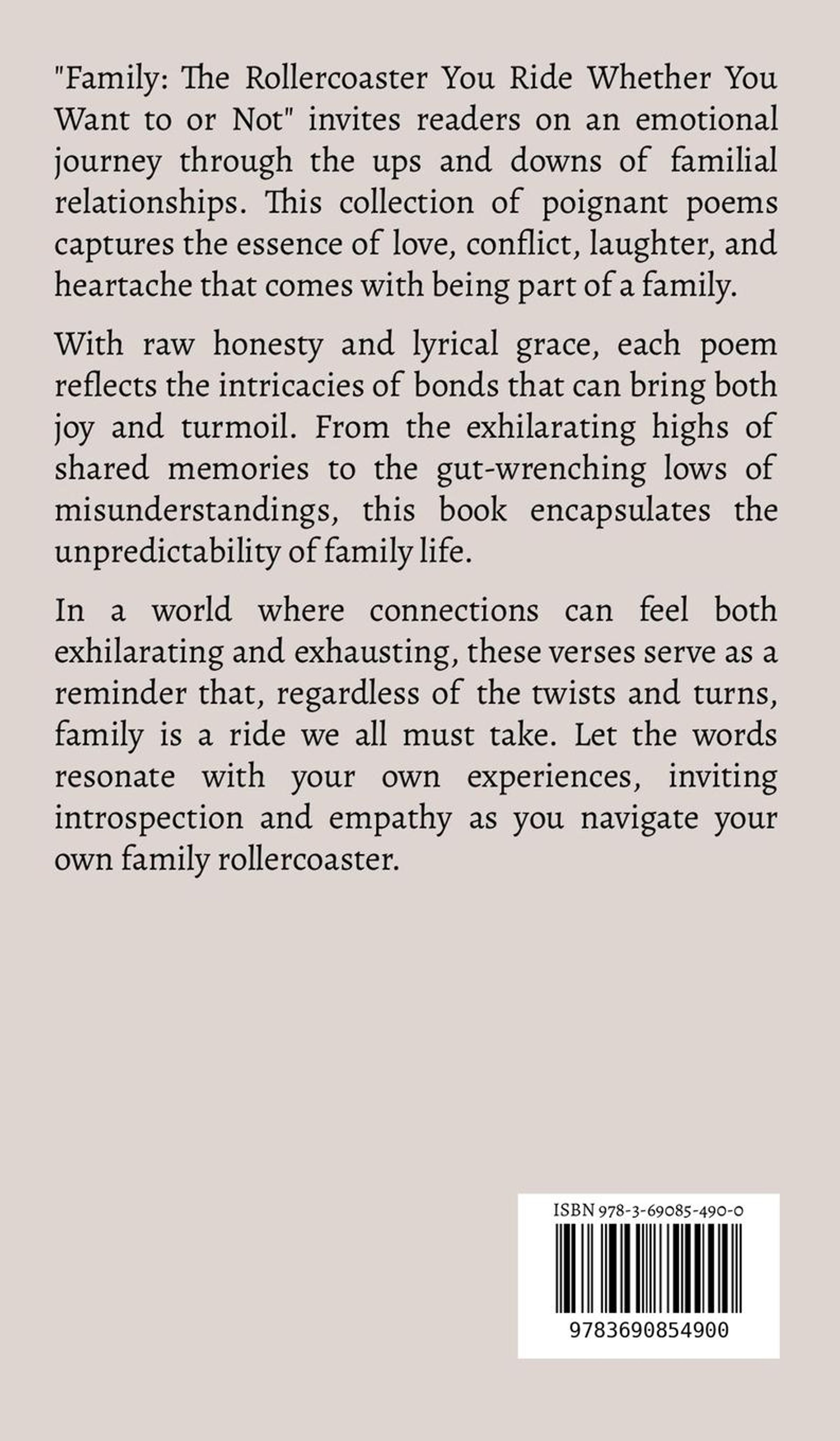"Family: The Rollercoaster You Ride Whether You Want to or Not" invites readers on an emotional journey through the ups and downs of familial relationships. This collection of poignant poems captures the essence of love, conflict, laughter, and heartache that comes with being part of a family. With raw honesty and lyrical grace, each poem reflects the intricacies of bonds that can bring both joy and turmoil. From the exhilarating highs of shared memories to the gut-wrenching lows of misunderstandings, this book encapsulates the unpredictability of family life. In a world where connections can feel both exhilarating and exhausting, these verses serve as a reminder that, regardless of the twists and turns, family is a ride we all must take. Let the words resonate with your own experiences, inviting introspection and empathy as you navigate your own family rollercoaster.