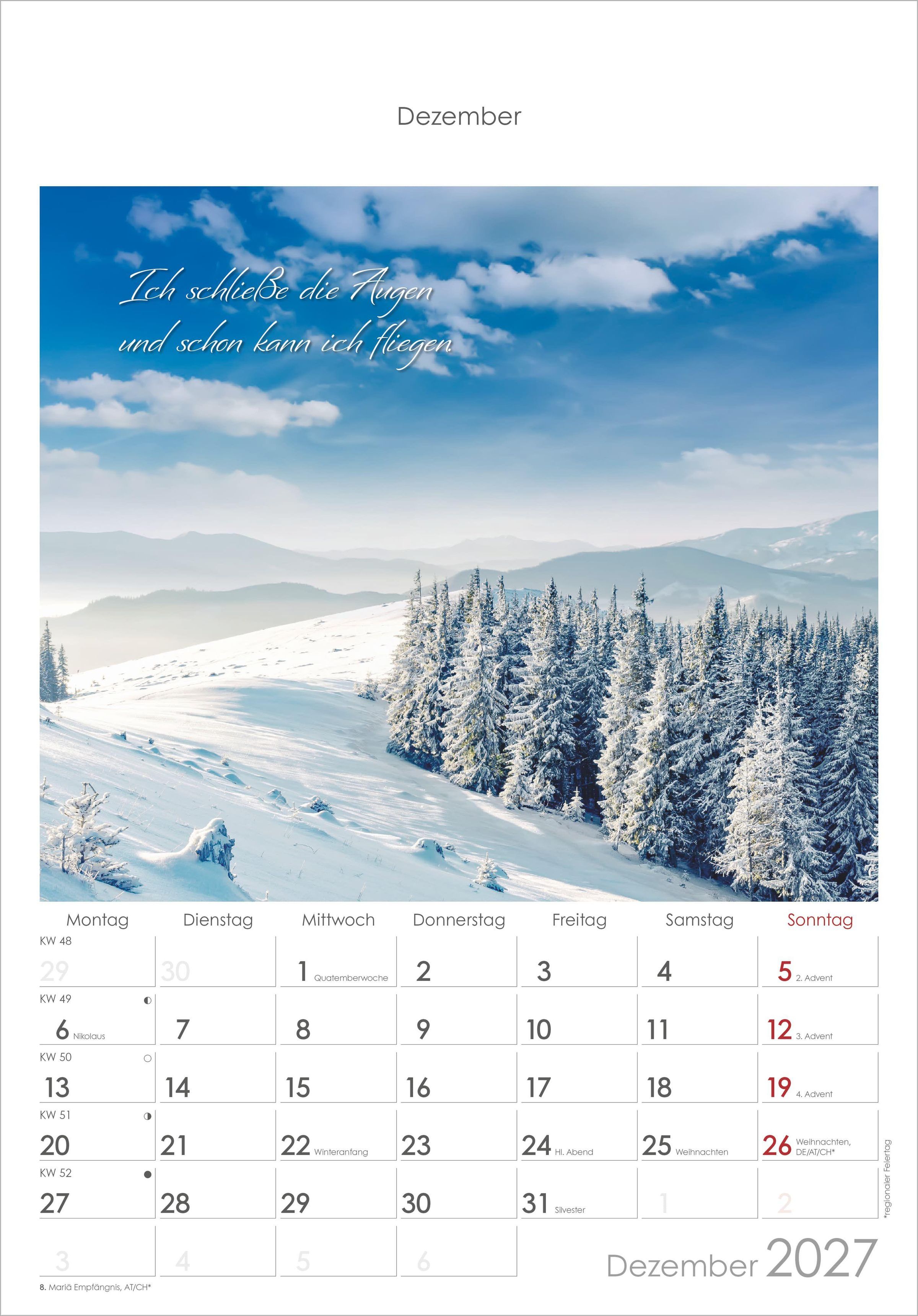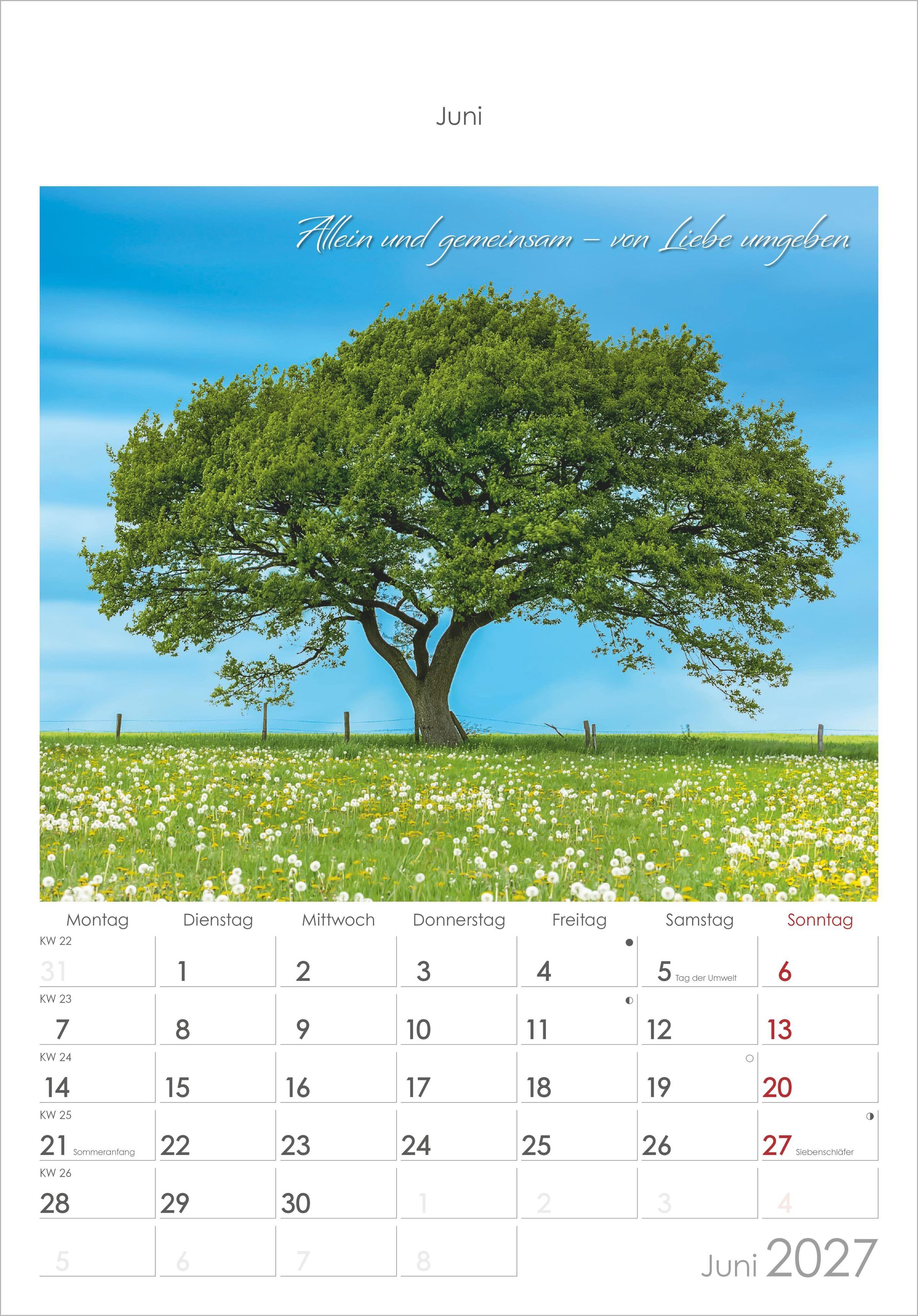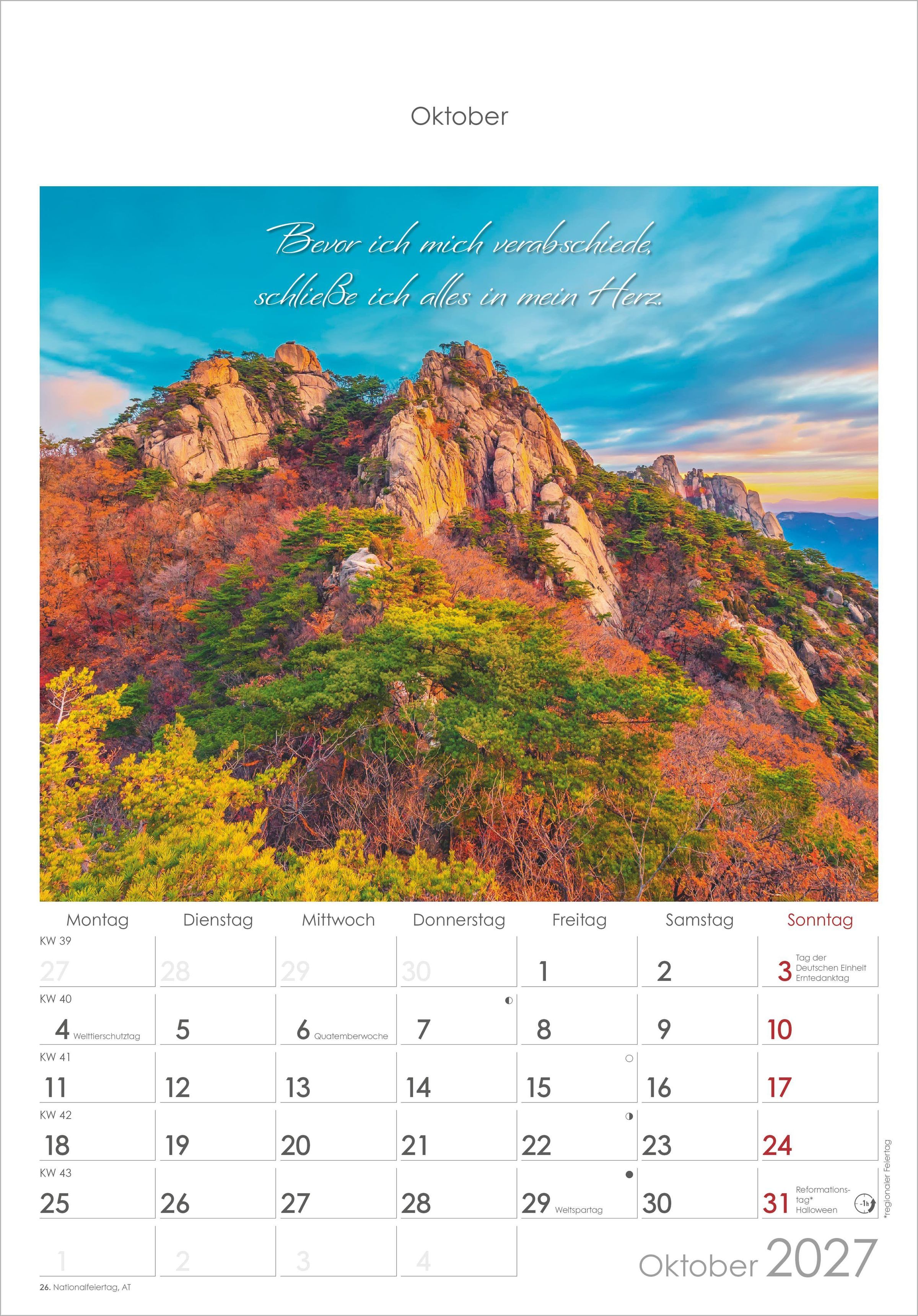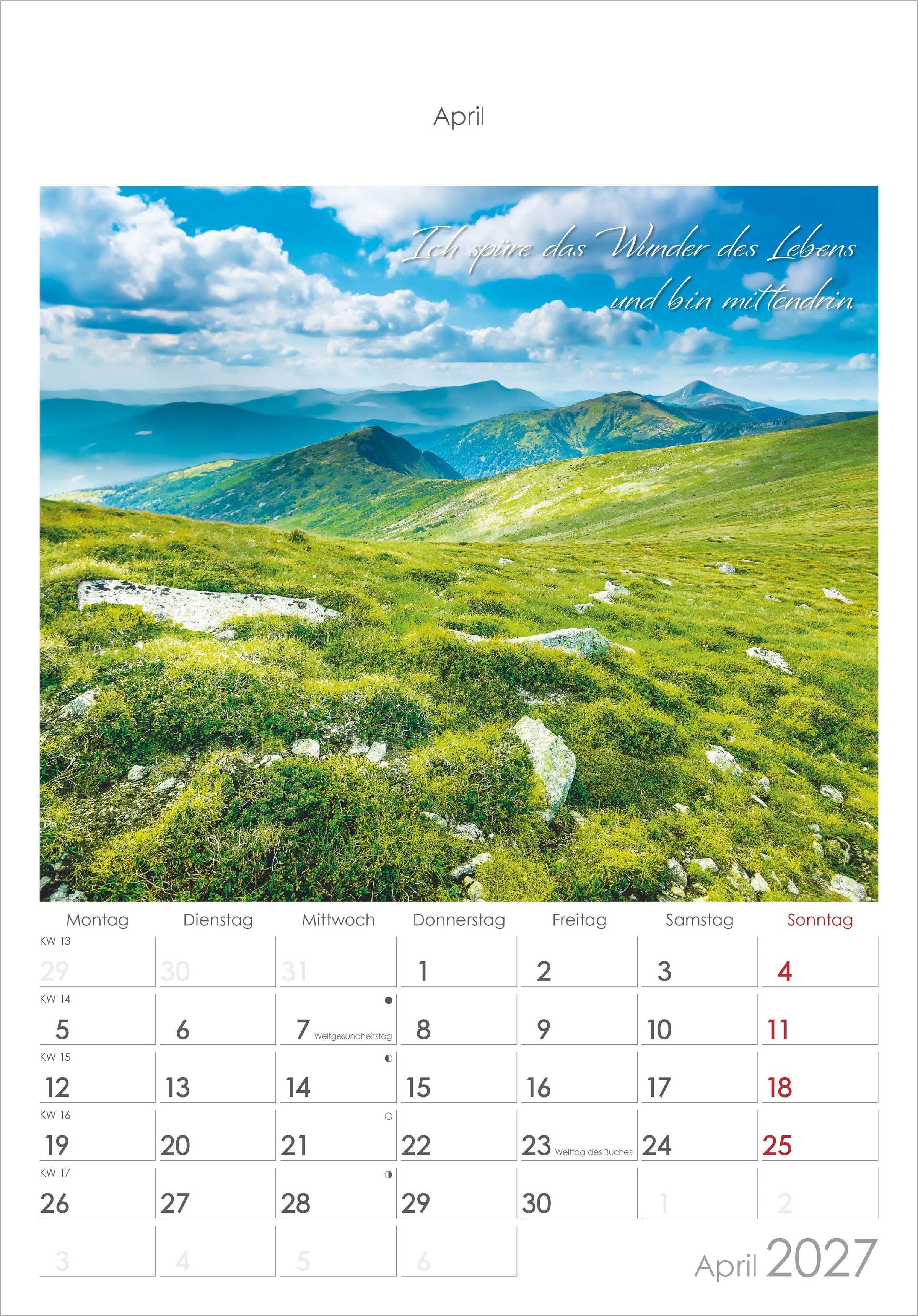 Der Alpha Edition Auszeit für die Seele Kalender 2027 schenkt Ihnen Monat für Monat kleine Momente der Ruhe. Zwölf stimmungsvolle Landschaftsaufnahmen kombiniert mit inspirierenden Lebensweisheiten laden dazu ein, innezuhalten und die schönen Augenblicke des Lebens bewusst zu genießen.