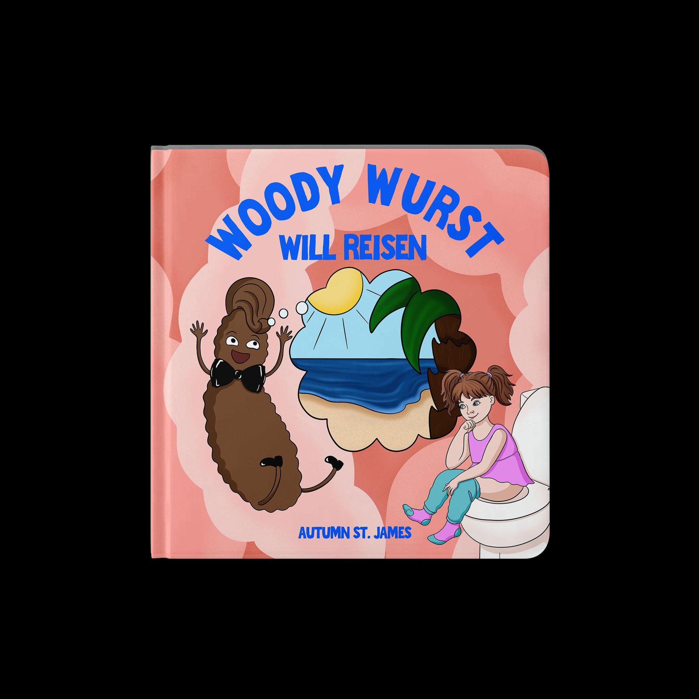 „Woody Wurst will reisen“ und „AUTUMN ST. JAMES“. Illustration: tanzende Wurst und nachdenkliches Mädchen auf Toilette., Buch