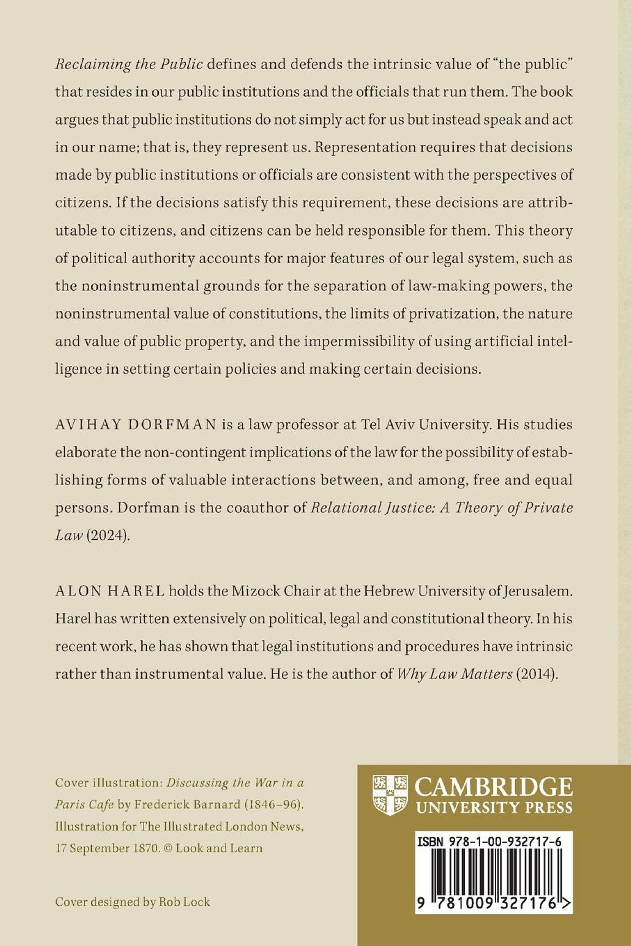 Reclaiming the Public defines and defends the intrinsic value of "the public" that resides in our public institutions and the officials that run them. The book argues that public institutions do not simply act for us but instead speak and act in our name; i. e., they represent us. Representation requires that decisions made by public institutions or officials are consistent with the perspectives of citizens. If the decisions satisfy this requirement, these decisions are attributable to citizens, and citizens can be held responsible for them. This theory of political authority accounts for major features of our legal system, such as the non-instrumental grounds for the separation of law-making powers, the non-instrumental value of constitutions, the limits of privatization, the nature and value of public property, and the impermissibility of using artificial intelligence in setting certain policies and making certain decisions.