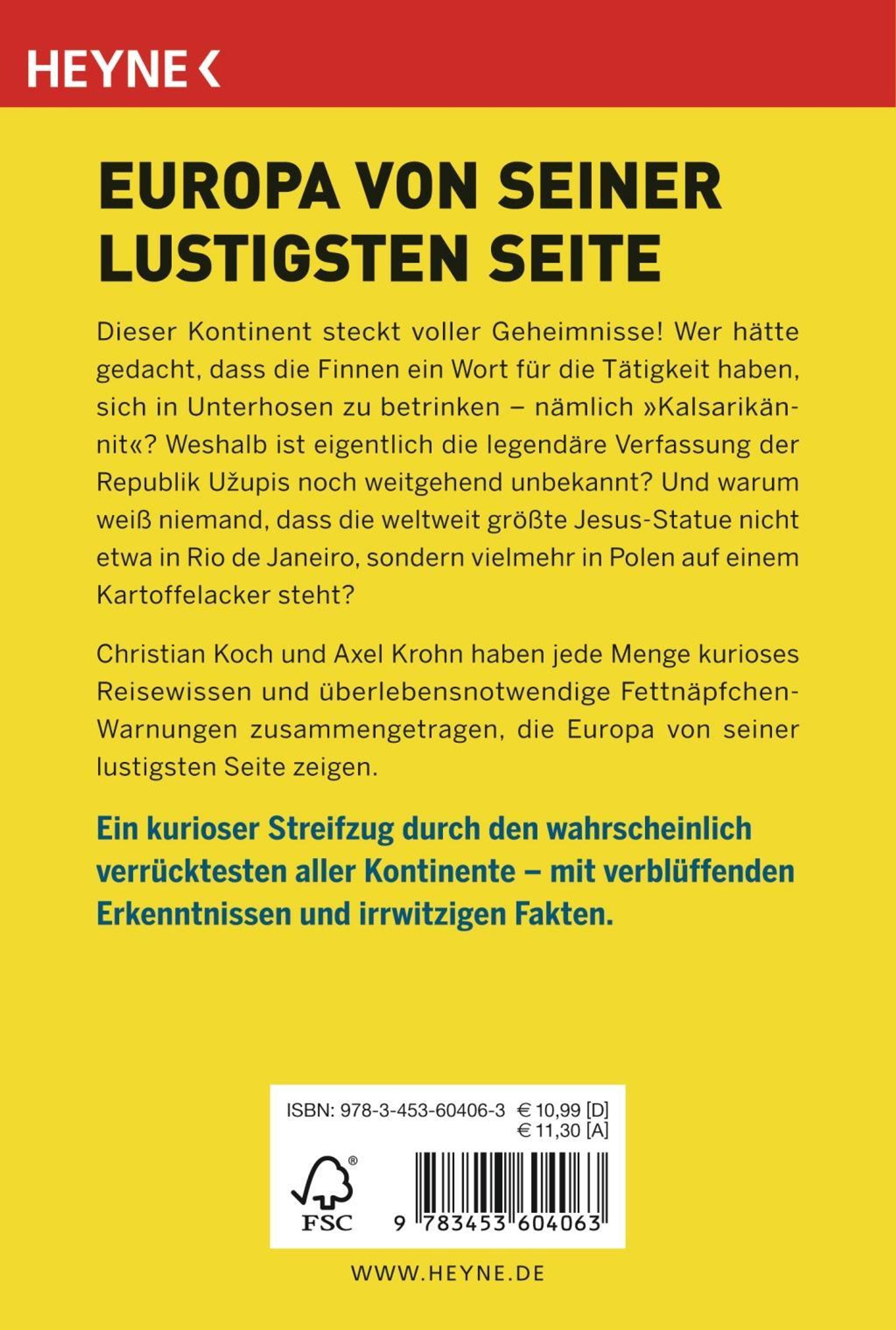 Europa steckt voller Geheimnisse! Wer hätte gedacht, dass die Finnen ein Wort für die Tätigkeit haben, sich in Unterhosen zu betrinken - nämlich "Kalsarikännit"? Wer kennt die so wichtige Geste der Italiener für "Deine Frau geht fremd"? Und warum weiß eigentlich niemand, dass die weltweit größte Jesus-Statue nicht etwa in Rio de Janeiro sondern vielmehr in Polen auf einem Kartoffelacker steht? Christian Koch und Axel Krohn haben jede Menge kurioses Reisewissen und überlebensnotwendige Fettnäpfchen-Warnungen zusammengetragen, die Europa von seiner lustigsten Seite zeigen. Verblüffend, erhellend, skurril.