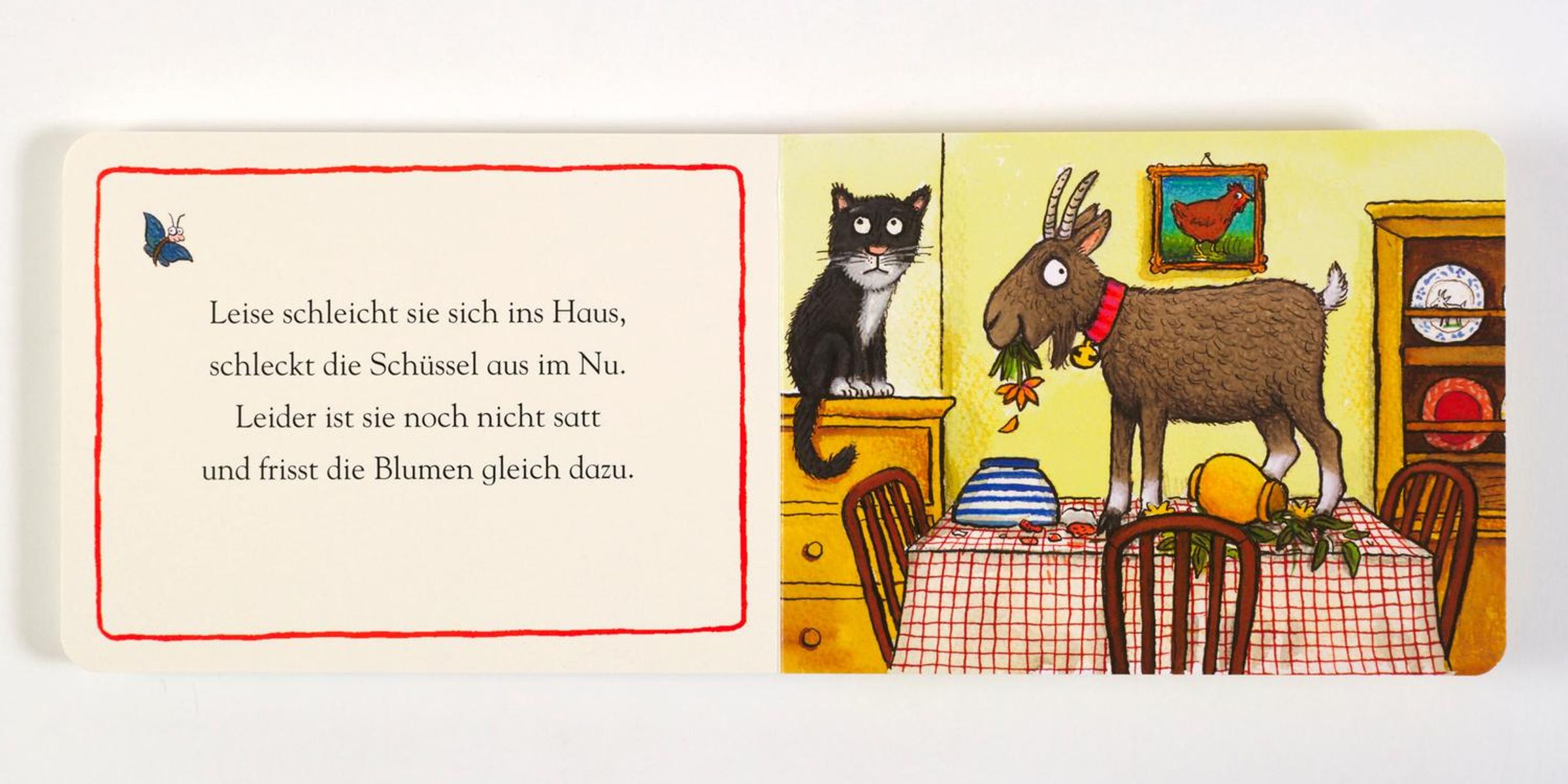 Eine gierige Ziege, die am liebsten rote Beeren mit Sahne frisst. Ein bezaubernd einfache Pappbilderbuch zum Vorlesen von Axel Scheffler, dem Illustrator des Grüffelo. Reime für Kleine in tierisch schöner Nachdichtung von Franz Hohler.