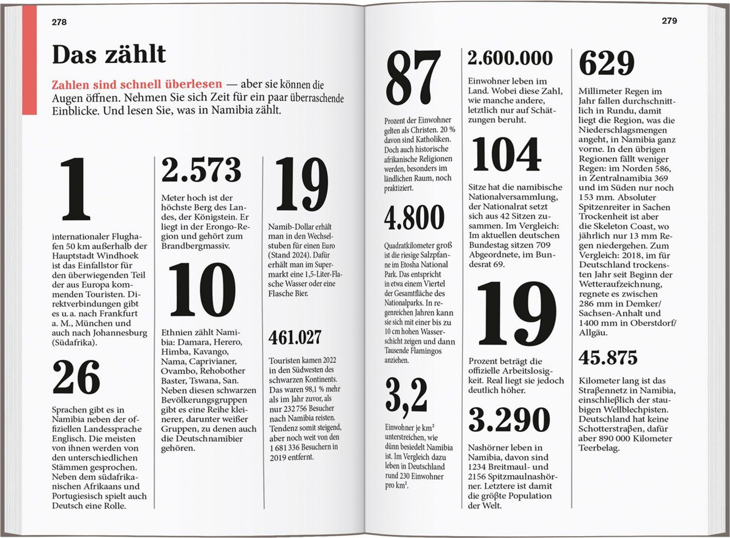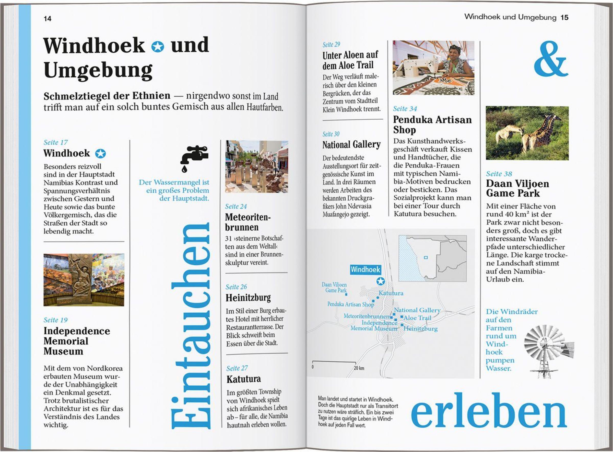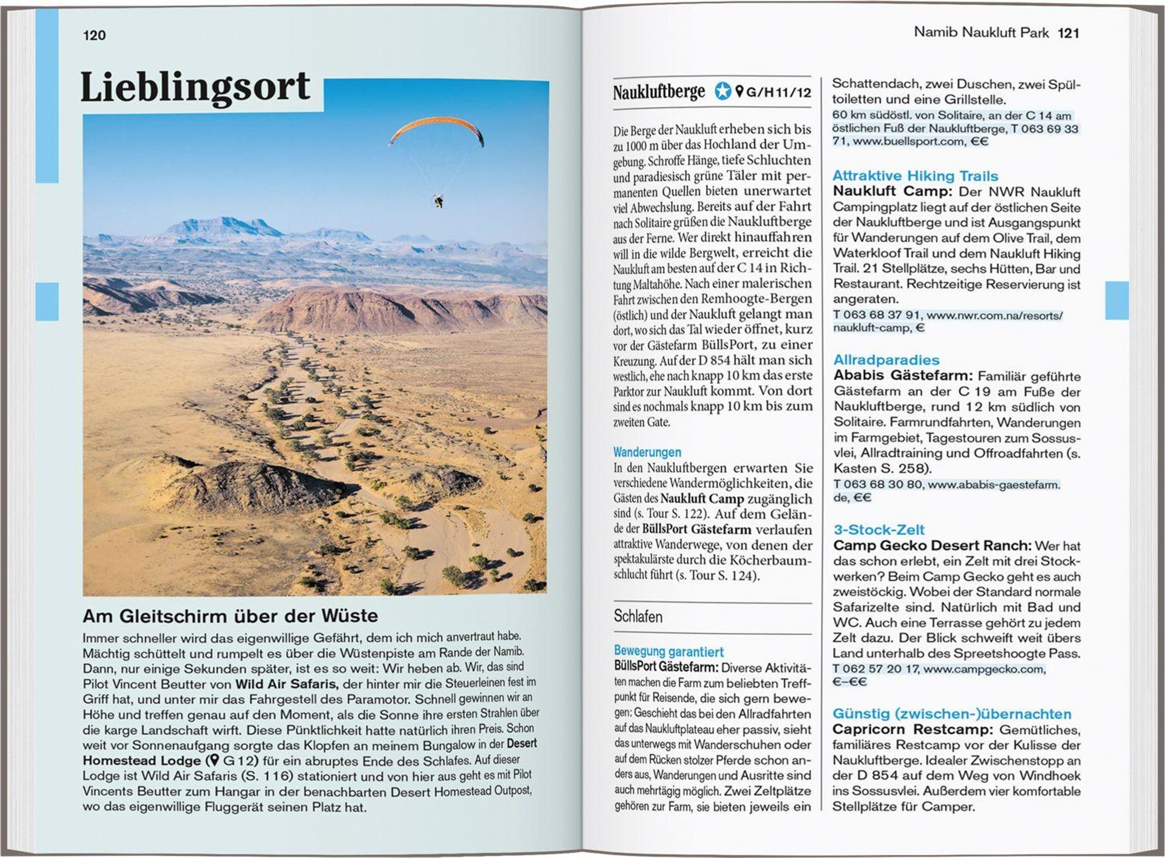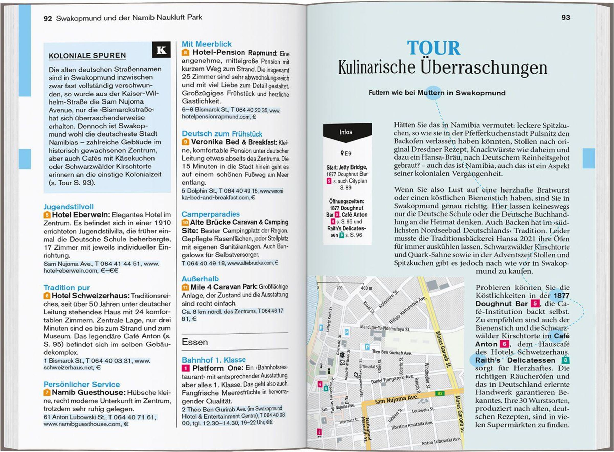 Die Karten: 4 Citypläne, 21 Tourenkarten, Übersichtskarte mit den Highlights Namibias, Schnellüberblick zu jeder Region plus eine große Reisekarte
