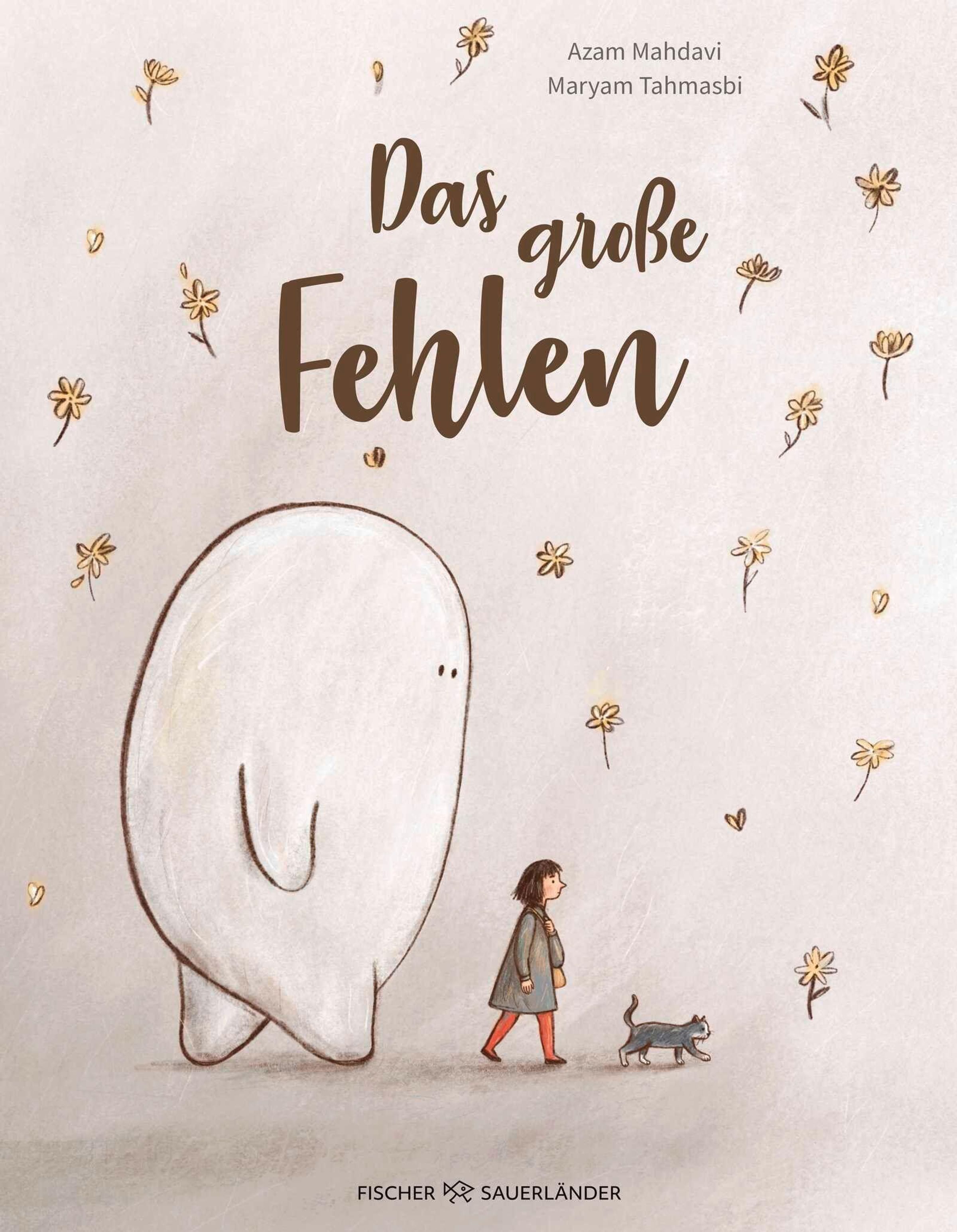 „Das große Fehlen“ von Azam Mahdavi und Maryam Tahmasbi. Illustration: Ein großes Wesen mit Kind und Katze, umgeben von Blumen., Buch