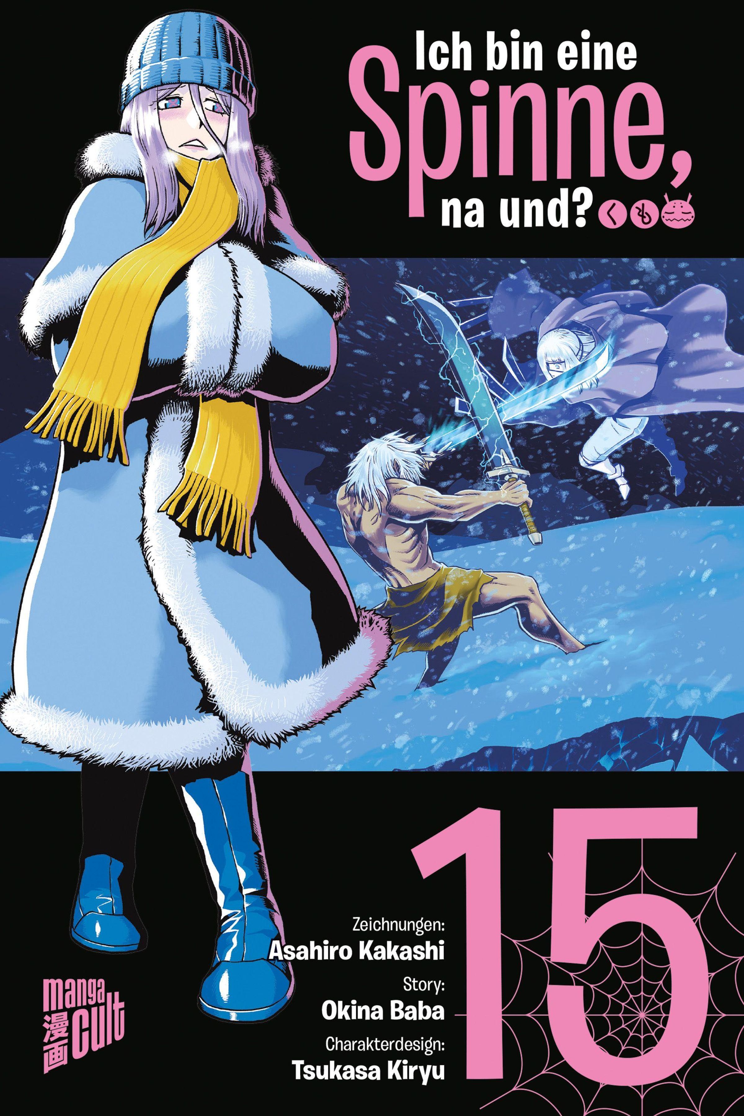 „Ich bin eine Spinne, na und?“ steht groß, darunter „15“. Gezeichnete Figur in Winterkleidung, darunter Kampfszene., Buch