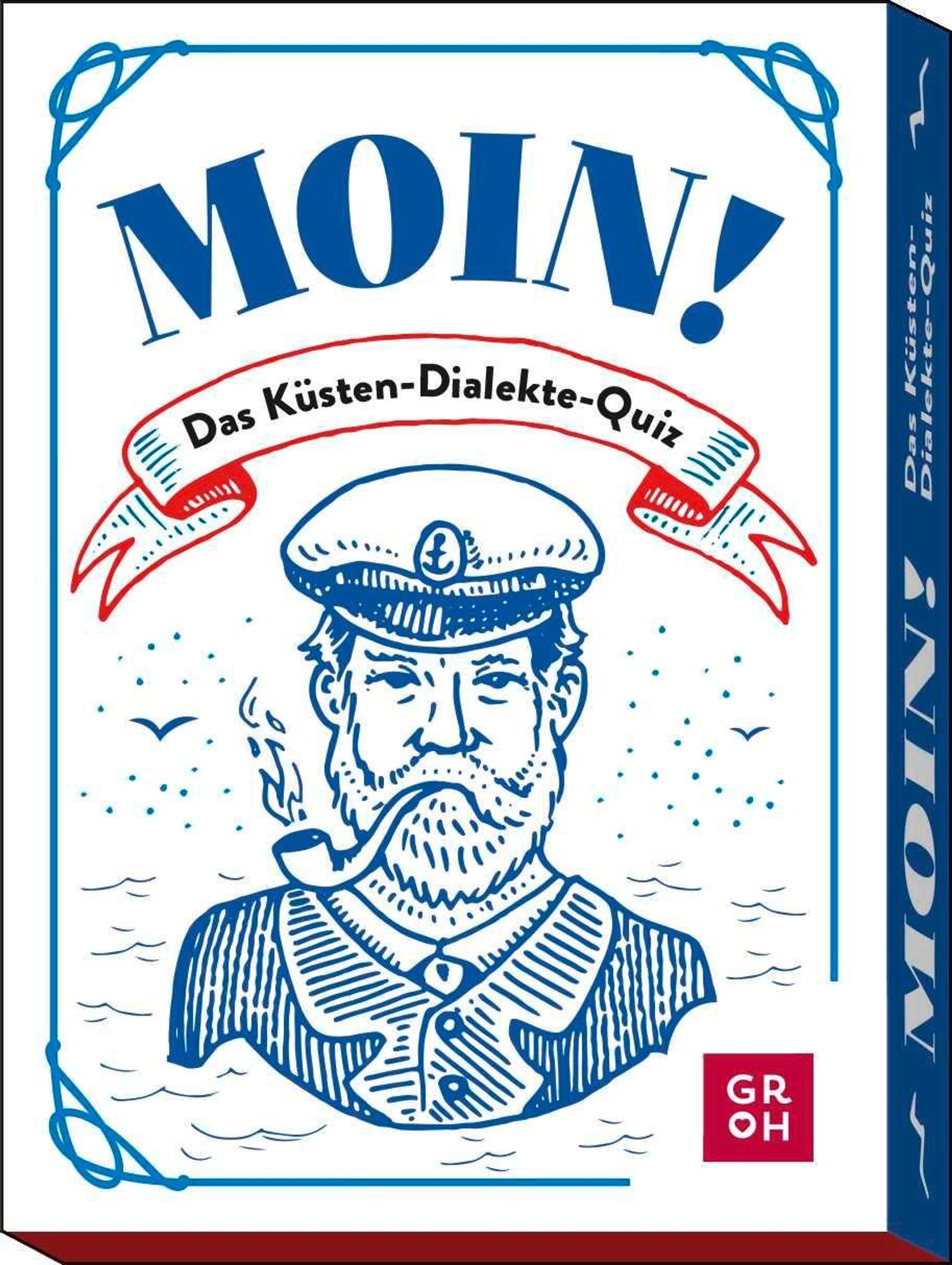„MOIN! Das Küsten-Dialekte-Quiz“. Illustration eines bärtigen Seemanns mit Mütze und Pfeife, umgeben von Meer., Spiele