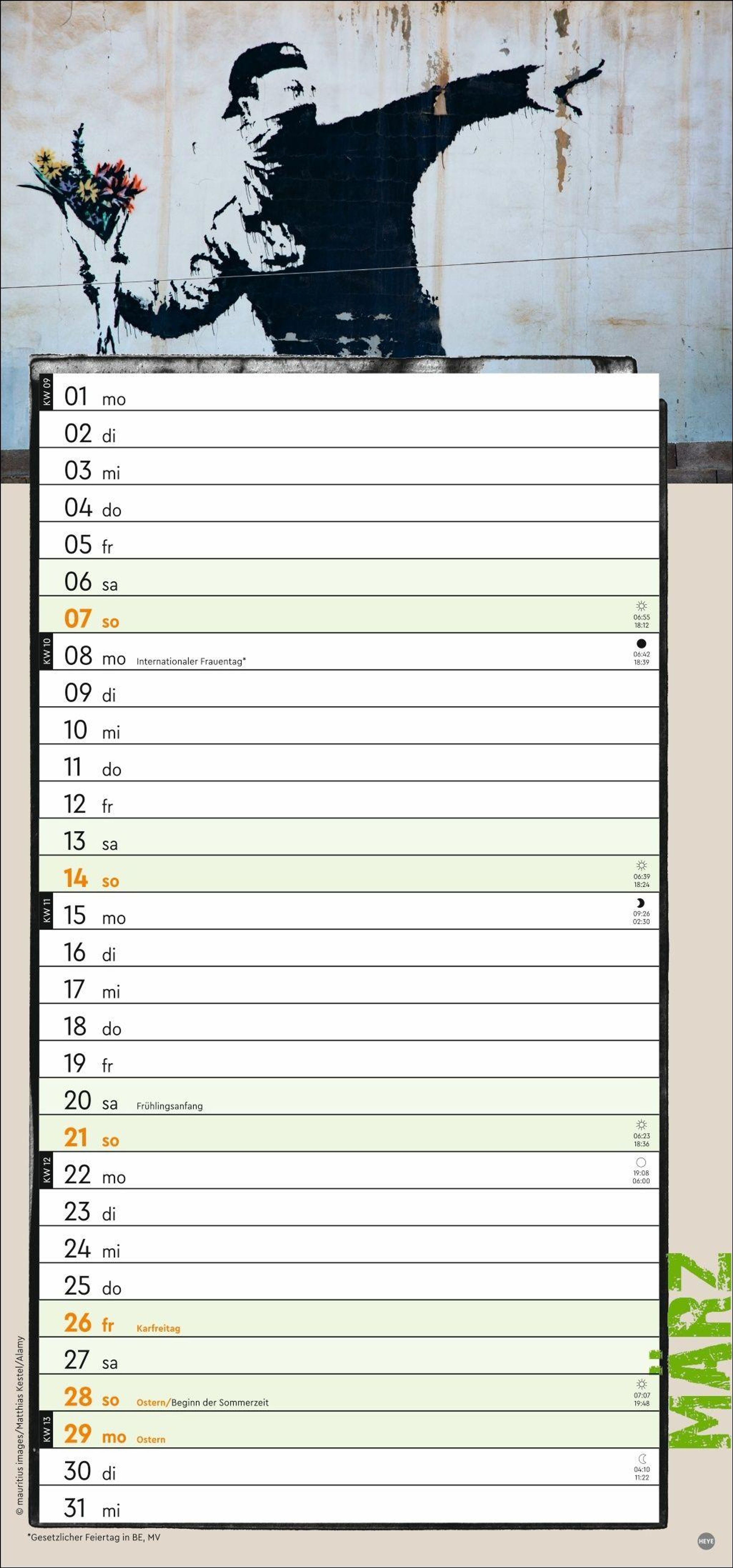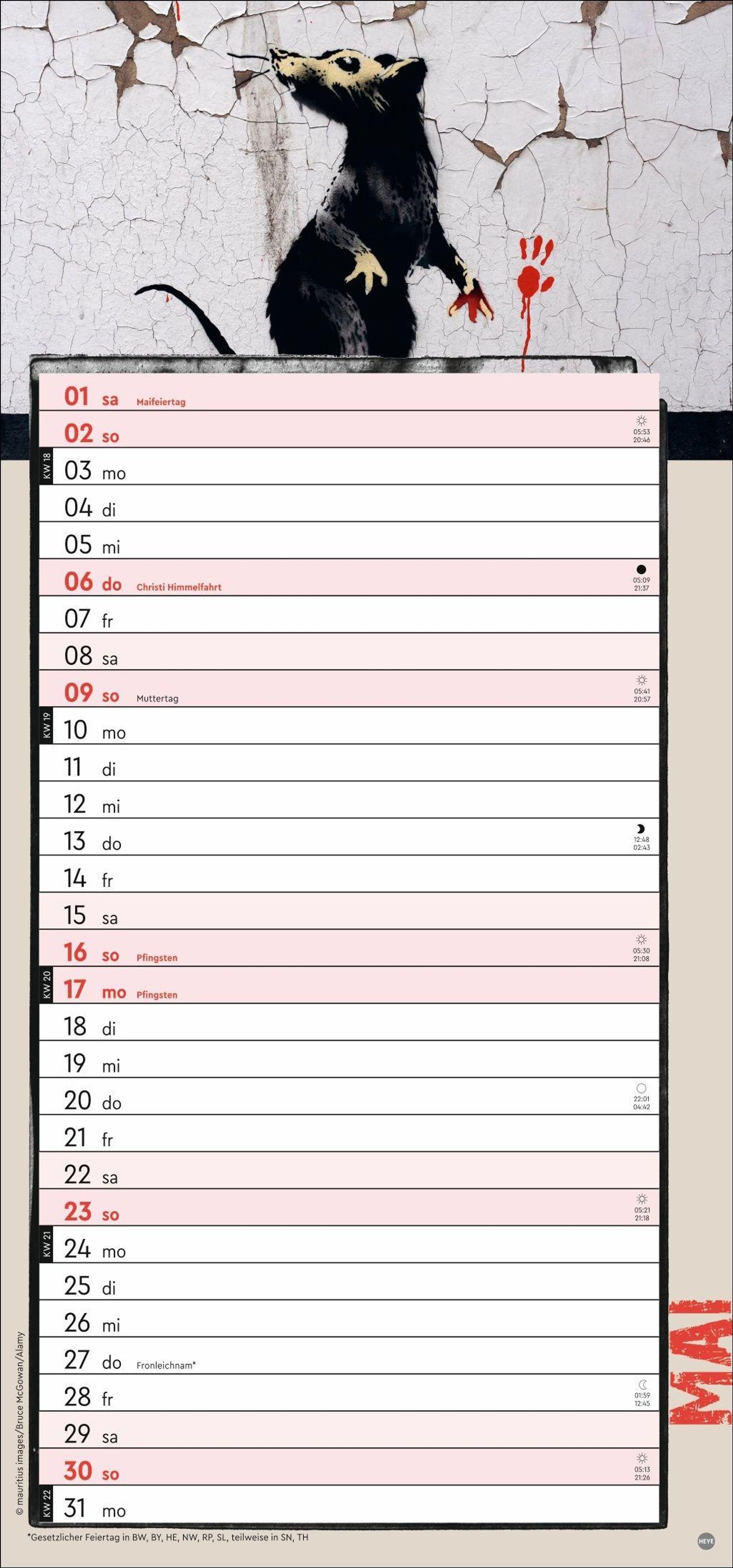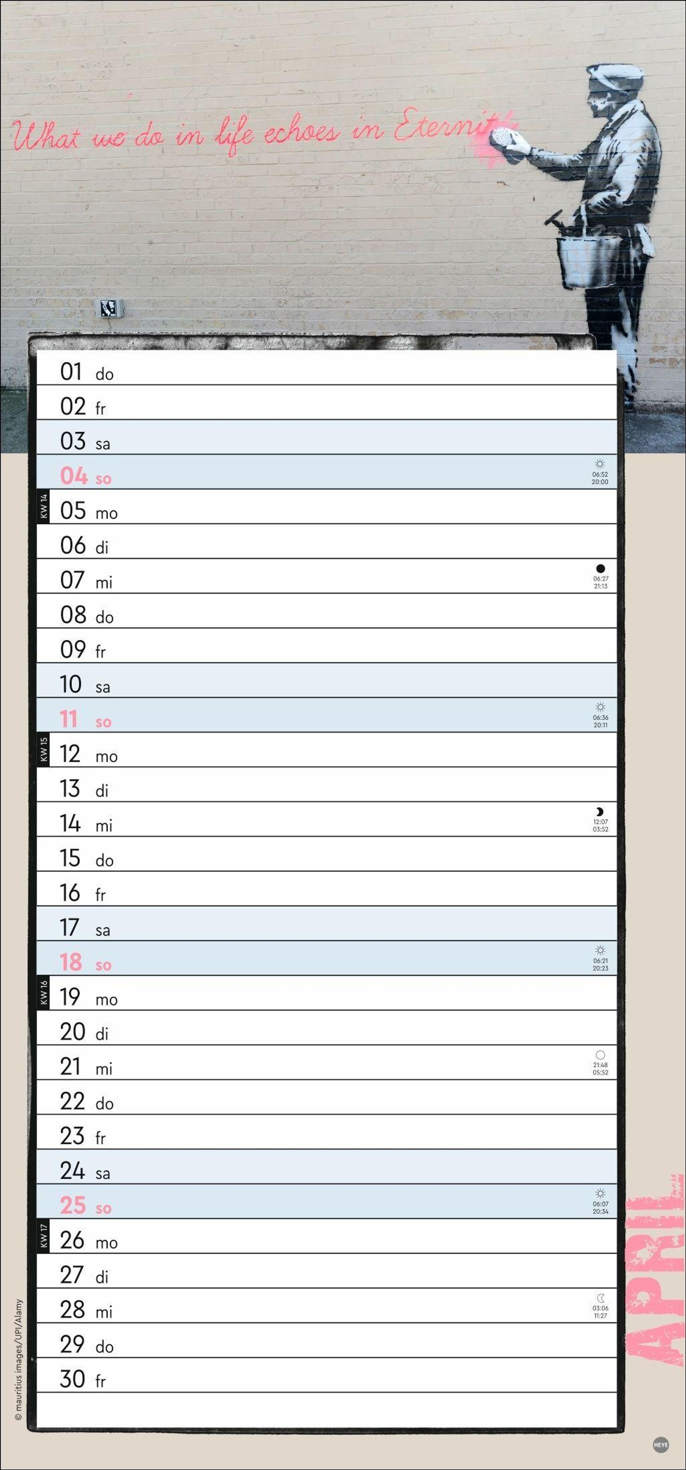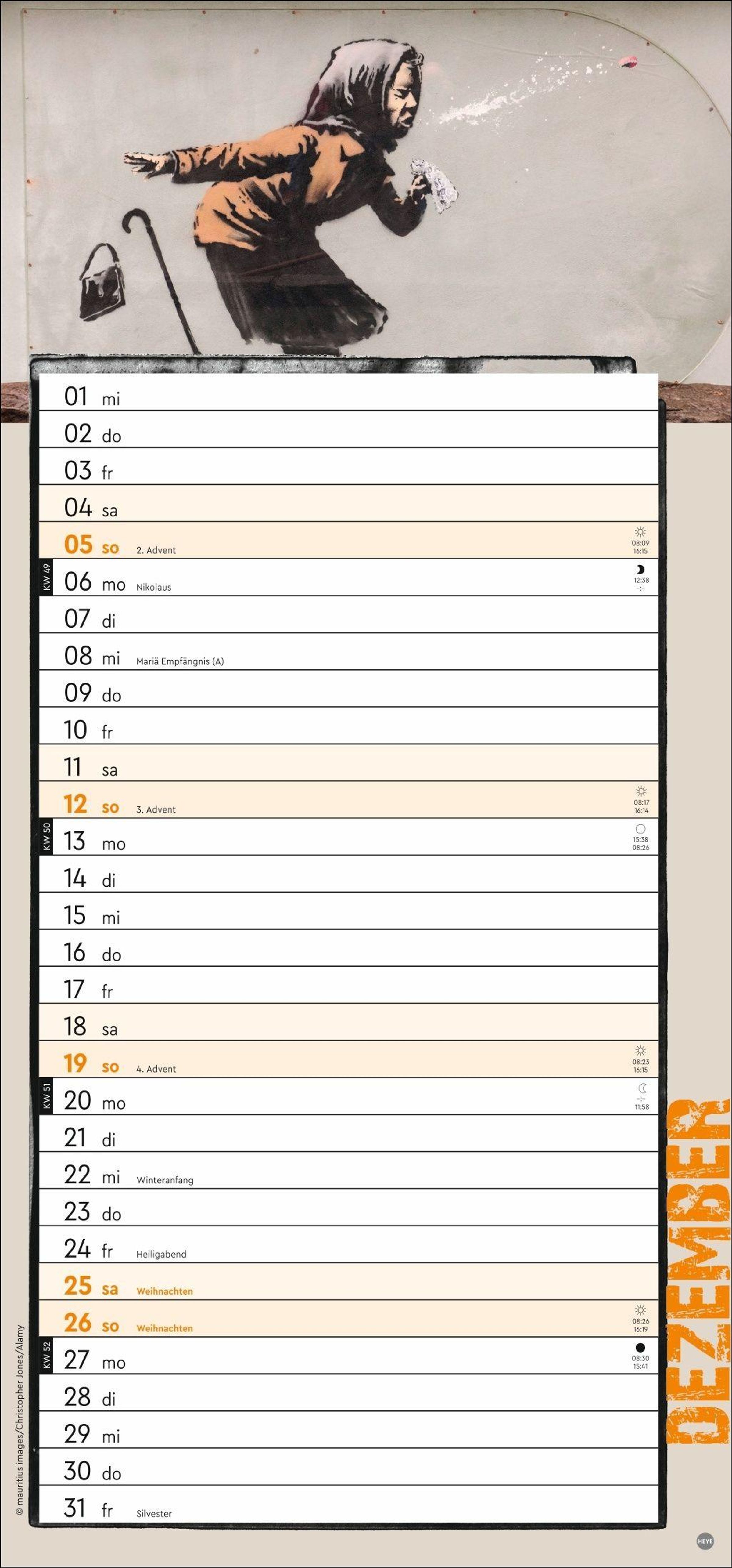 - Terminkalender als Wandplaner mit großer Einzelspalte. Monatlich wechselnde Guerilla-Art-Motive des zeitgenössischen Künstlers Banksy. Wandkalender im Format 21 x 45 cm