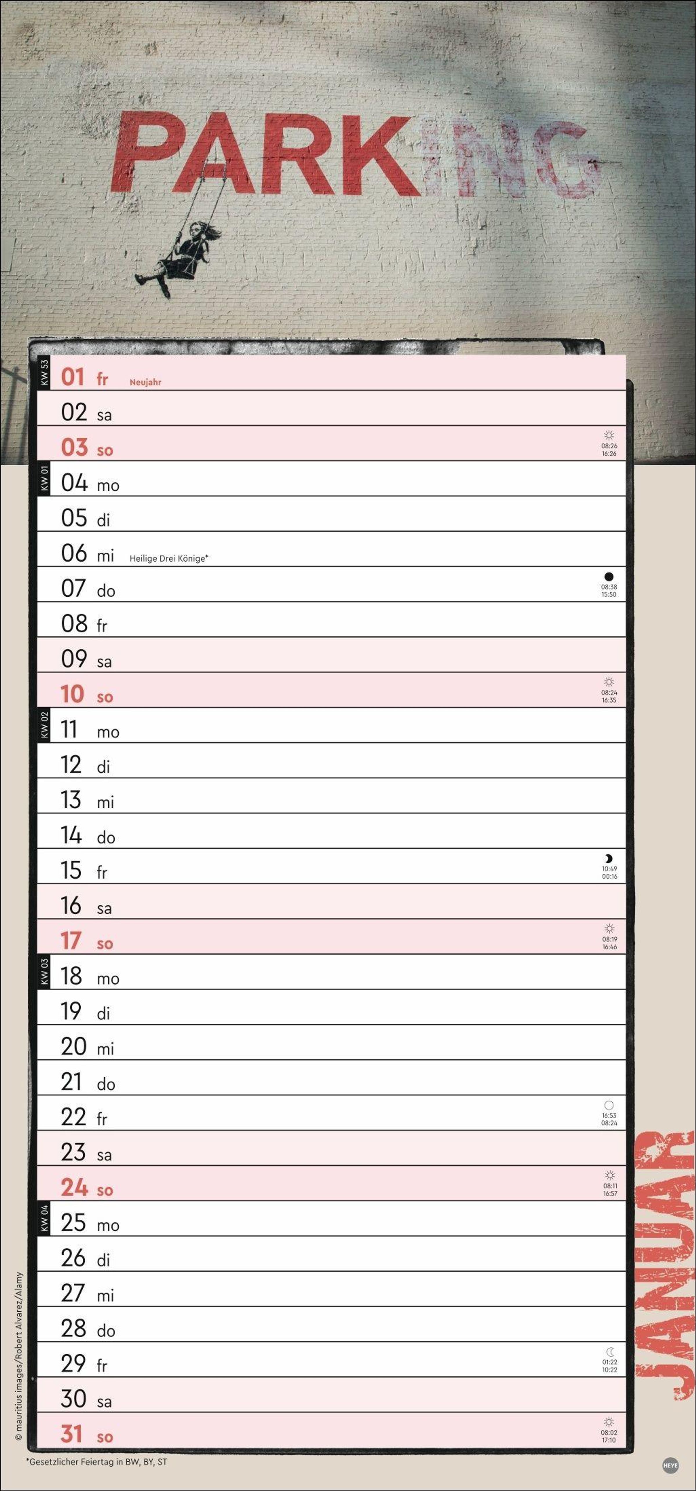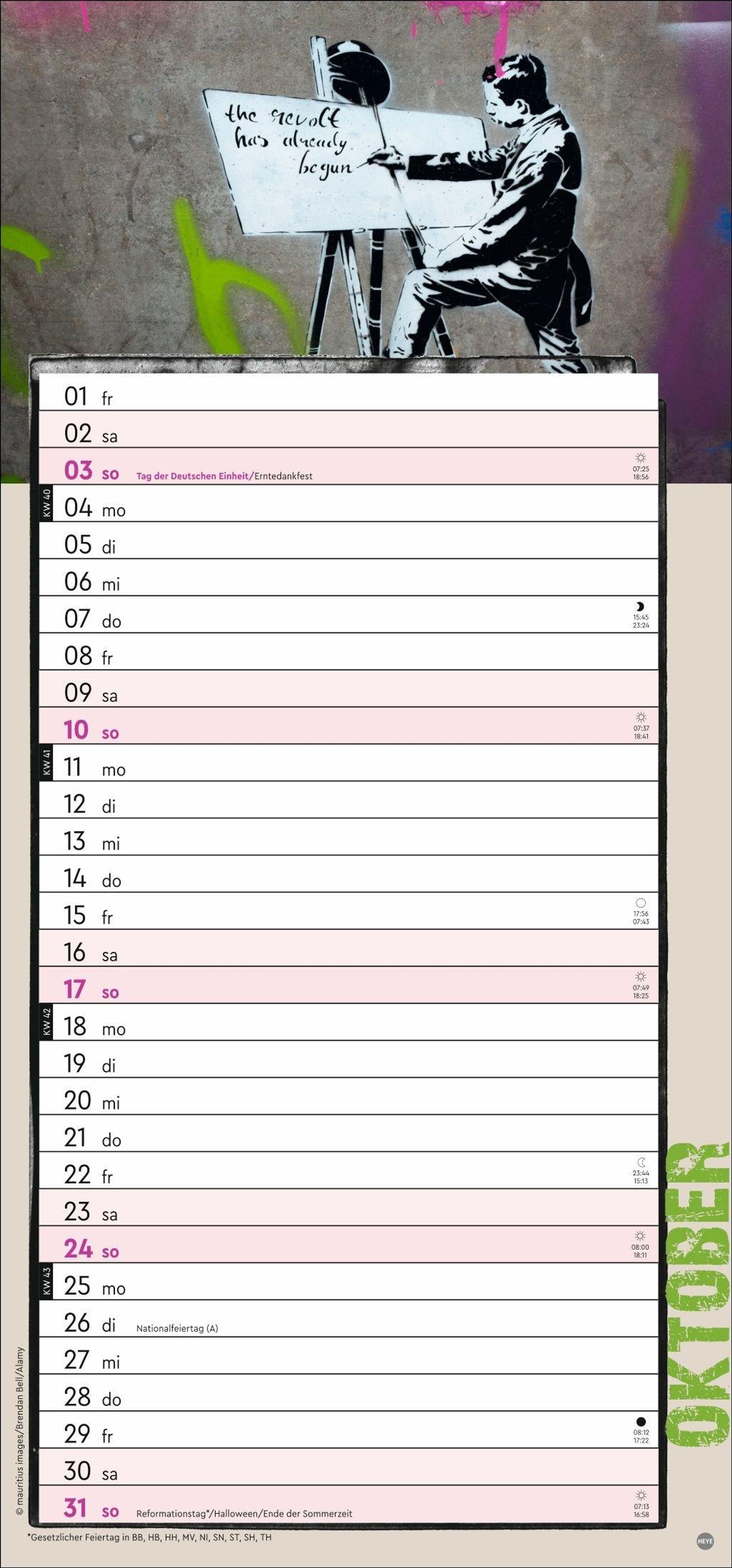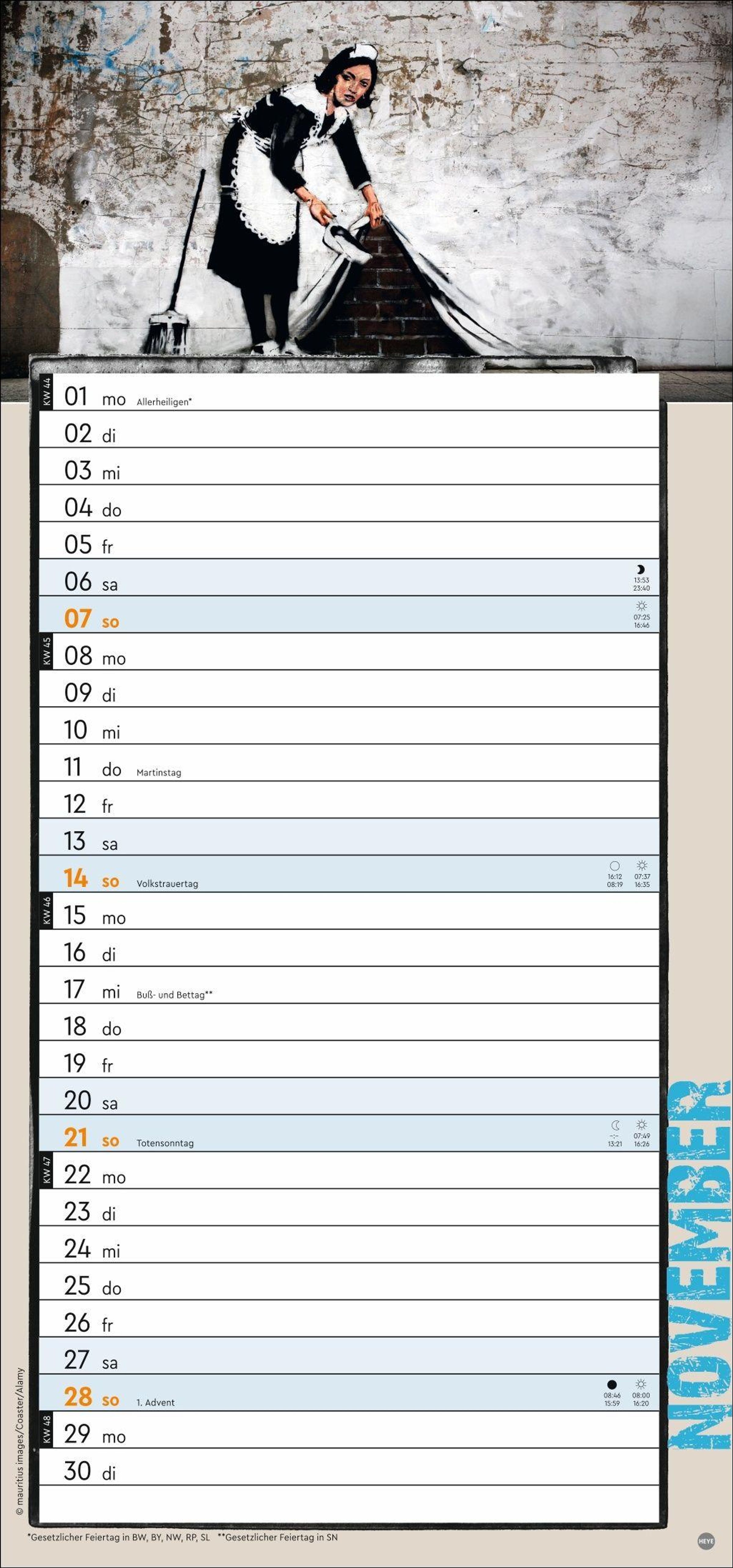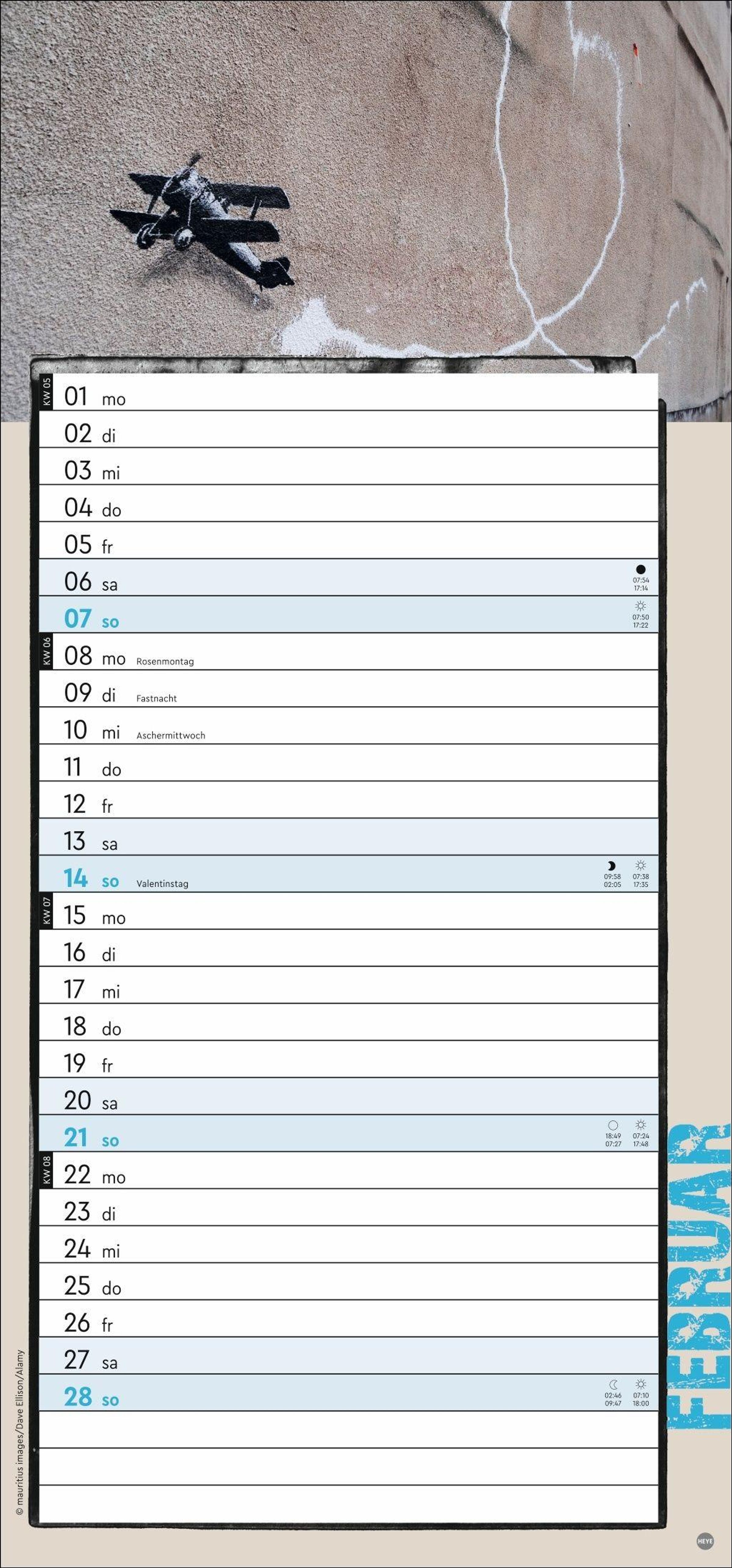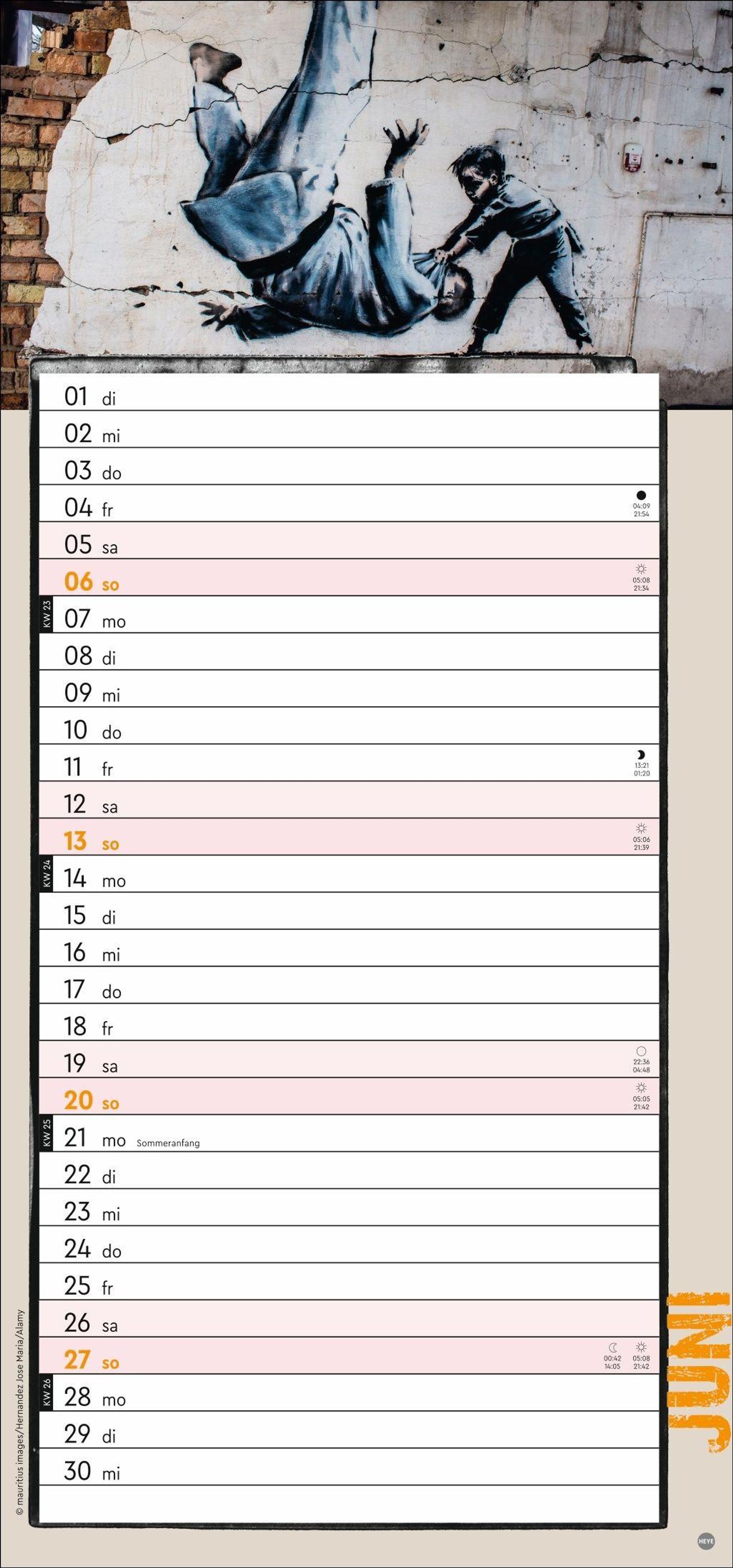 - Terminkalender als Wandplaner mit großer Einzelspalte. Monatlich wechselnde Guerilla-Art-Motive des zeitgenössischen Künstlers Banksy. Wandkalender im Format 21 x 45 cm