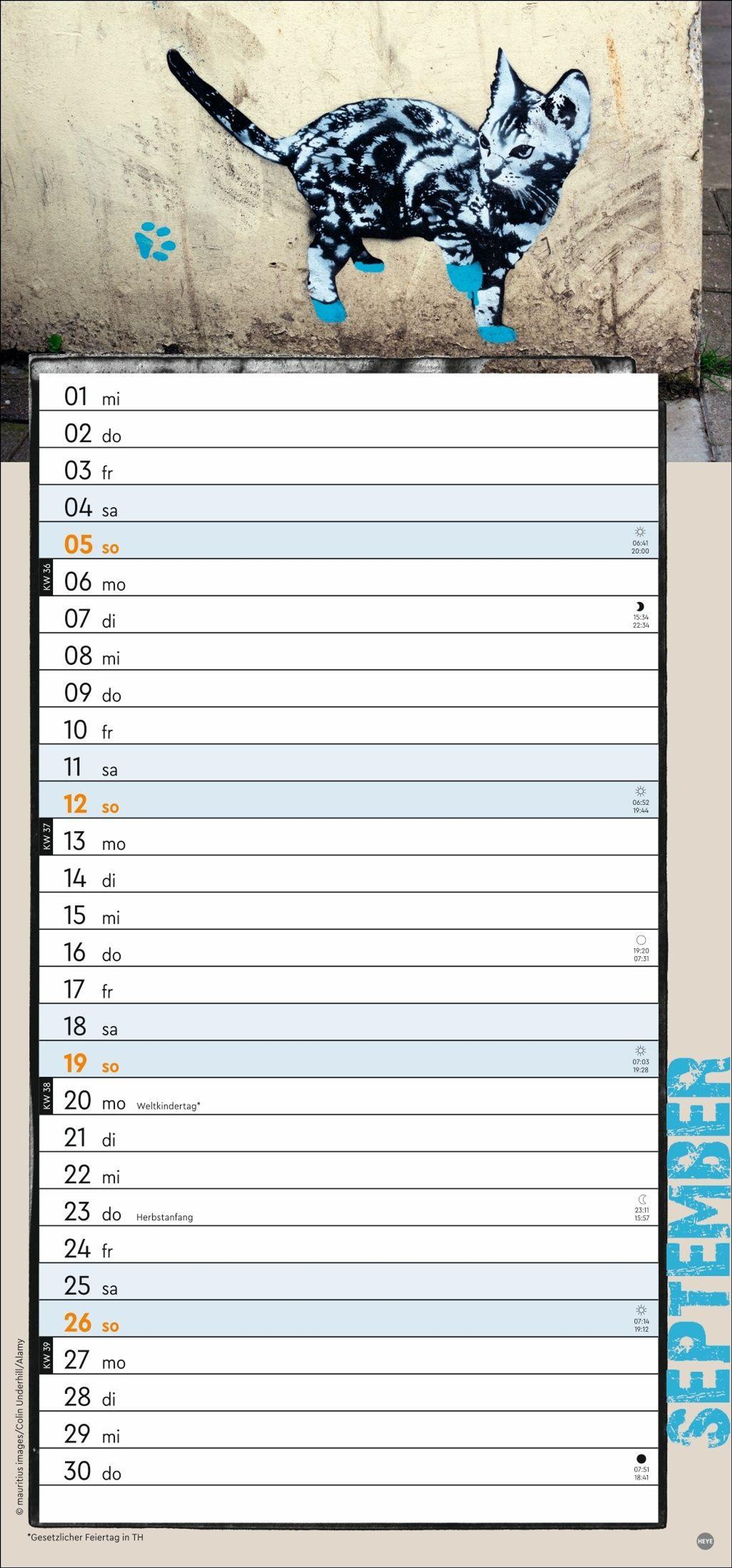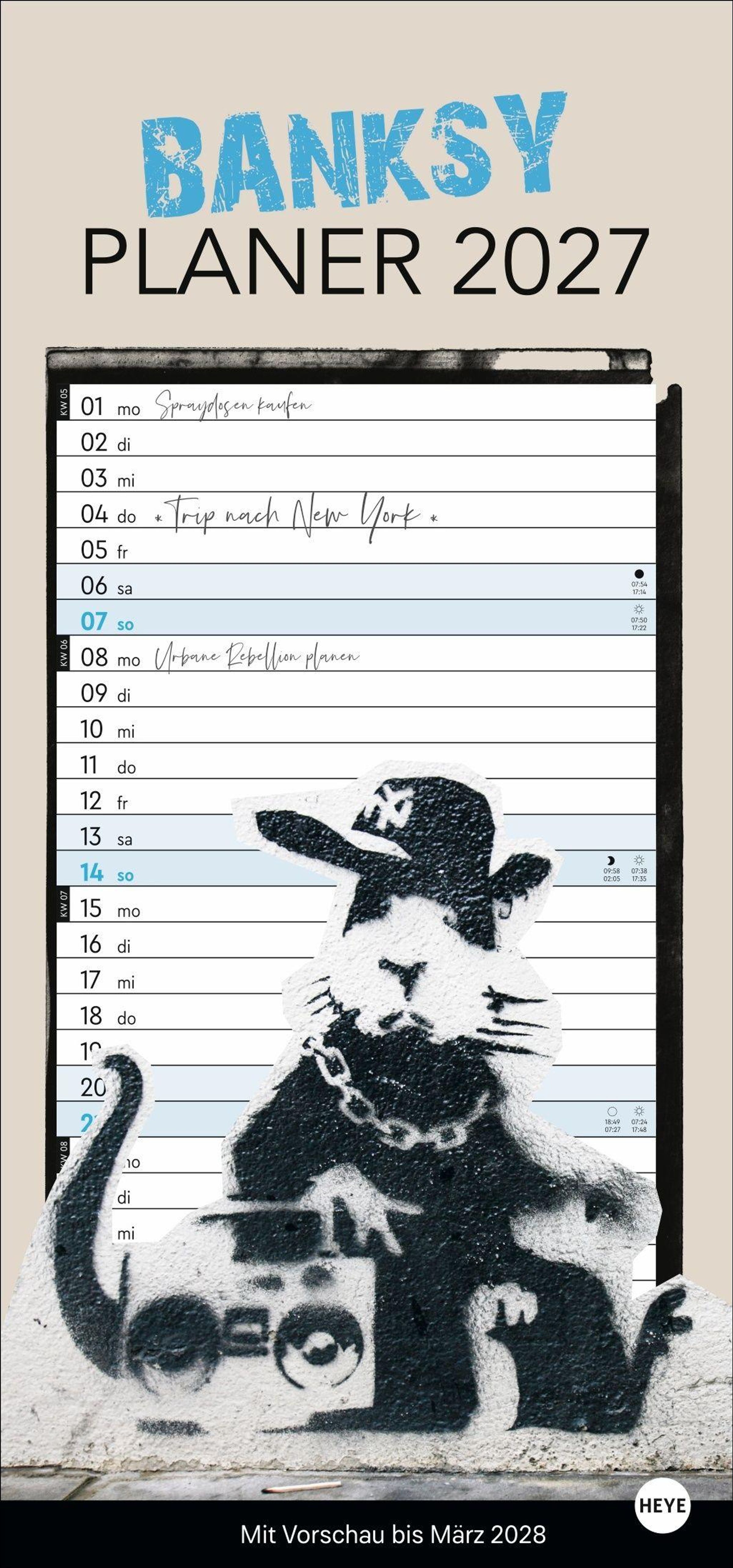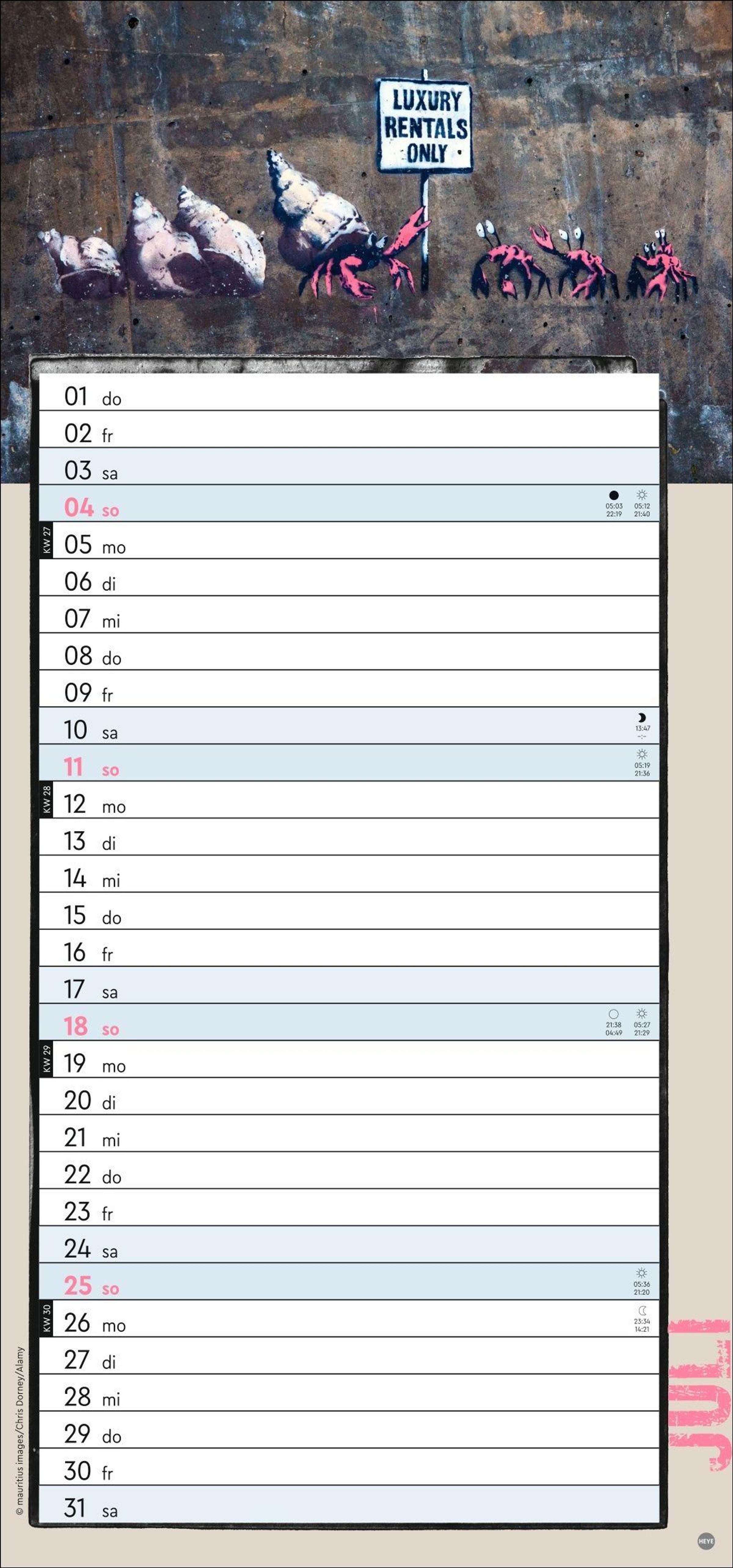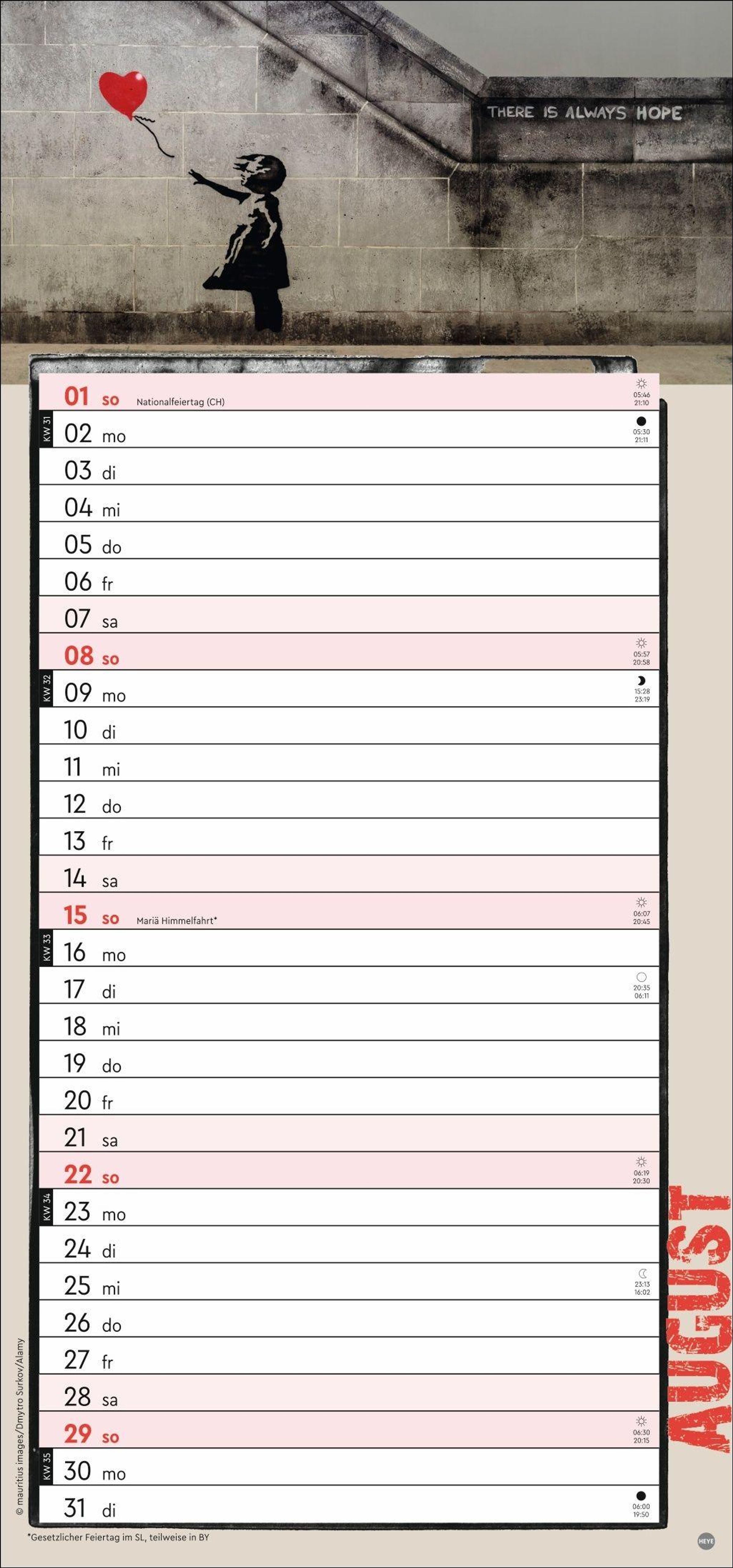 - Terminkalender als Wandplaner mit großer Einzelspalte. Monatlich wechselnde Guerilla-Art-Motive des zeitgenössischen Künstlers Banksy. Wandkalender im Format 21 x 45 cm