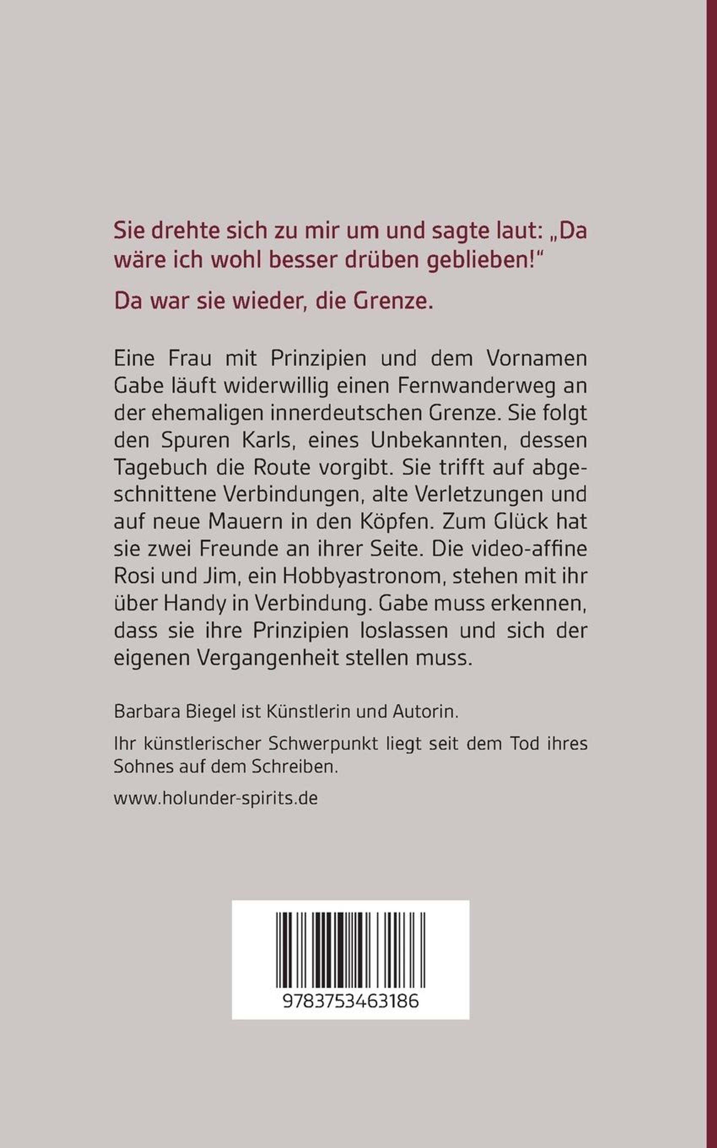Gabes Grenzen Eine Frau mit Prinzipien und dem Vornamen Gabe läuft widerwillig einen Fernwanderweg an der ehemaligen innerdeutschen Grenze. Sie folgt den Spuren Karls, eines Unbekannten, dessen Tagebuch die Route vorgibt. Sie trifft auf abgeschnittene Verbindungen, alte Verletzungen und auf neue Mauern in den Köpfen. Zum Glück hat sie zwei Freunde an ihrer Seite. Die video-affine Rosi und Jim, ein Hobbyastronom, stehen mit ihr über Handy in Verbindung. Gabe muss erkennen, dass sie ihre Prinzipien loslassen und sich der eigenen Vergangenheit stellen muss.