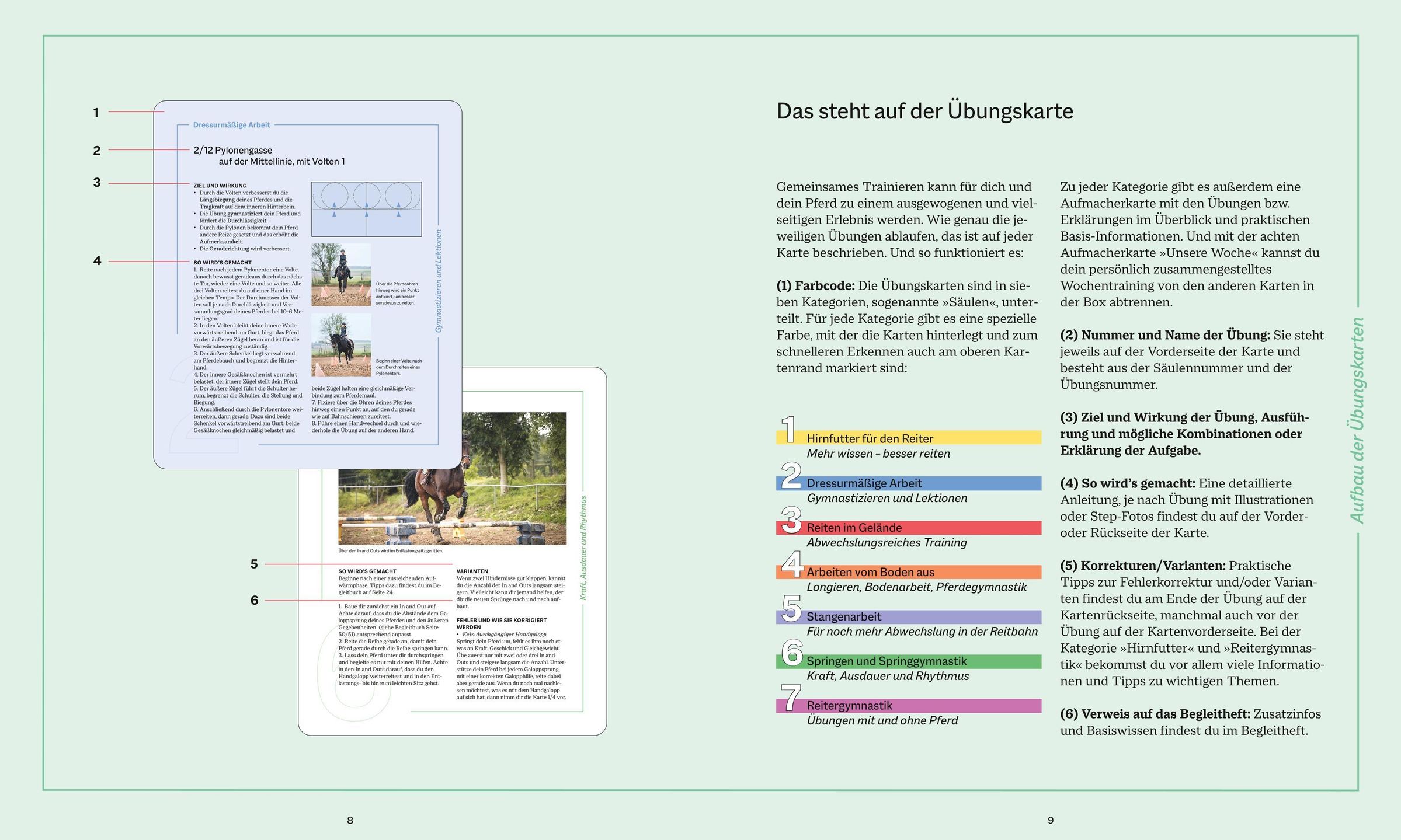 Gut 100 Übungskarten aus 7 Disziplinen (Theorie, dressurmäßige Arbeit, Reiten im Gelände, Bodenarbeit, Stangenarbeit, Springen, Reitergymnastik) sorgen für ein ganzheitliches Basistraining. Das Zusammenstellen des Wochentrainings ist ganz einfach: Jede Disziplin hat eine eigene Farbe, wer bunt trainiert, trainiert vielseitig.