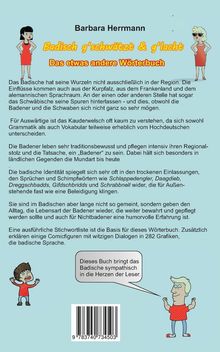 Das Badische hat seine Wurzeln nicht ausschließlich in der Region. Die Einflüsse kommen auch aus der Kurpfalz, aus dem Frankenland und dem alemannischen Sprachraum. An der einen oder anderen Stelle hat sogar das Schwäbische seine Spuren hinterlassen - und dies, obwohl die Badener und die Schwaben sich nicht ganz so sehr mögen. Für Auswärtige ist das Kauderwelsch oft kaum zu verstehen, da sich sowohl Grammatik als auch Vokabular teilweise erheblich vom Hochdeutschen unterscheiden. Die Badener leben sehr traditionsbewusst und pflegen intensiv ihren Regionalstolz und die Tatsache, ein Badener zu sein. Dabei hält sich besonders in ländlichen Gegenden die Mundart bis heute. Die badische Identität spiegelt sich sehr oft in den trockenen Einlassungen, den Sprüchen und Schimpfwörtern wie Schlappedengler, Daagdieb, Dreggschbadds, Gifdschbridds und Schrabbnell wider, die für Außenstehende fast wie eine Beleidigung klingen. Sie sind im Badischen aber lange nicht so gemeint, sondern geben den Alltag, die Lebensart der Badener wieder, die weiter bewahrt und gepflegt werden sollte und auch für Nichtbadener eine humorvolle Erfahrung ist. Eine ausführliche Stichwortliste ist die Basis für dieses Wörterbuch. Zusätzlich erklären einige Comicfiguren mit witzigen Dialogen in 282 Grafiken, die badische Sprache.
