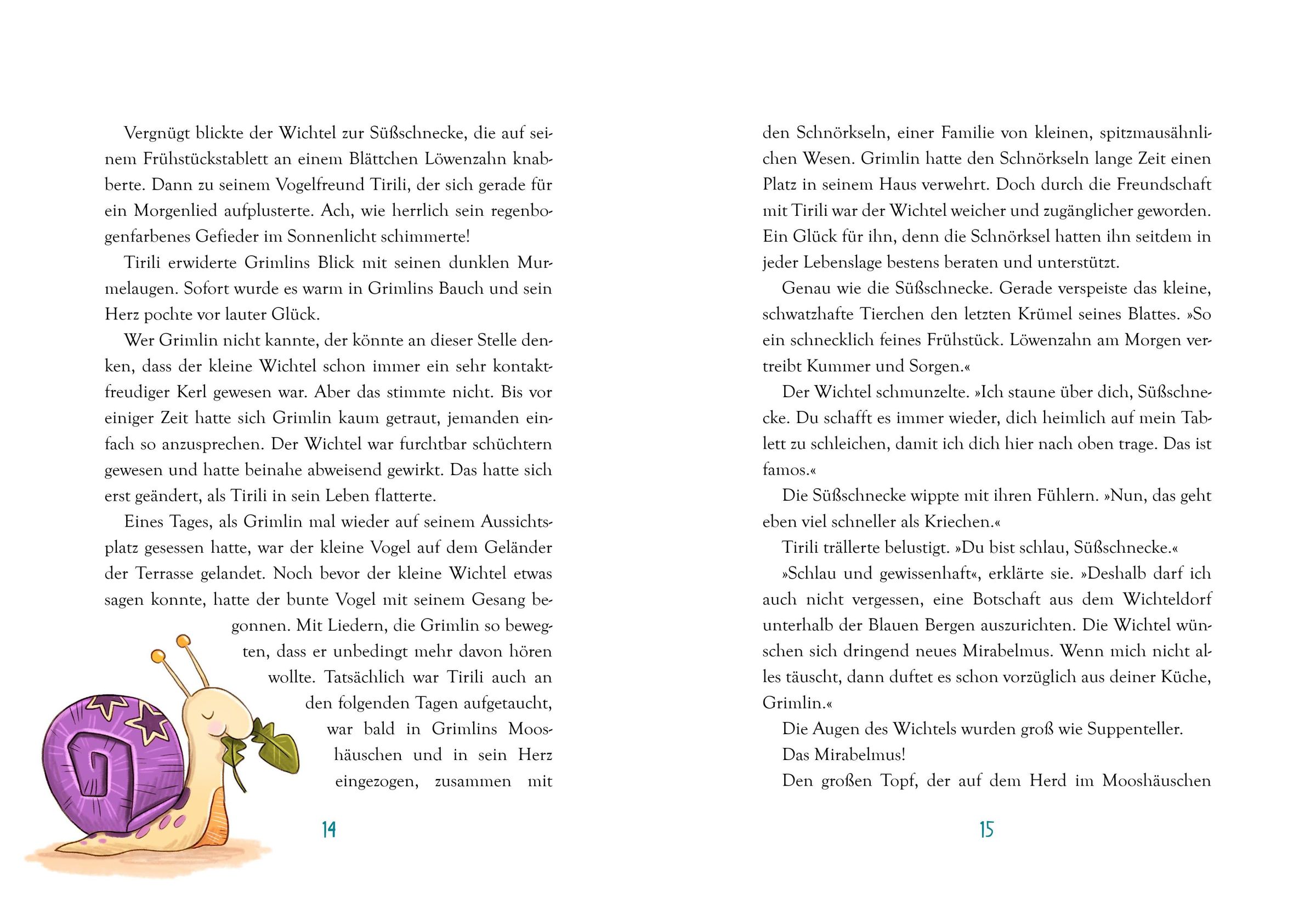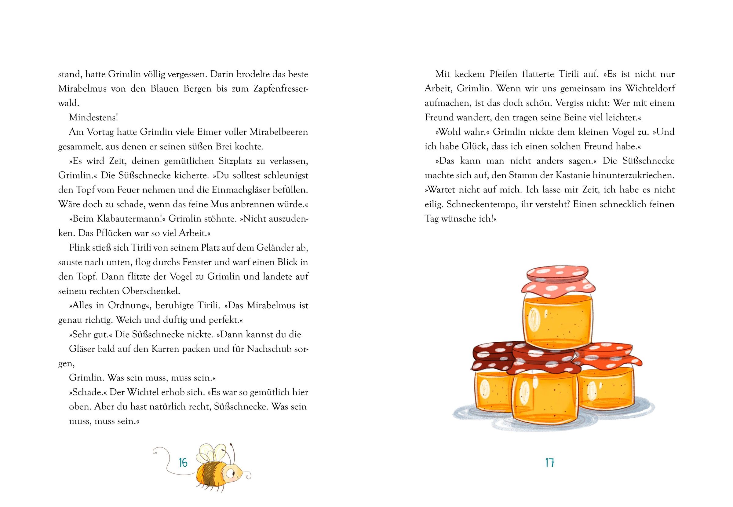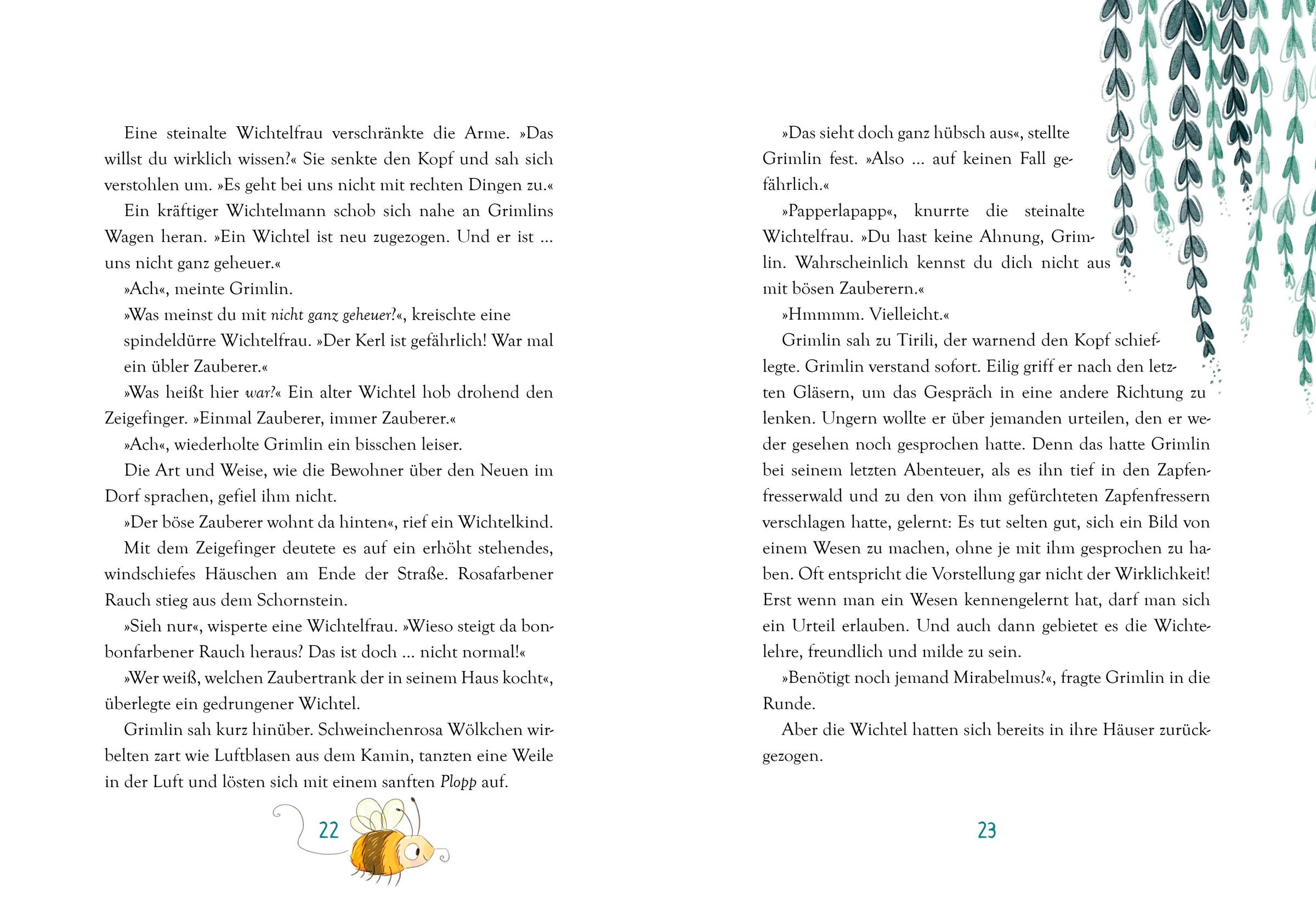 Grimlin liebt sein beschauliches Wichtelleben - mit Wurzeltee, seinen besten Freunden und selbst gekochtem Mirabelmus. Doch eines Tages zieht der geheimnisvolle Zauberer Tjelle ins Dorf, und die anderen Wichtel reagieren mit Misstrauen und Ablehnung. Als Tjelle plötzlich verschwindet, macht sich Grimlin auf die Suche - und trifft dafür sogar den gefürchteten Schnappzahn. Dabei erkennt er: Nicht alles ist so, wie es scheint. Der Schnappzahn entpuppt sich als wahrer Freund. Und Tjelle kann nicht nur köstlichen Brimbelkuchen backen, sondern auch die schönsten Luftblasen zaubern. Jetzt braucht es nur noch einen guten Plan, um die anderen Wichtel davon zu überzeugen ...