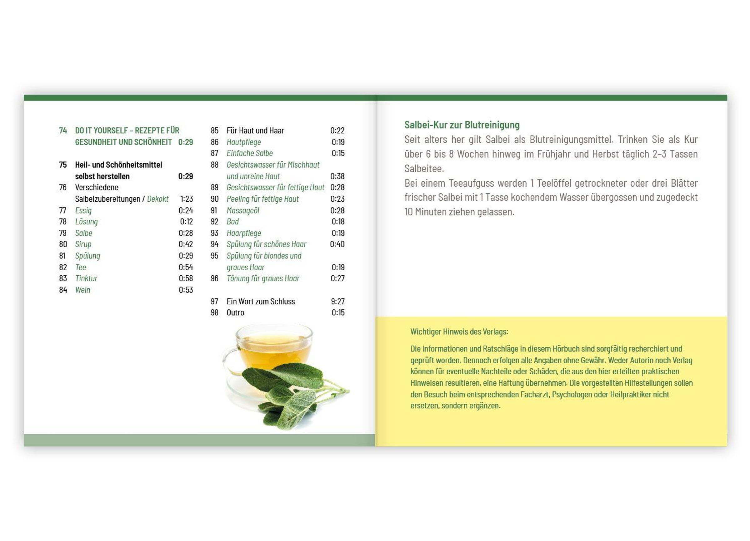 - Rezepte und Anwendungen bei Halsbeschwerden, Magen-Darm-Erkrankungen, Hautproblemen, für die Atemwege, zur Zahn- und Mundhygiene u. v. m.