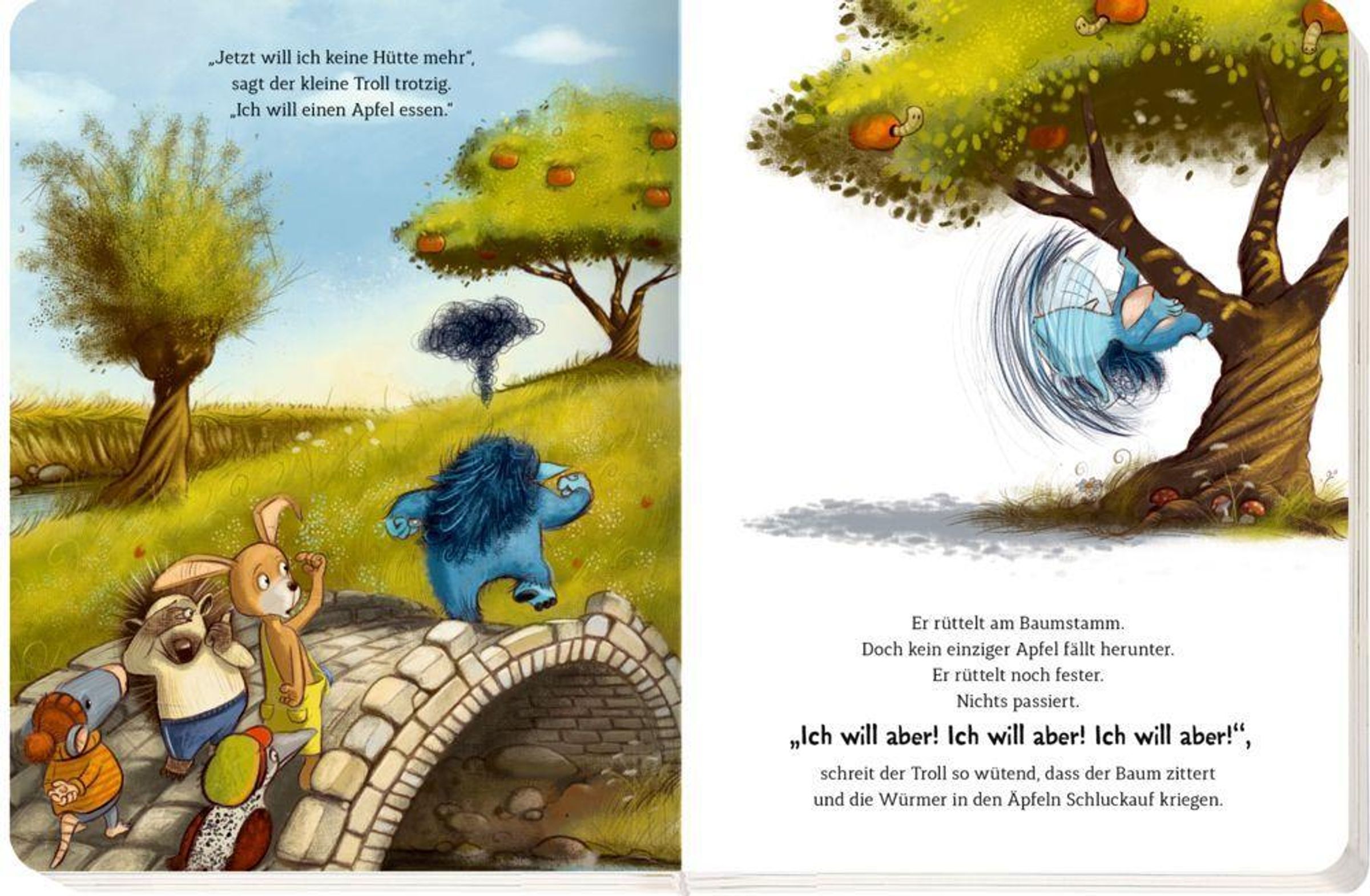 Es könnte alles so schön sein! Wäre da nicht die blöde Hütte, die immer wieder zusammenkracht, oder der dumme Baum, von dem einfach kein Apfel herunterfallen will ... Den Frust und die Wut, wenn Dinge nicht so laufen, wie man es sich wünscht, kennt jeder. Auch der Grolltroll. Unser Pappbilderbuch hilft, dem Groll spielerisch ein Ende zu setzen.