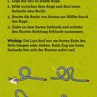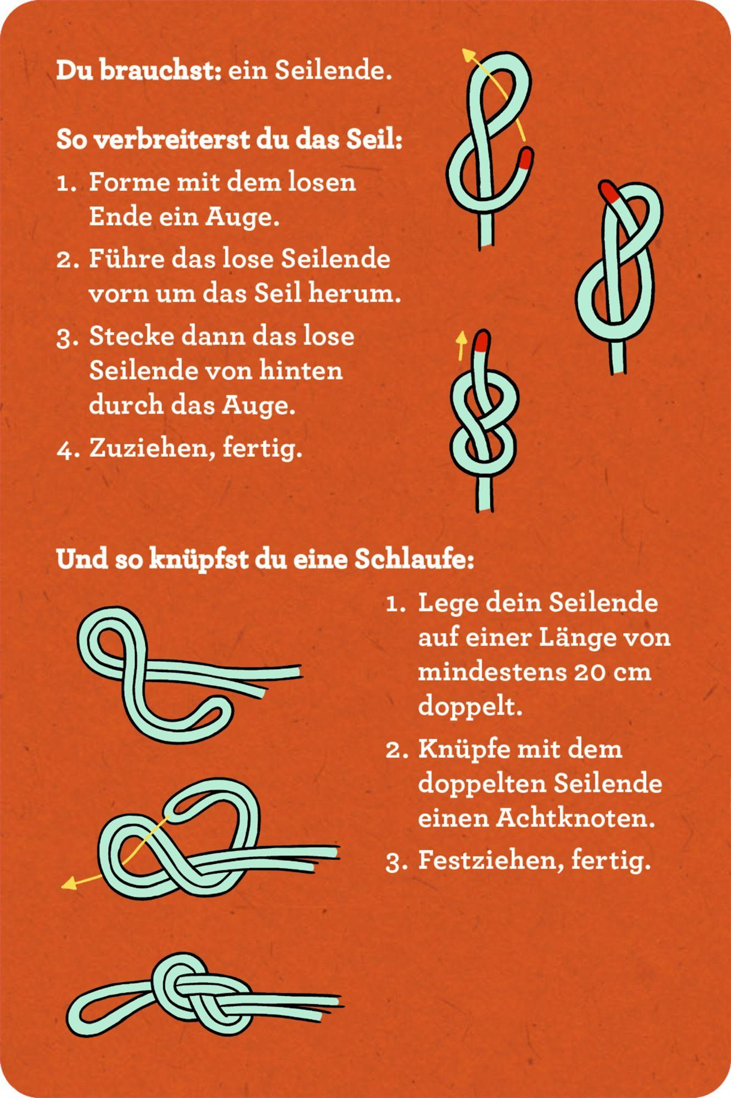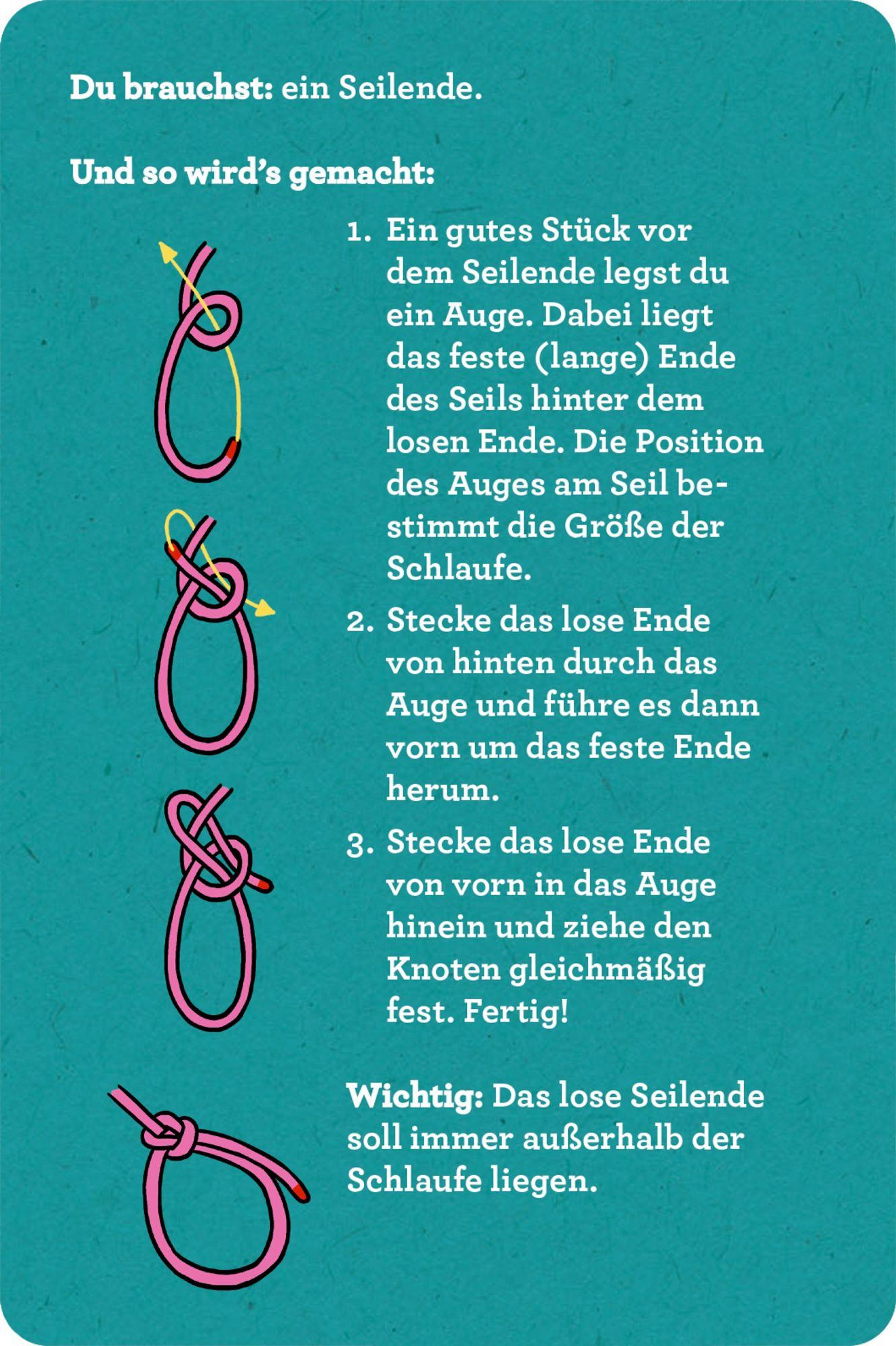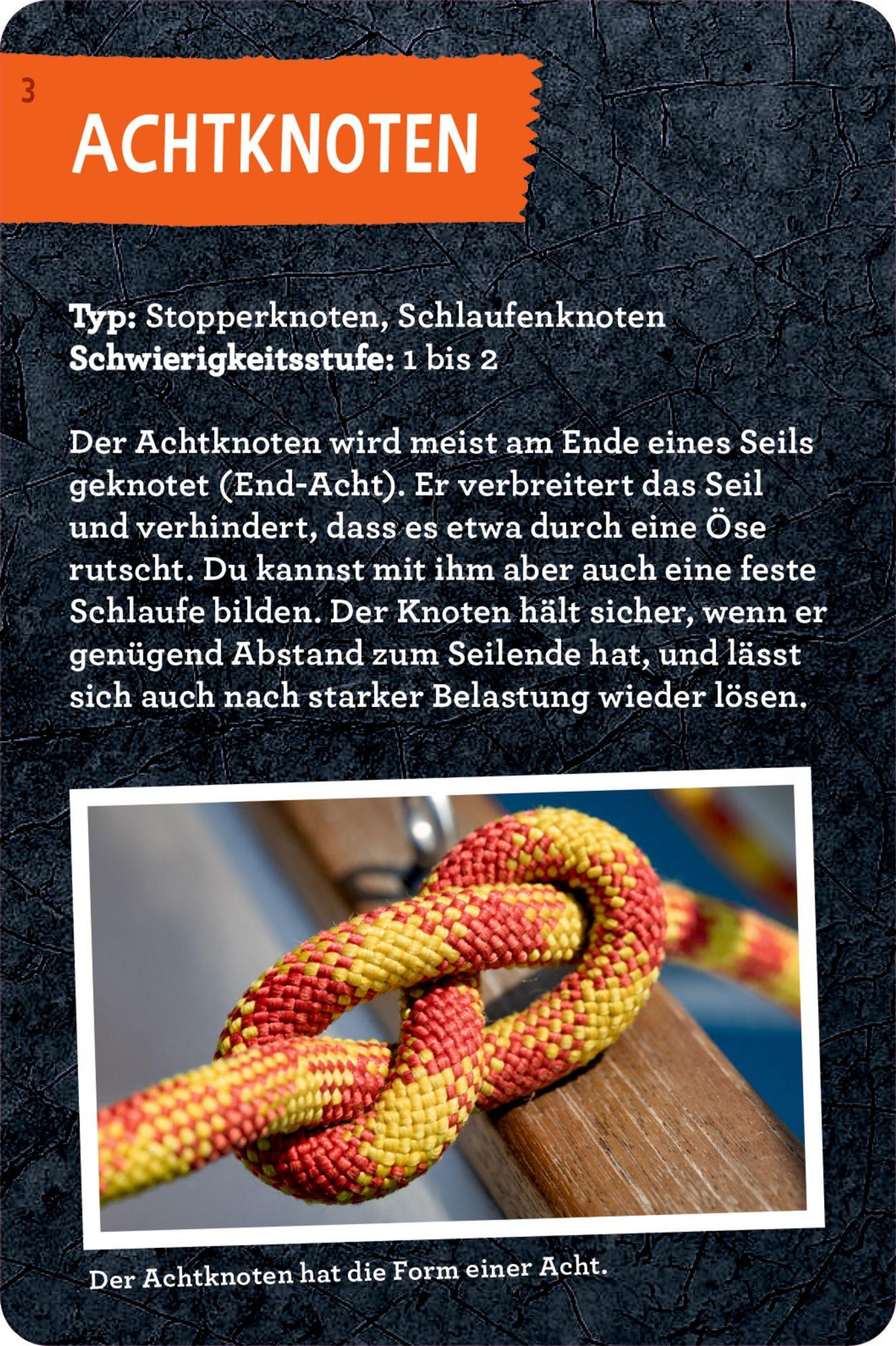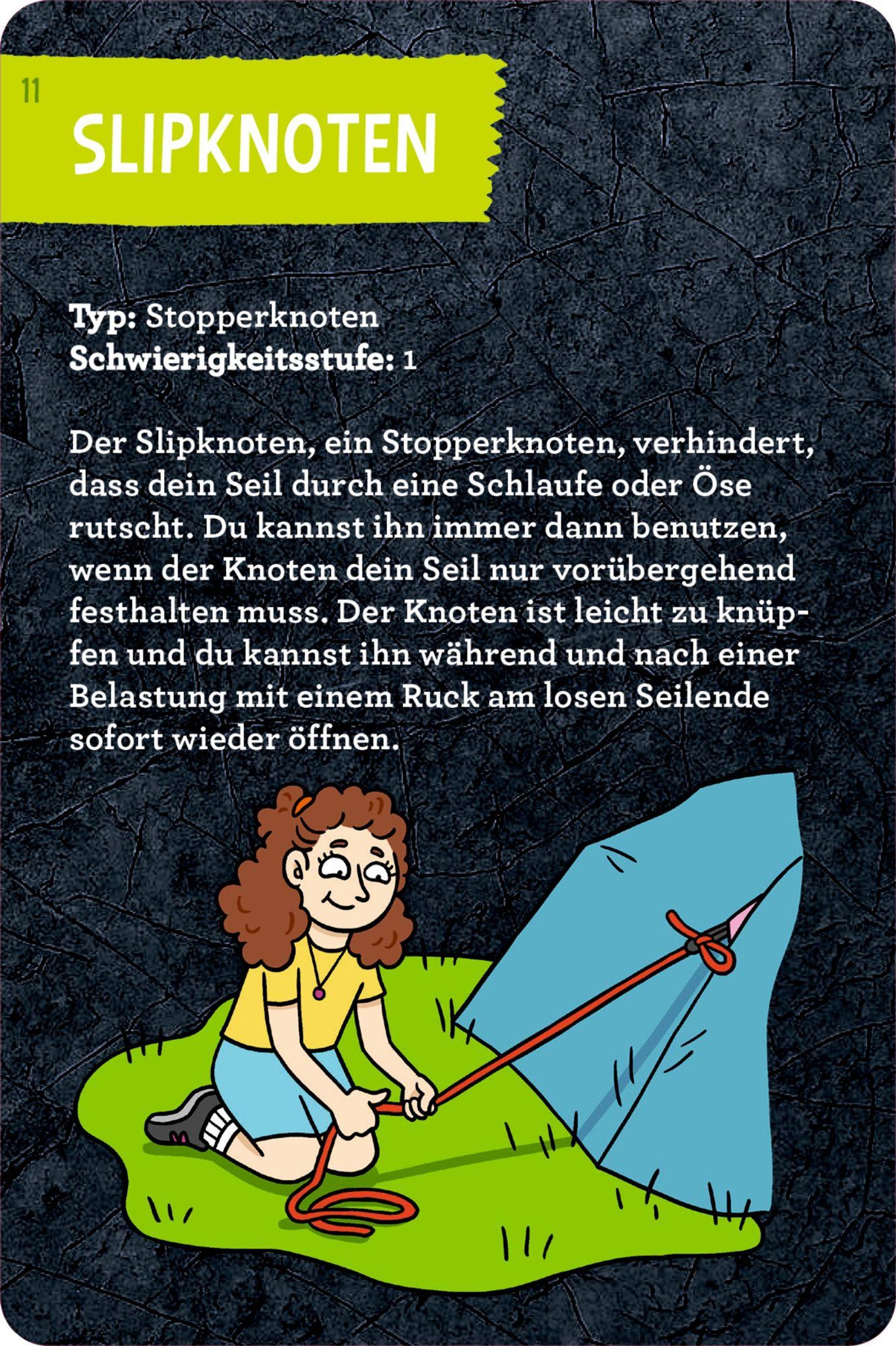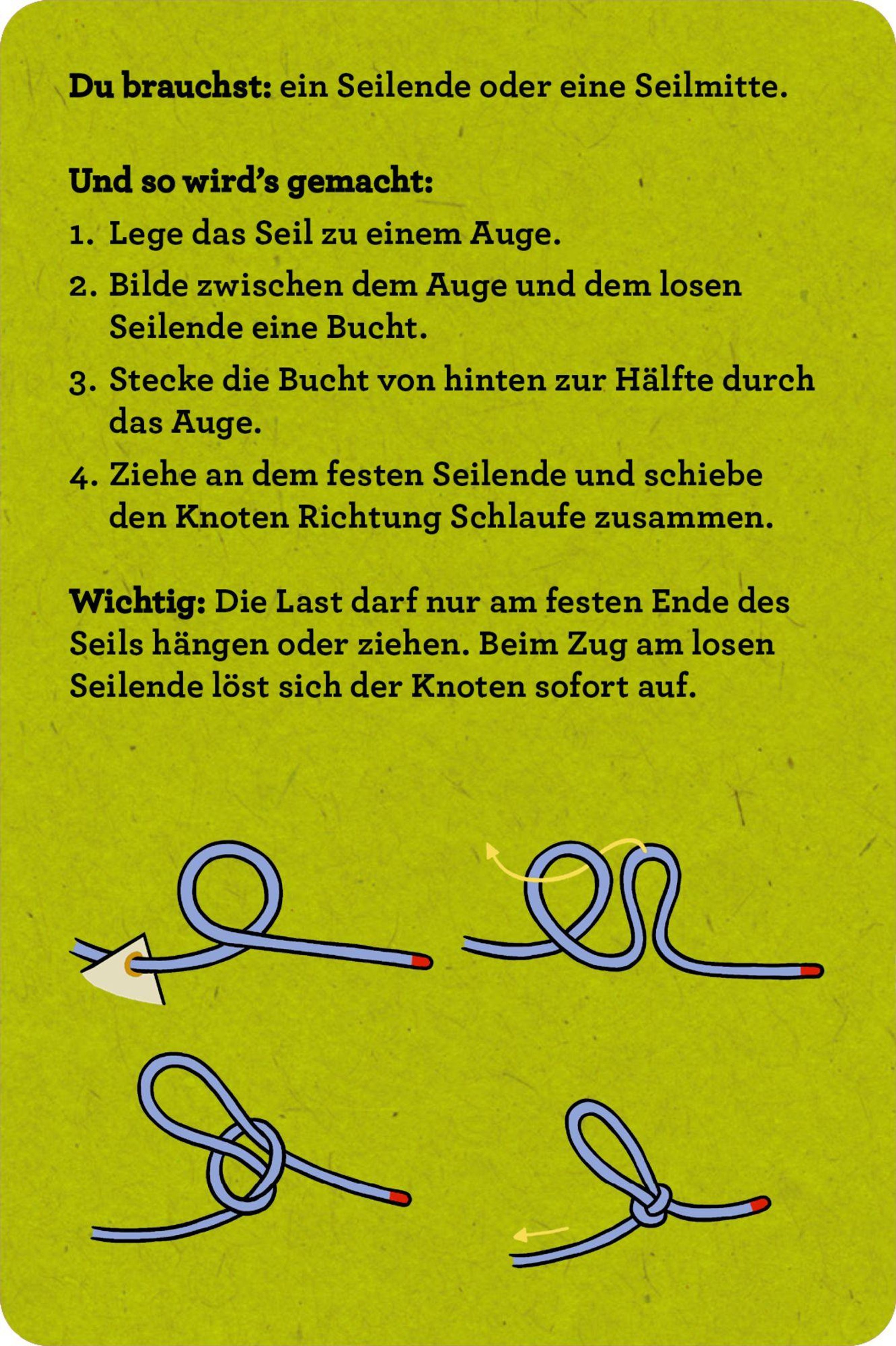 DAS Set für alle, die sich auf ihre Abenteuer in der Wildnis optimal vorbereiten wollen · Stabile Blechdose mit abwischbaren Karten · 30 Knoten mit anschaulichen Schritt-für-Schritt-Anleitungen · 2 farbige Übungsseile á 1 m Länge inklusive · Praktische Anwendungen für Outdoor und Alltag für Kinder ab 8 Jahren Dieses Set vermittelt Kindern grundlegende Knotentechniken, die bei Abenteuern im Freien vielseitig einsetzbar sind - beim Spielen und Zelten genauso wie beim Angeln oder Budenbau. Die anschaulichen Schritt-für-Schritt-Anleitungen und die beiliegenden Seile machen das Lernen unkompliziert und spannend. So können sich Abenteuerinnen und Abenteurer ab 8 Jahren kindgerecht auf ihr Touren durch die Wildnis vorbereiten.