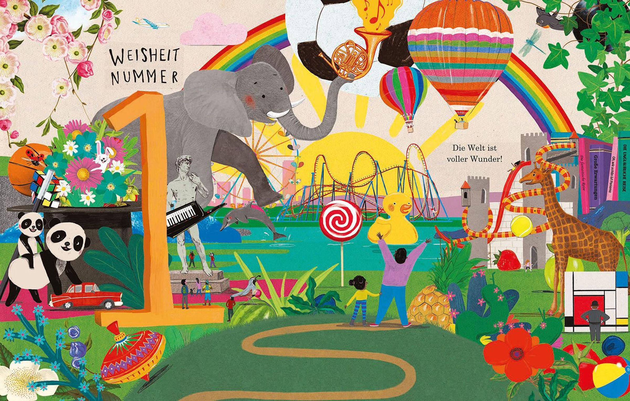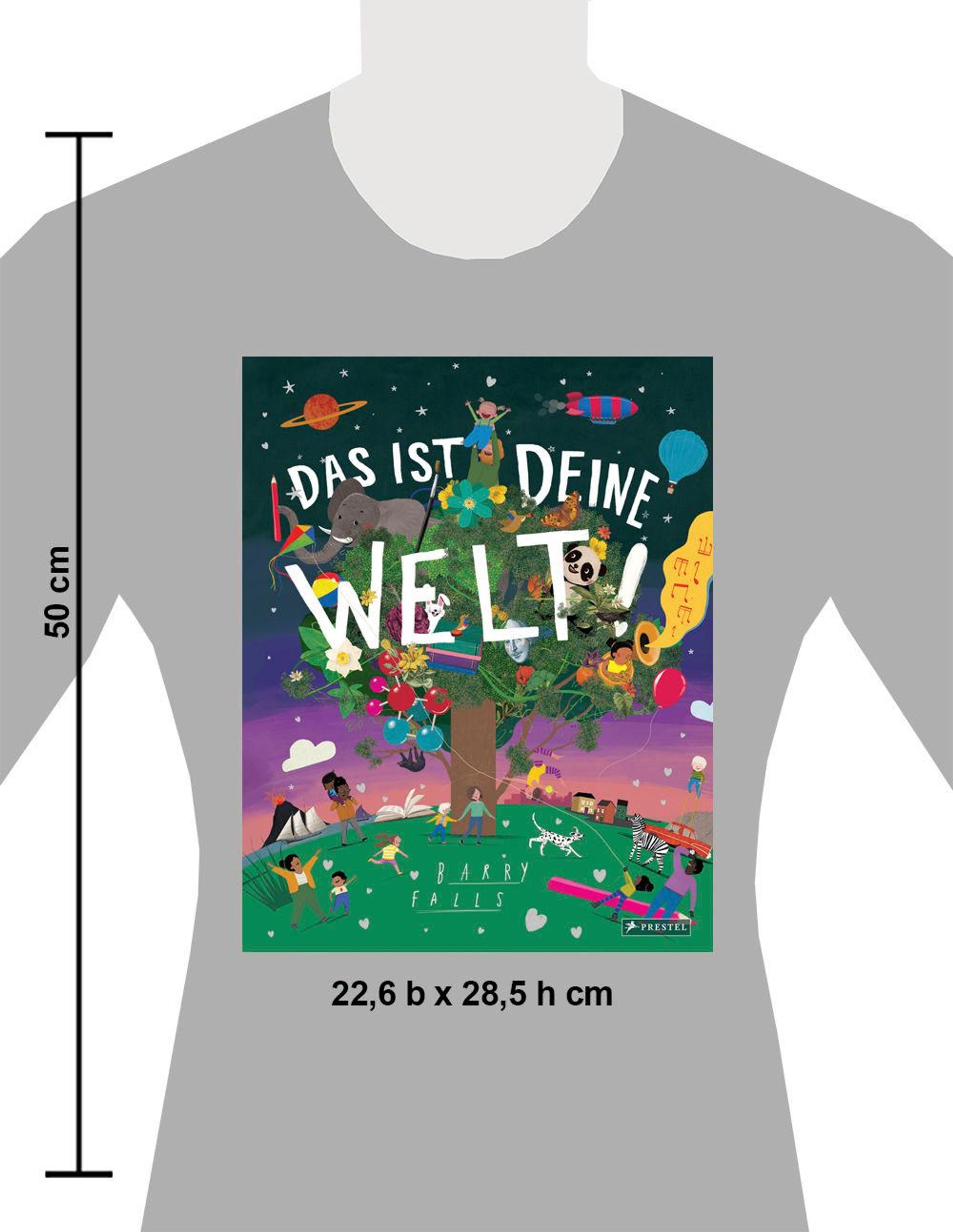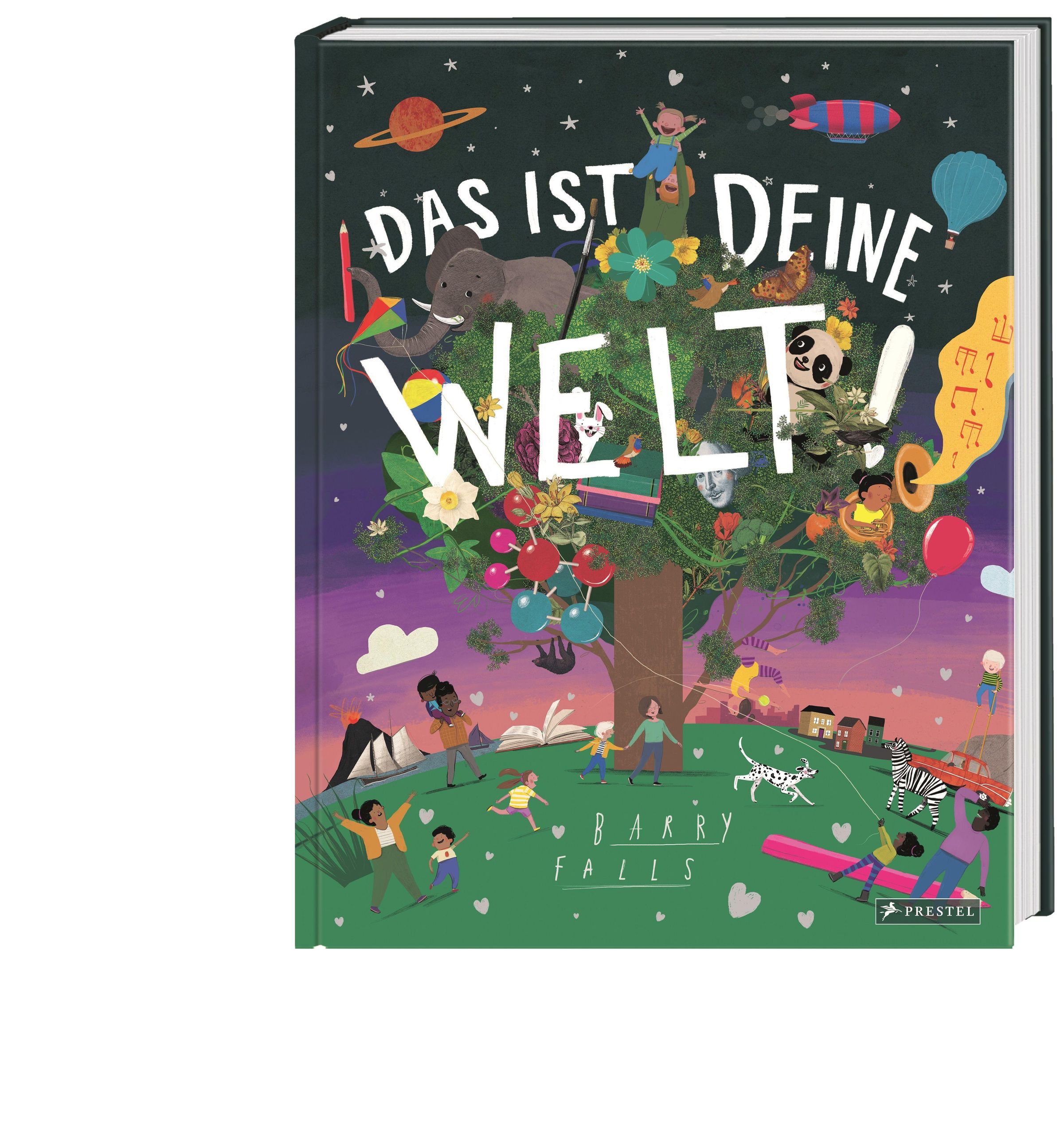 „DAS IST DEINE WELT! BARRY FALLS“ in bunten Buchstaben auf einem fantasievollen, farbenfrohen Baum mit Tieren und Menschen., Buch