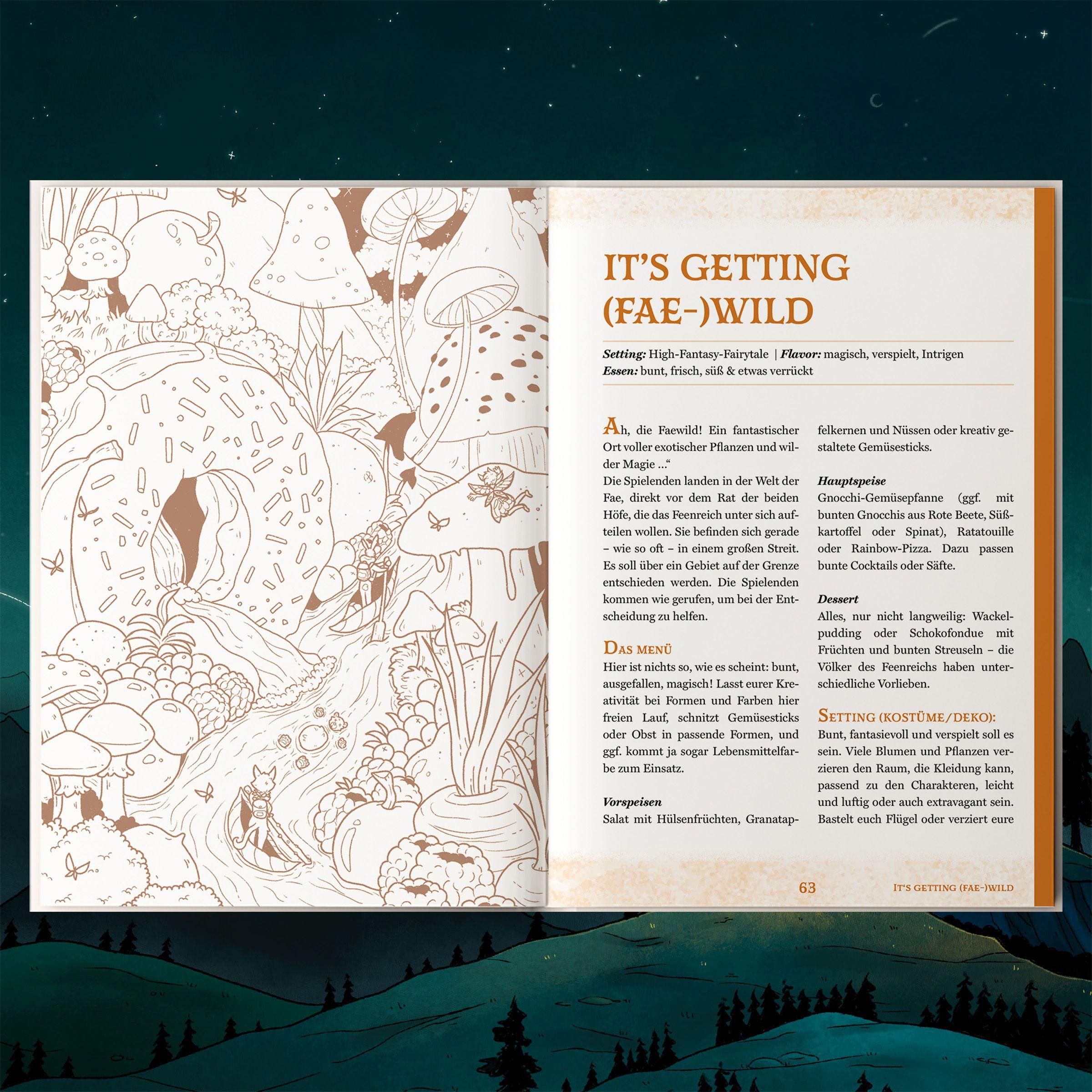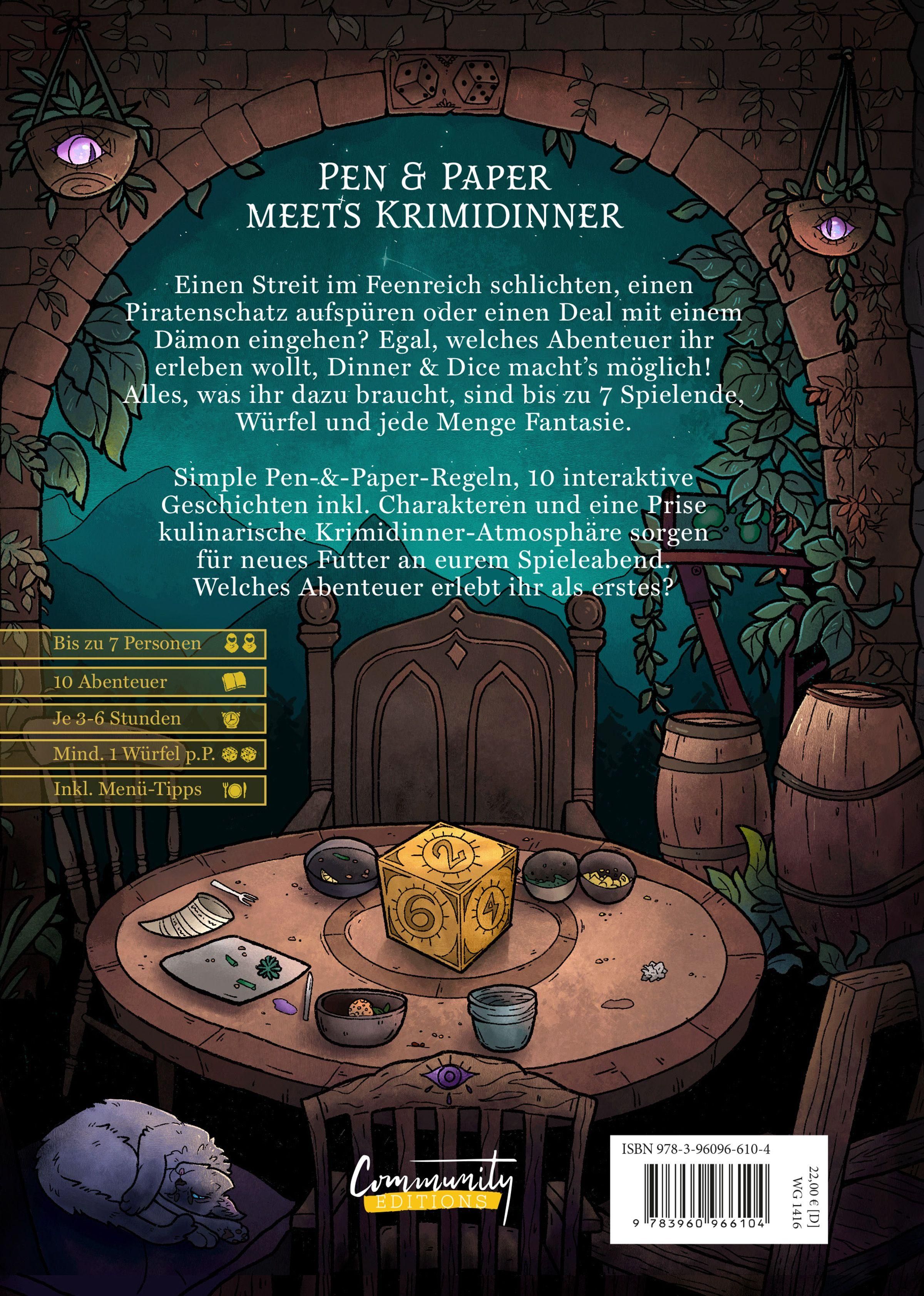 Ein kleines Dorf vor einer uralten Bedrohung retten, auf einem Maskenball eine königliche Intrige aufdecken oder doch lieber den wertvollsten Piratenschatz der sieben Weltmeere bergen? Egal in welche Rolle ihr schlüpfen wollt, 'Dinner & Dice' macht's möglich. Das erste Spielbuch, das kulinarische Krimidinner-Atmosphäre mit simplen Pen & Paper-Mechaniken vereint, verwandelt euren nächsten Spieleabend zu einem Event der Extraklasse - egal ob Pen & Paper-Noviz*in oder Krimidinner-Veteran*in.