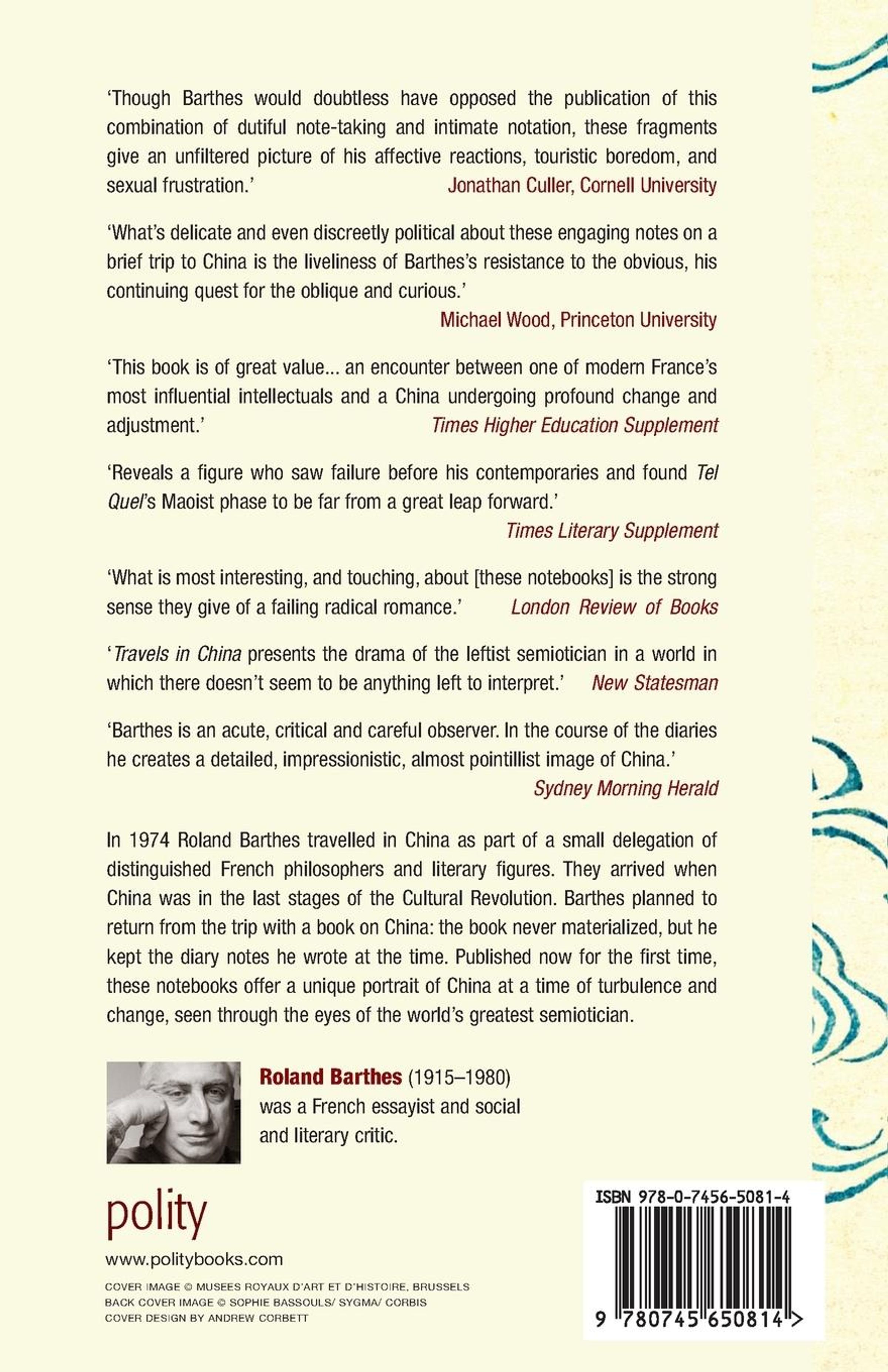 In 1974 Roland Barthes travelled in China as part of a small delegation of distinguished French philosophers and literary figures. They arrived in China just as the last stage of the Cultural Revolution was getting underway - the campaign to criticize Lin Biao and Confucius. While they were welcomed by writers and academics, the travelers were required to follow a pre-established itinerary, visiting factories and construction sites, frequenting shows and restaurants that were the mainstay of Western visitors to China in the 70s.
