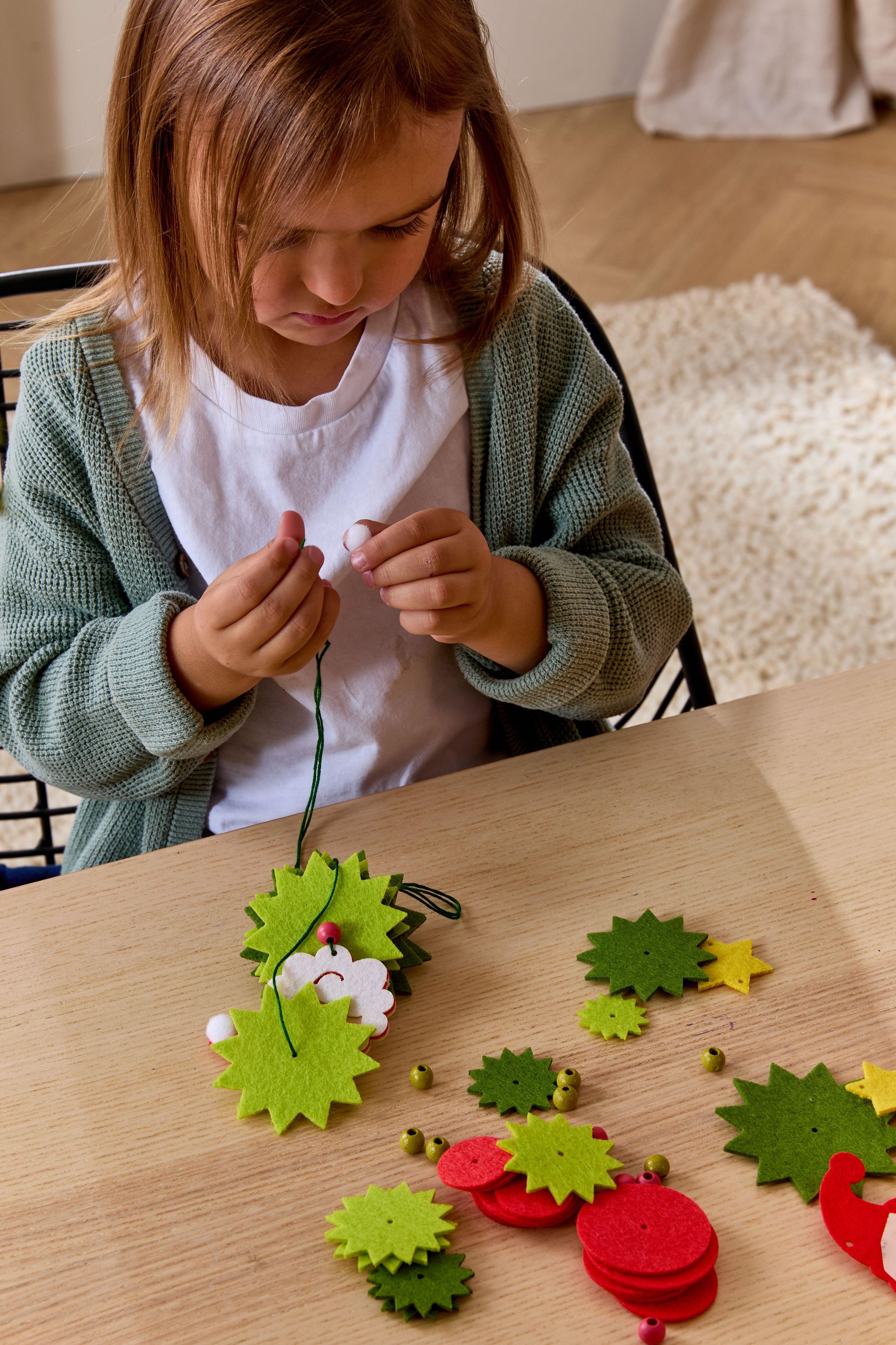 Der Weihnachtsmann ist da! Mit diesem Set entstehen zwei Weihnachtsmann-Filzgirlanden oder aber acht Filz-Anhäger. Die stabilen Filzteile werden einfach aufgefädelt und machen das Fädeln lernen kinderleicht. Die bunten Weihnachtsmann-Motive sorgen für festliche Stimmung und sind ein echter Blickfang am Fenster, an der Tür oder der Wand.
