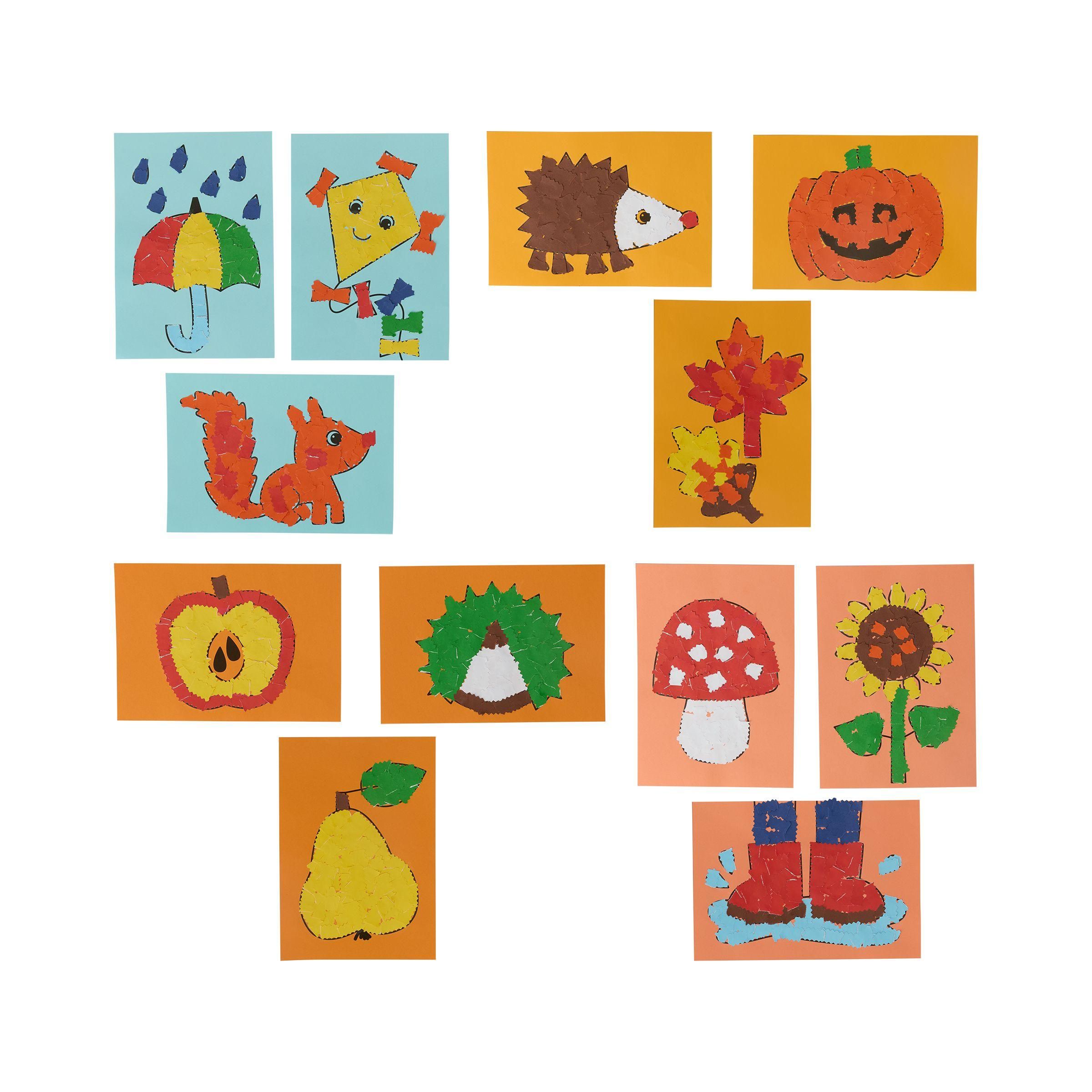 Nie war Kleben schöner! Die vorgezeichneten Motive warten darauf von kleinen Künstlern kunterbunt dekoriert zu werden: Einfach ein Motiv auswählen, Buntpapierstreifen aus dem Bogen lösen und in kleine Vierecke reißen. Mit einem Schwamm befeuchtet, lassen sich die Papierstückchen leicht aufkleben - ideal für erste Klebübungen mit Kindern. Das Set enthält 12 bunte Herbstbilder, perfekt als Herbstdeko fürs Kinderzimmer oder zum Verschenken!