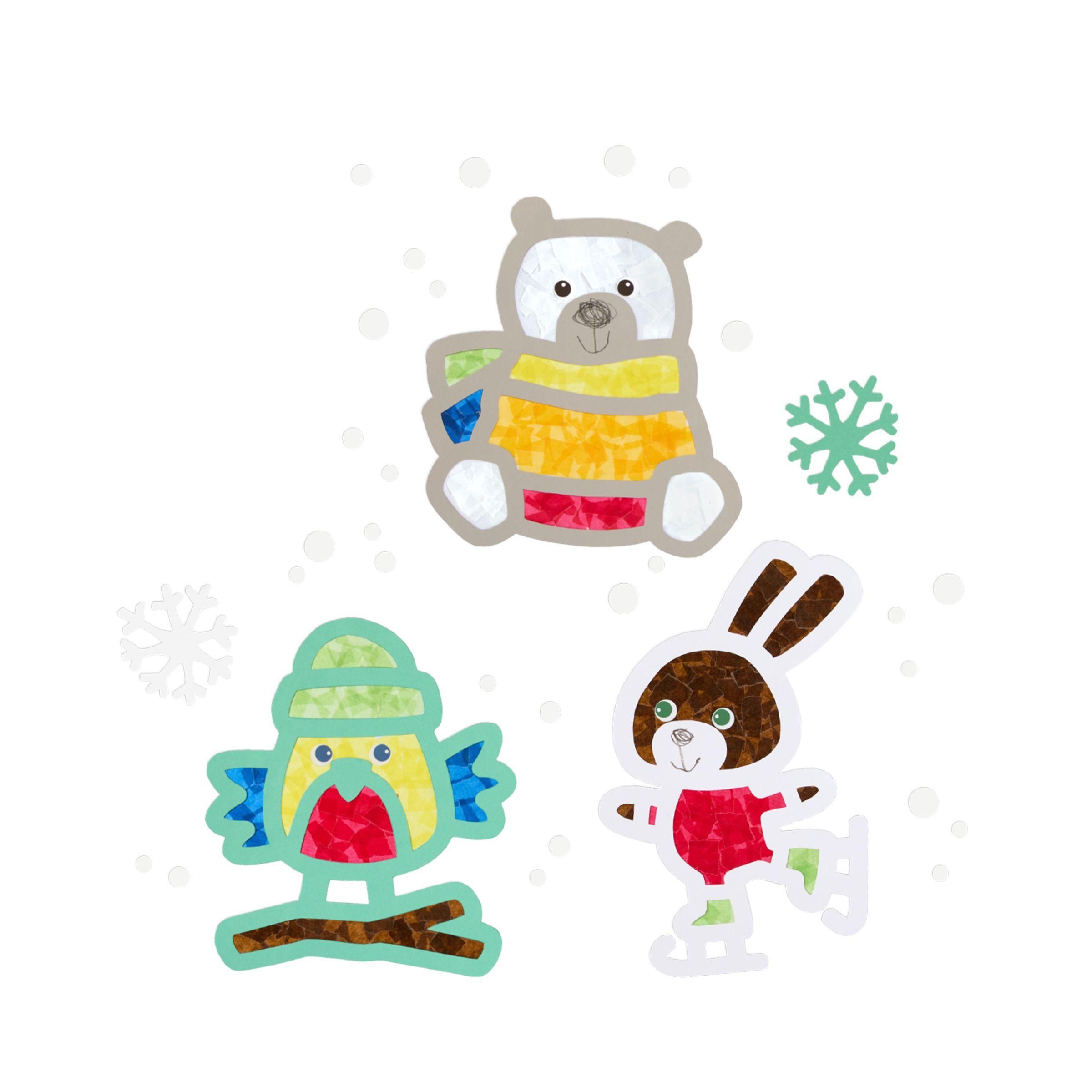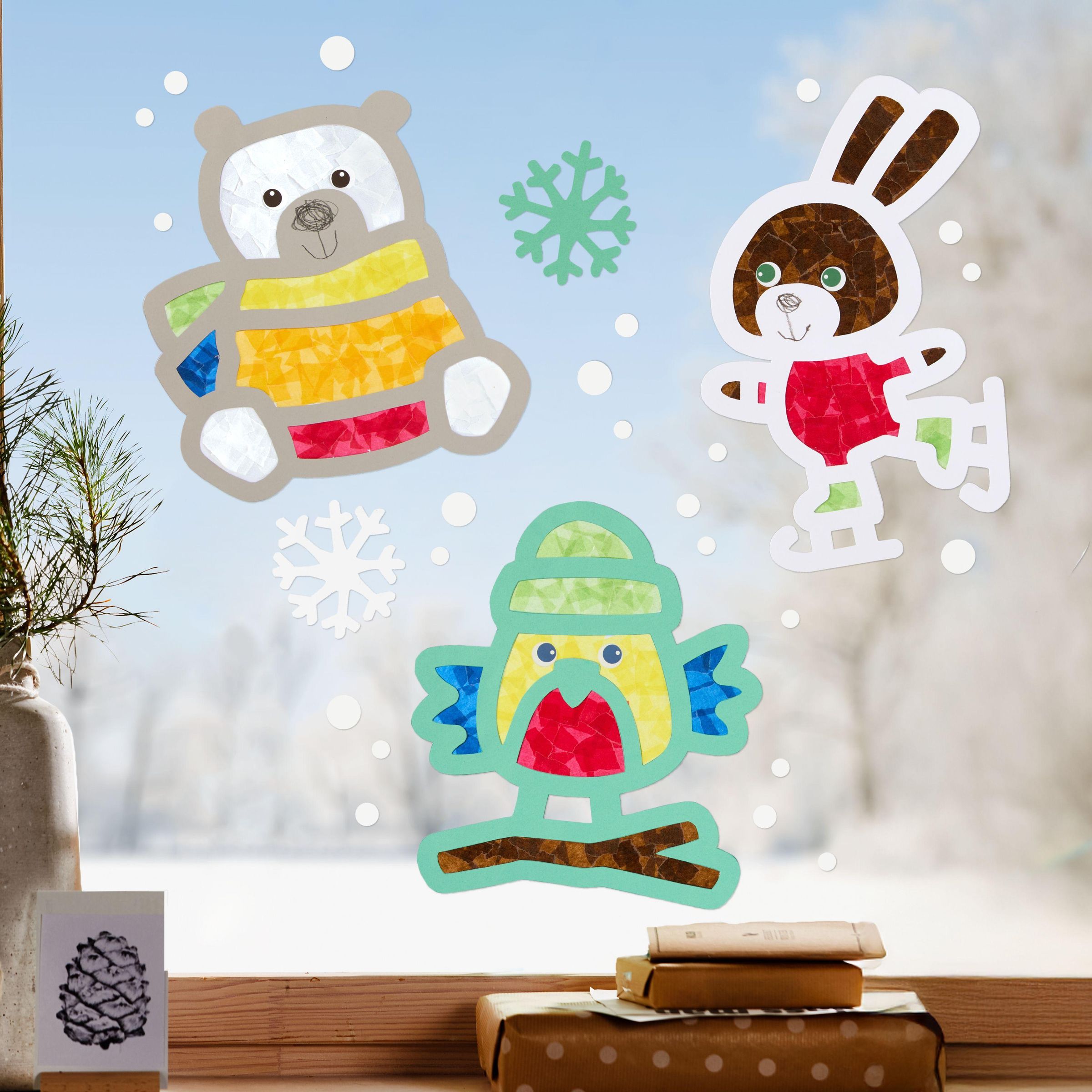 Winterlicher Bastelspaß für die Kleinsten! Mit diesem Bastelset gestalten Kinder drei niedliche Tiere im Schnee und viele Schneeflocken. Die vorgestanzten Teile werden mit Transparentpapierschnipseln dekoriert und alles zusammengeklebt - ideal zum Kleben lernen. So entsteht eine zauberhafte Winterlandschaft als Deko fürs Fenster oder Kinderzimmer - perfekt für die kalte Jahreszeit!