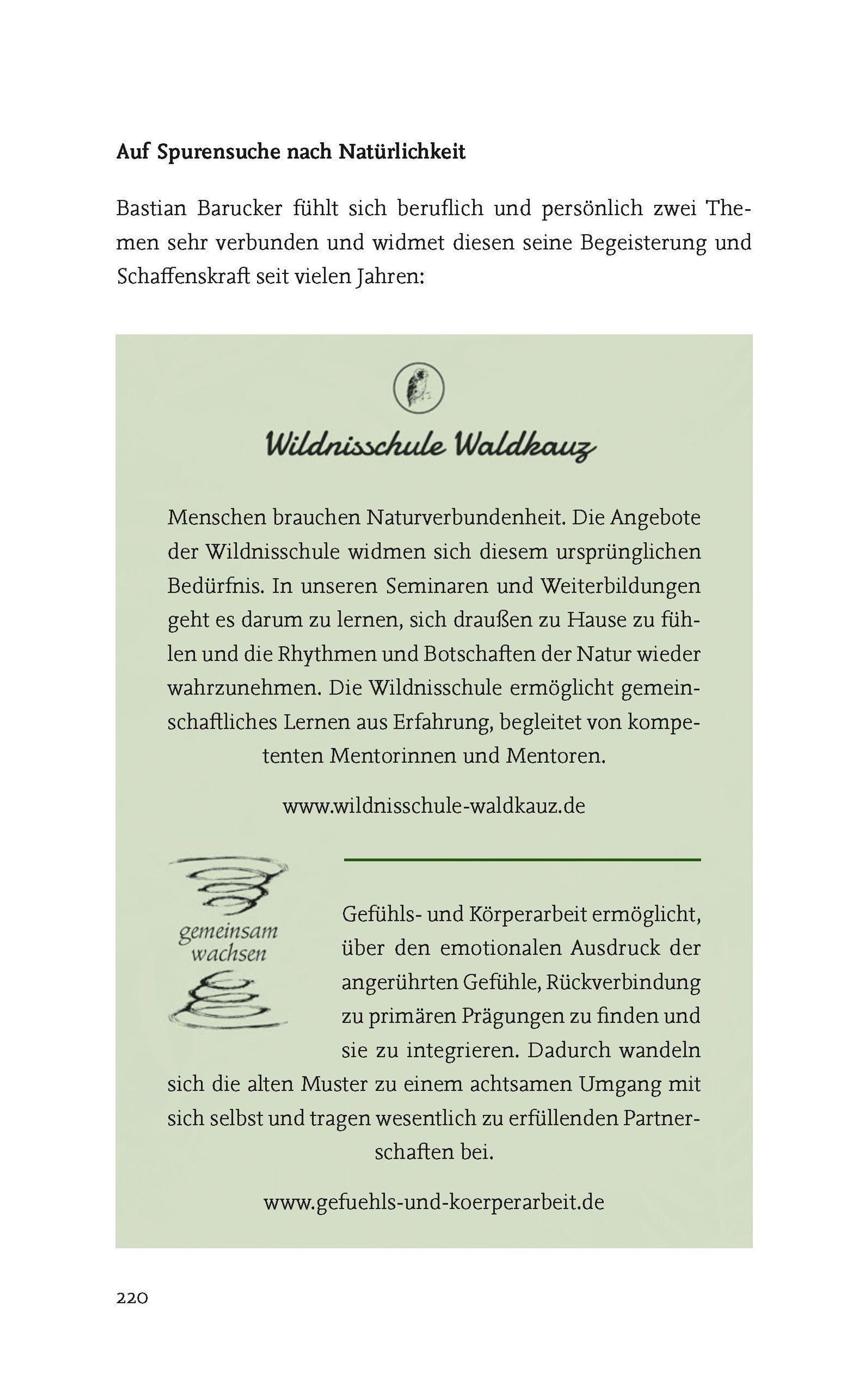 Mithilfe seiner Erfahrungen und Einsichten aus vielen Monaten des Wildnislebens und durch seine jahrelange Gefühls- und Körperarbeit hat Bastian tiefgehende Selbsterfahrungen gemacht und viele Menschen auf ihrem Weg begleitet. Genau wie Spuren im Wald, wurden Muster in der Gesellschaft sichtbar und ergaben eine Geschichte. Unzählige Beobachtungen und Begegnungen ließen ihn Zusammenhänge erkennen, die er jetzt gesammelt in diesem Buch erzählt.