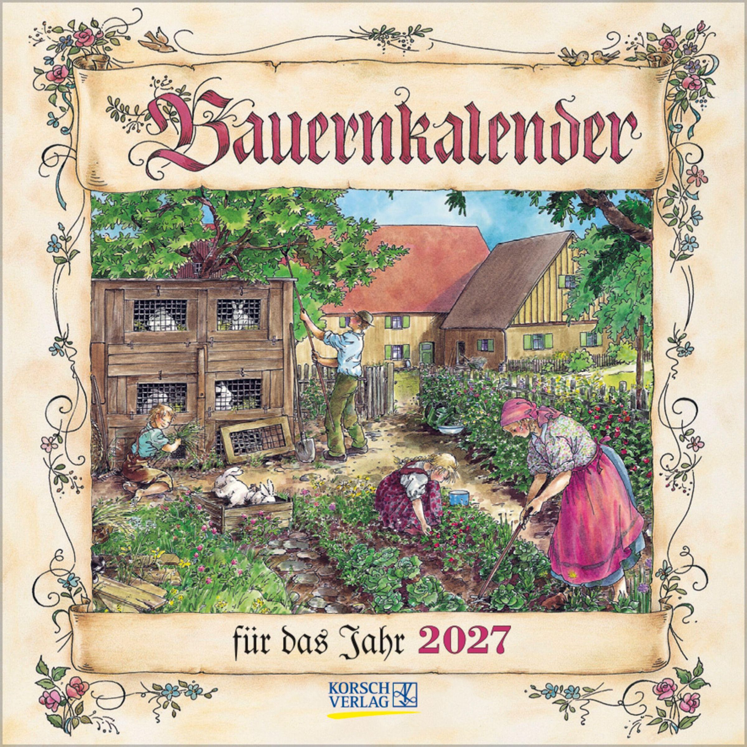 "Bauernkalender für das Jahr 2027." Illustration: Menschen arbeiten in einem Garten mit Tiergehegen und Blumen., Kalender