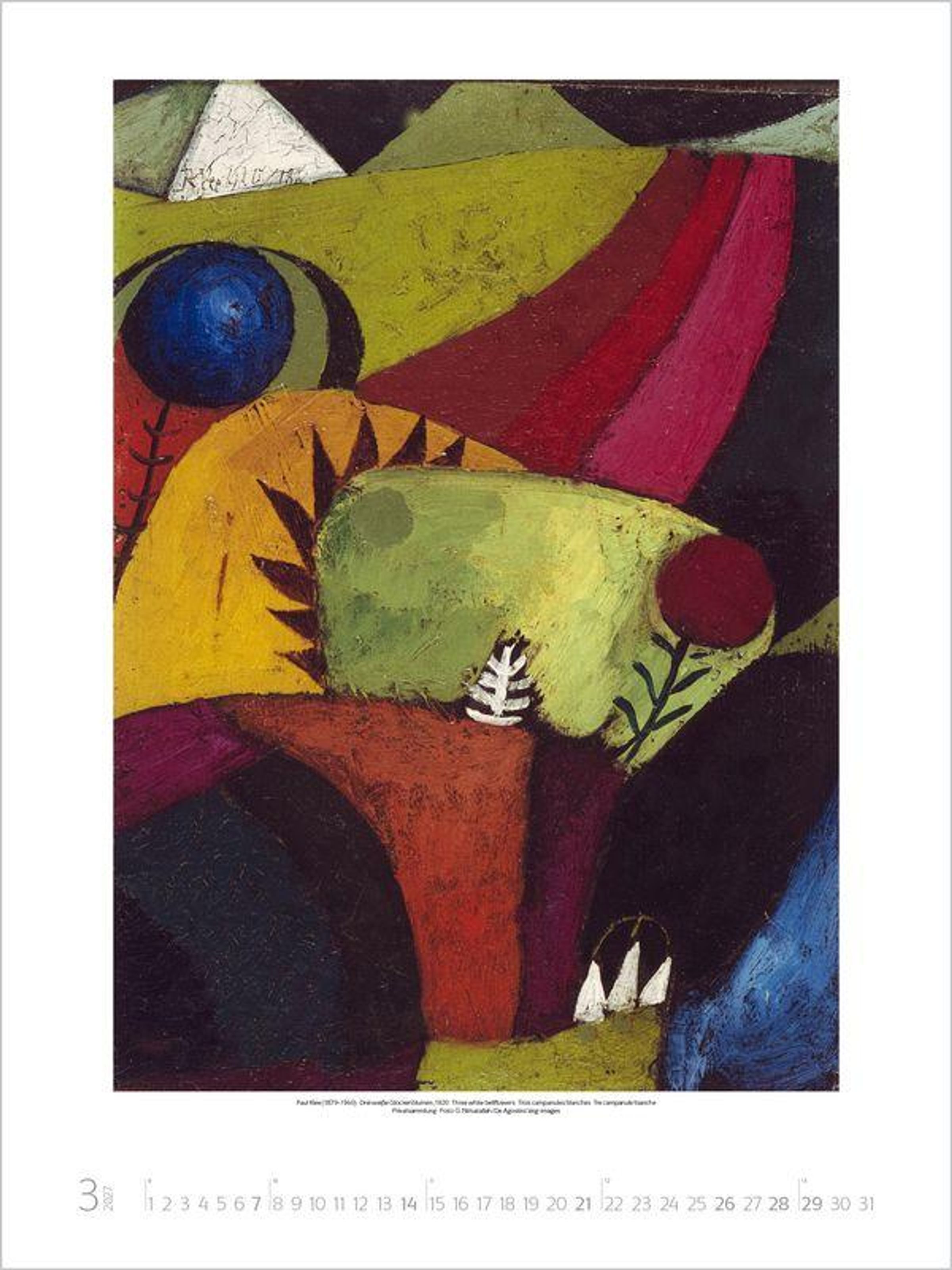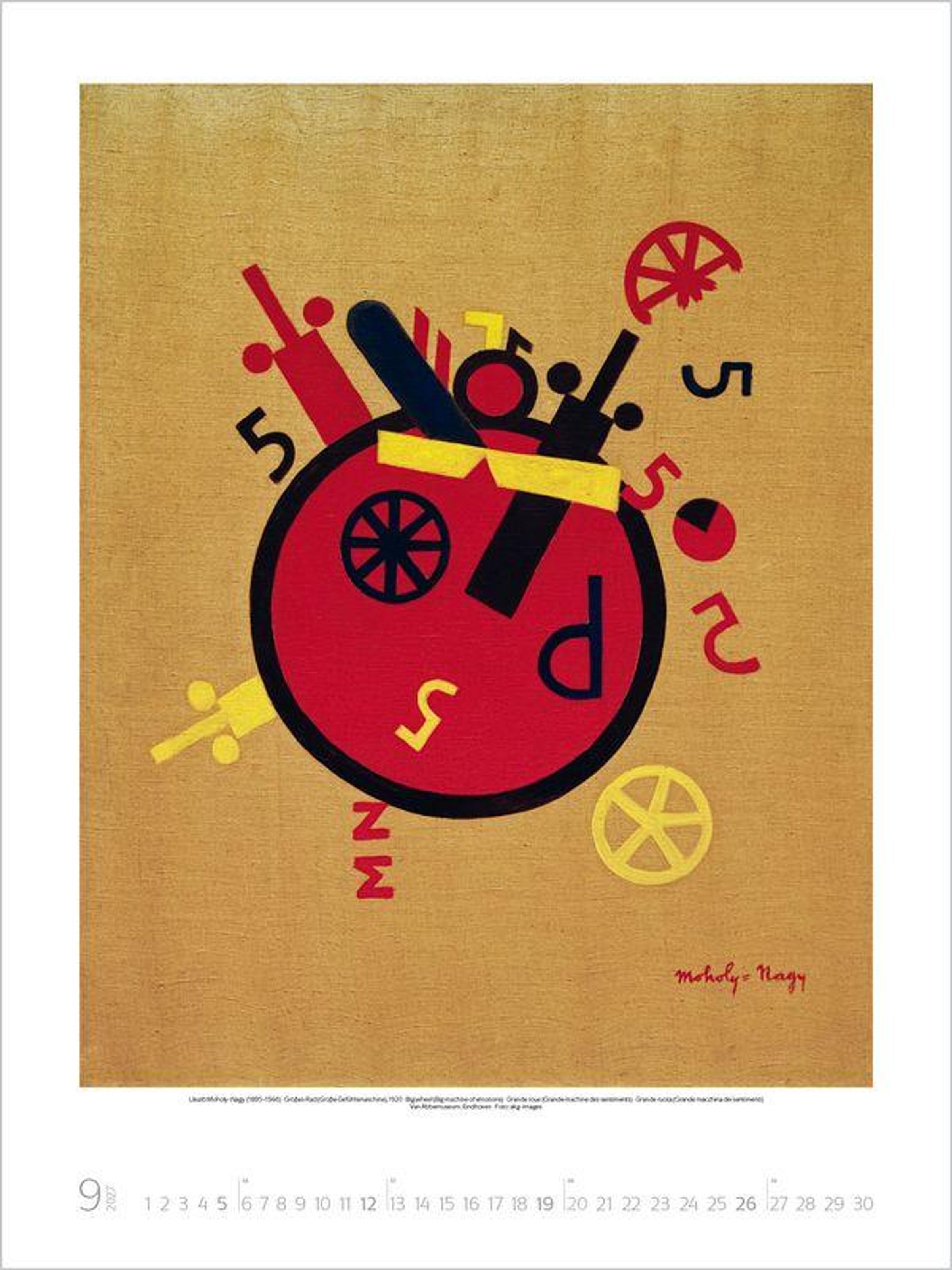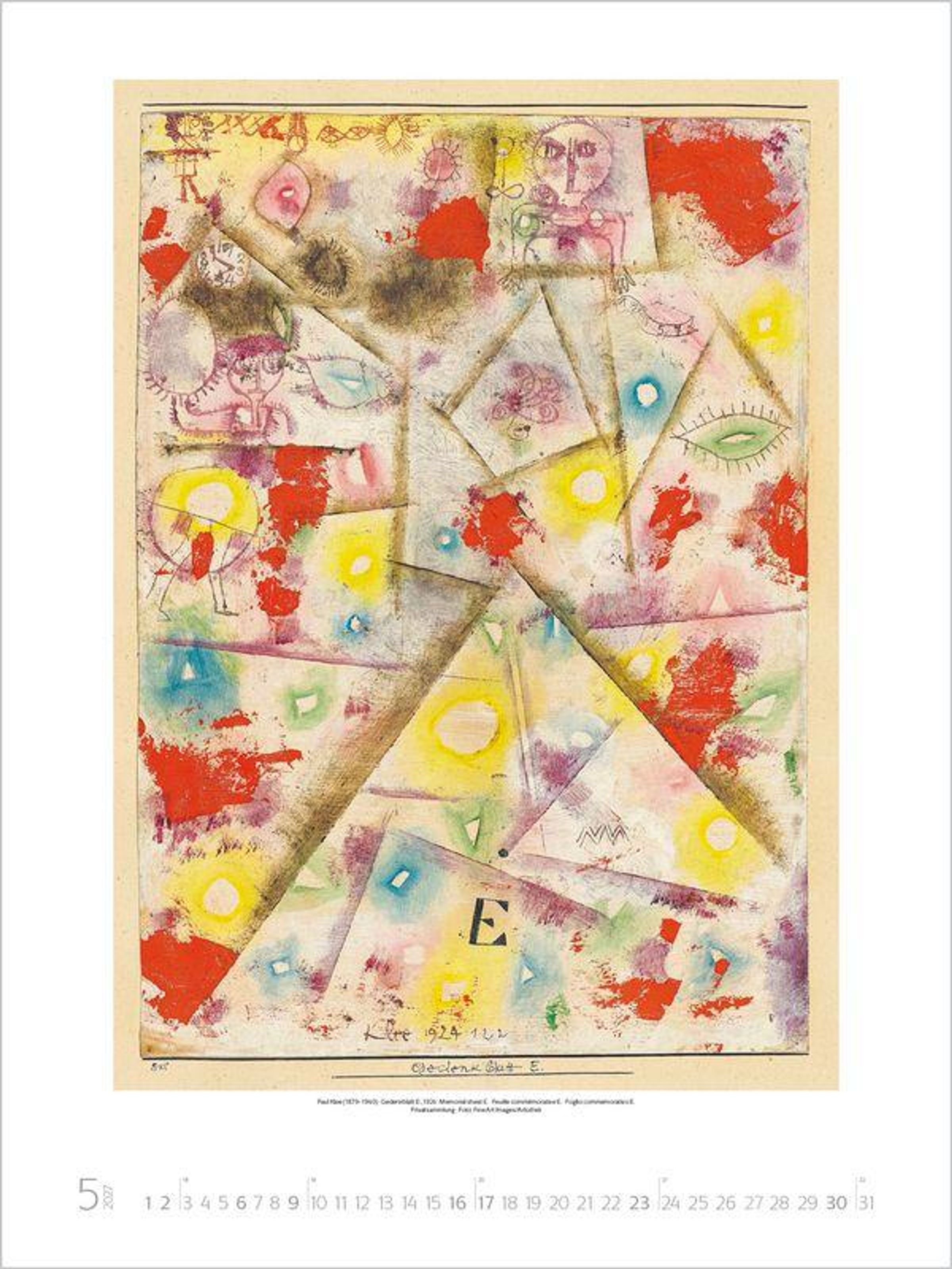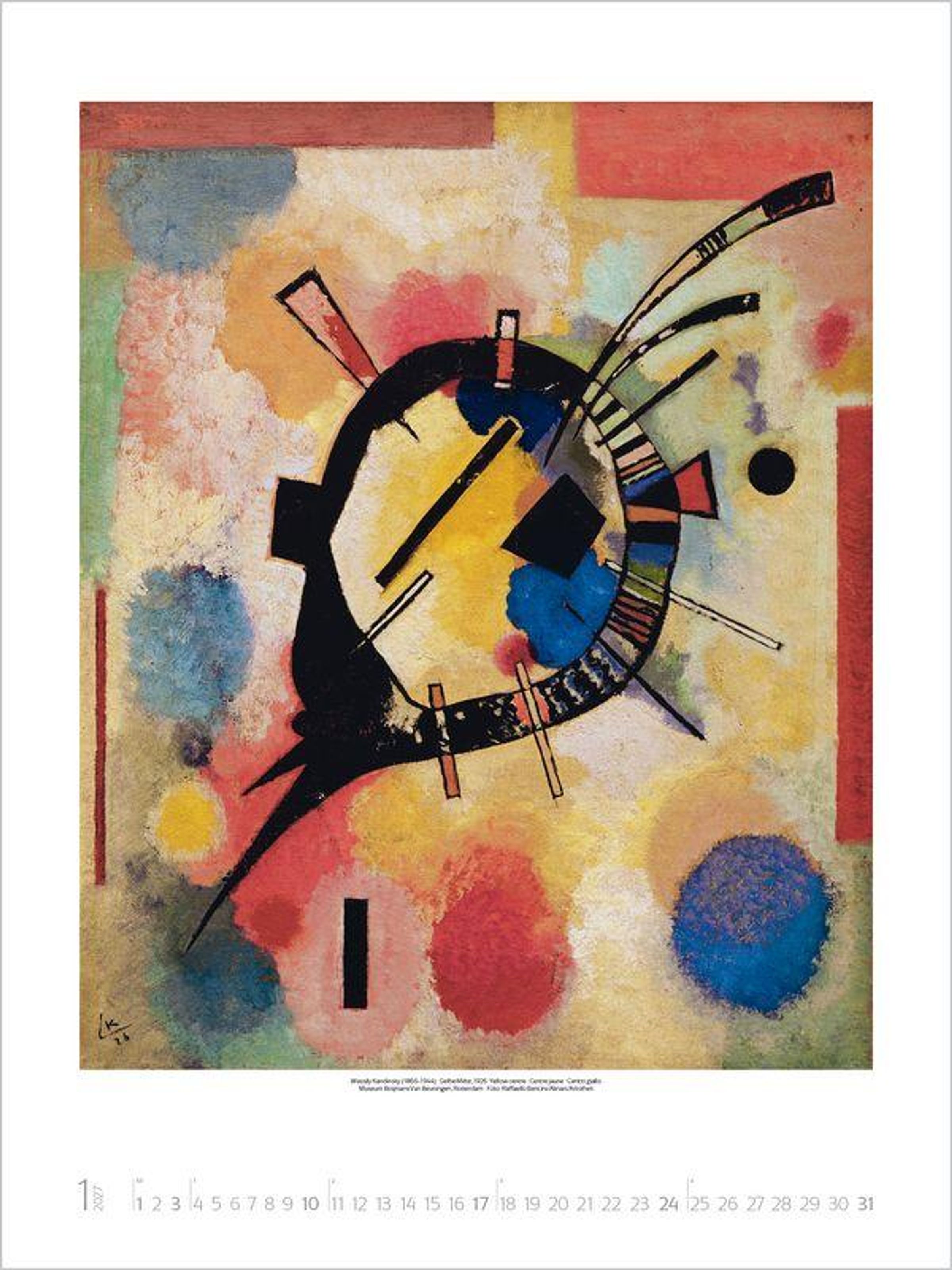 Klarheit, Sachlichkeit und Zweckmäßigkeit sowie das Zusammenwirken von Kunst und Industrie im Sinn umfassender Lebensgestaltung waren die Maximen dieses revolutionär neuen Kunstverständnisses. Der Kalender zeigt eine Auswahl der bekanntesten Werke großer Bauhaus-Künstler wie Klee, Kandinsky und Moholy-Nagy.