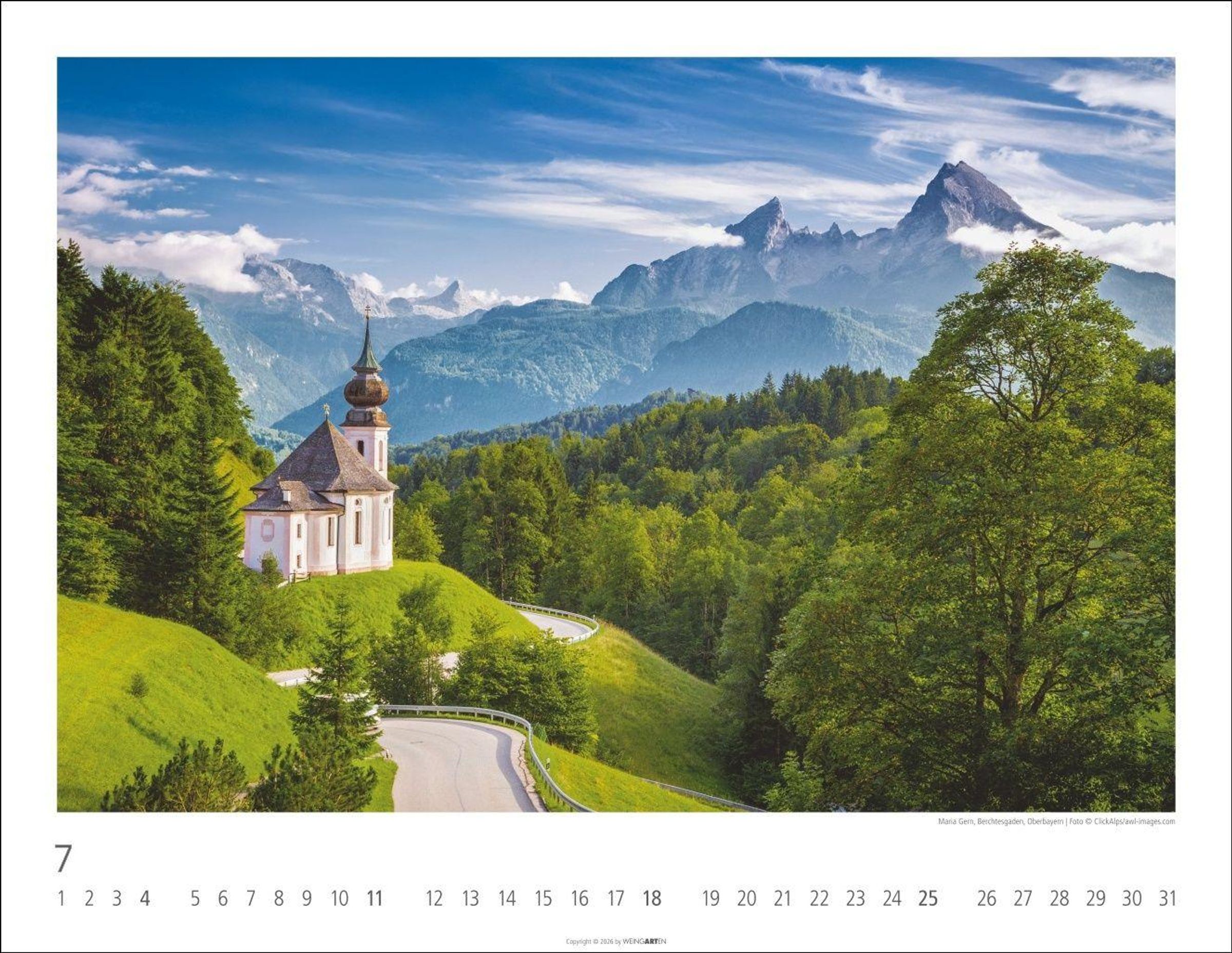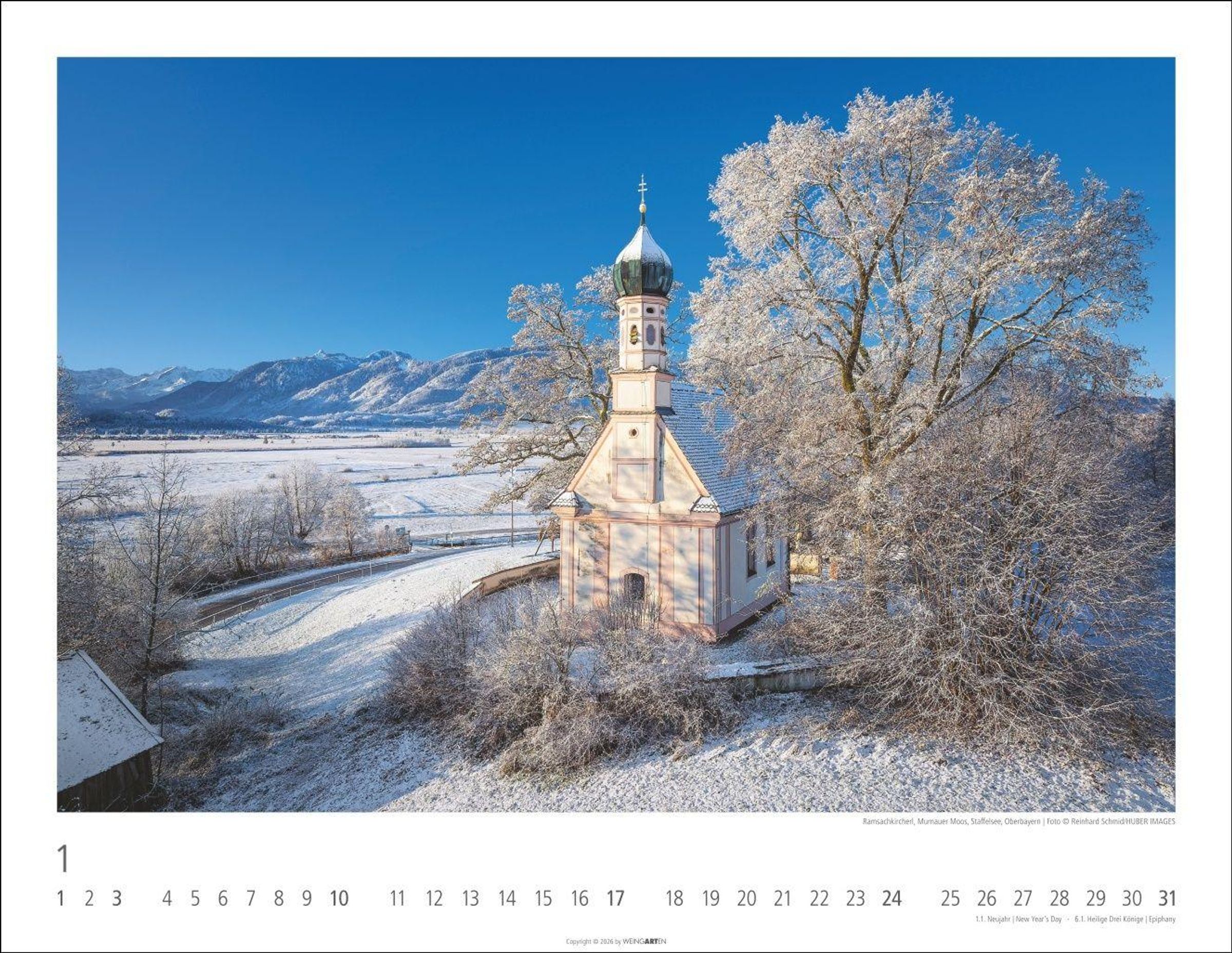 Ein Stück Bayern für zu Hause: der querformatige Wandkalender (44 x 34 cm) bietet jeden Monat einen neuen farbintensiven Ausblick auf die bayerische Natur und Kultur
